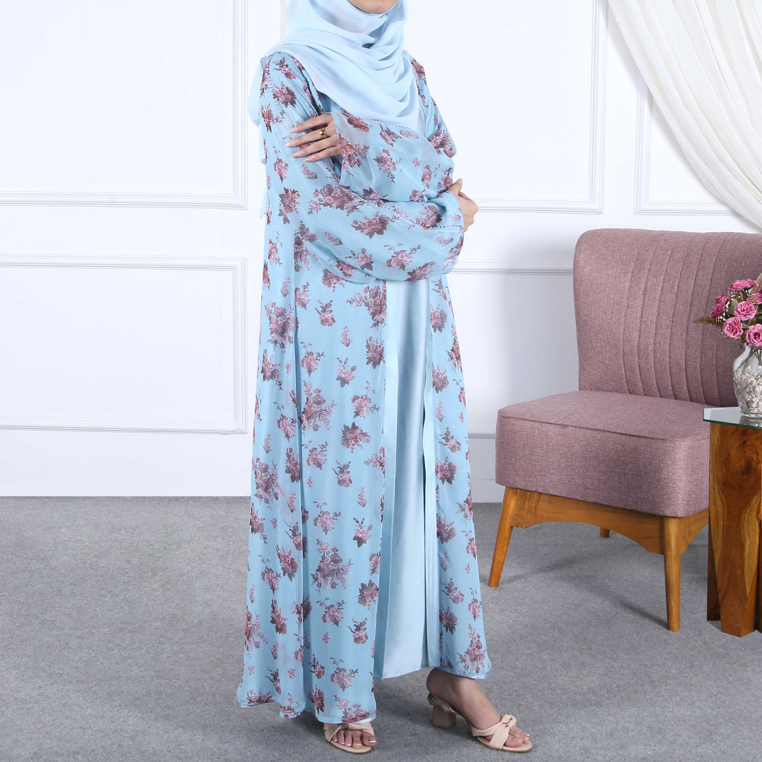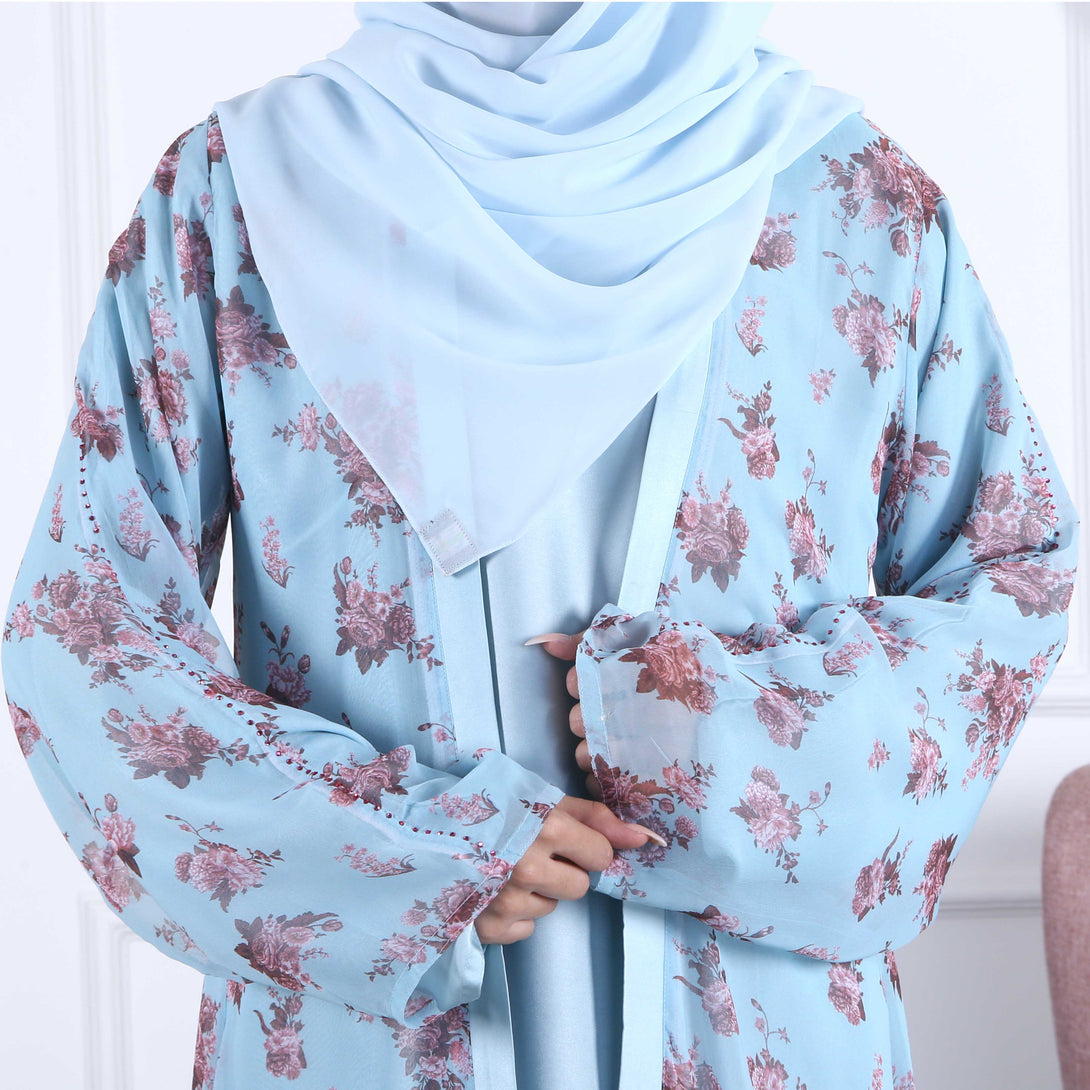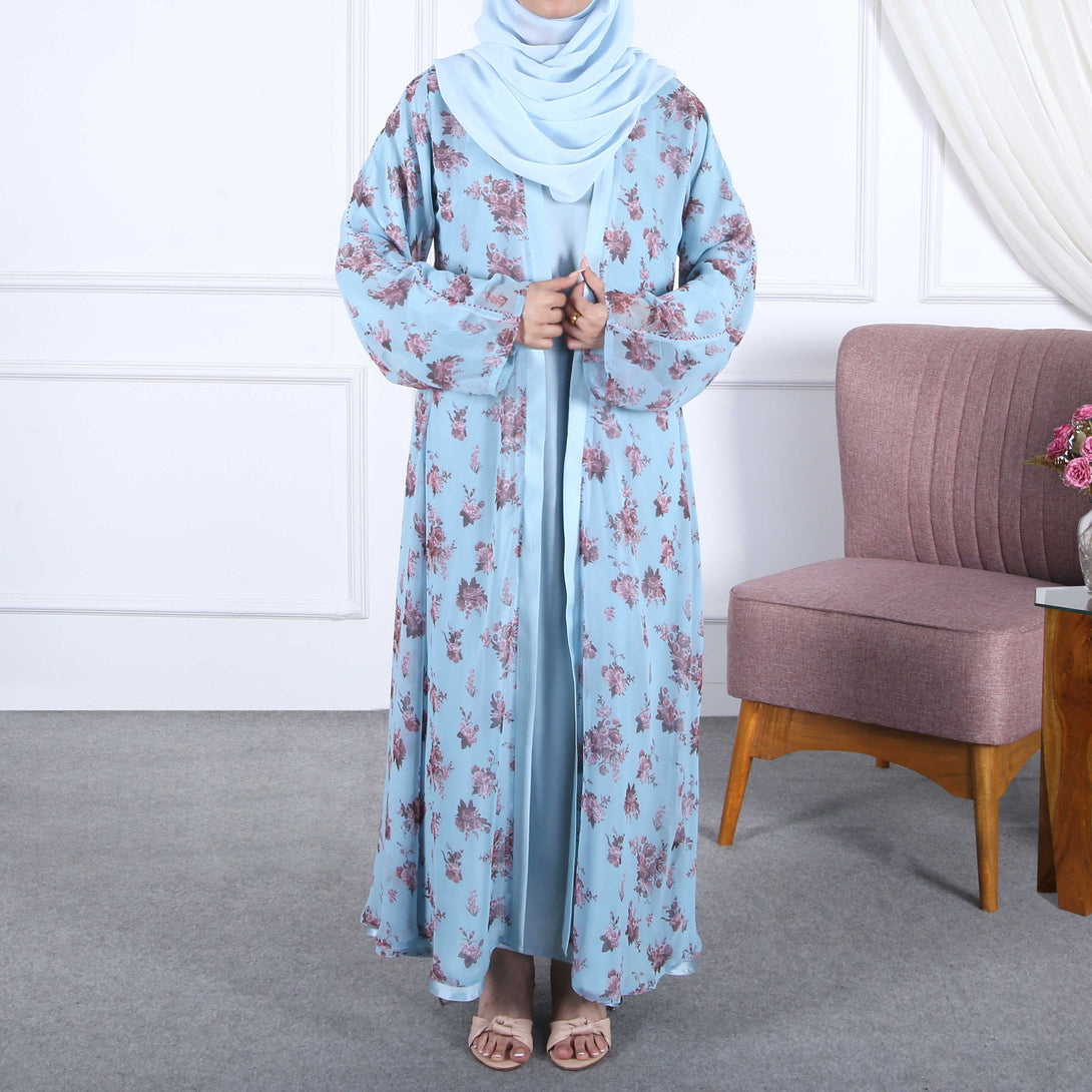 Working both for your afternoon and evening looks, this abaya comes with a delicate upper and comfortable inner. Bringing our alluring Abaya design in printed chiffon and shamoze fabric for feminine beauty with flowy look. Scarf not included.