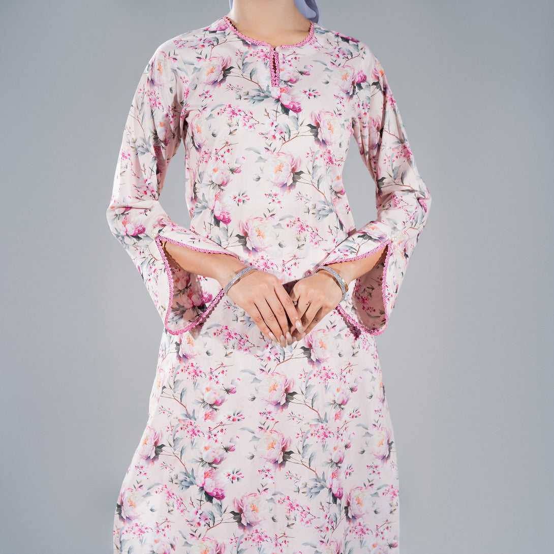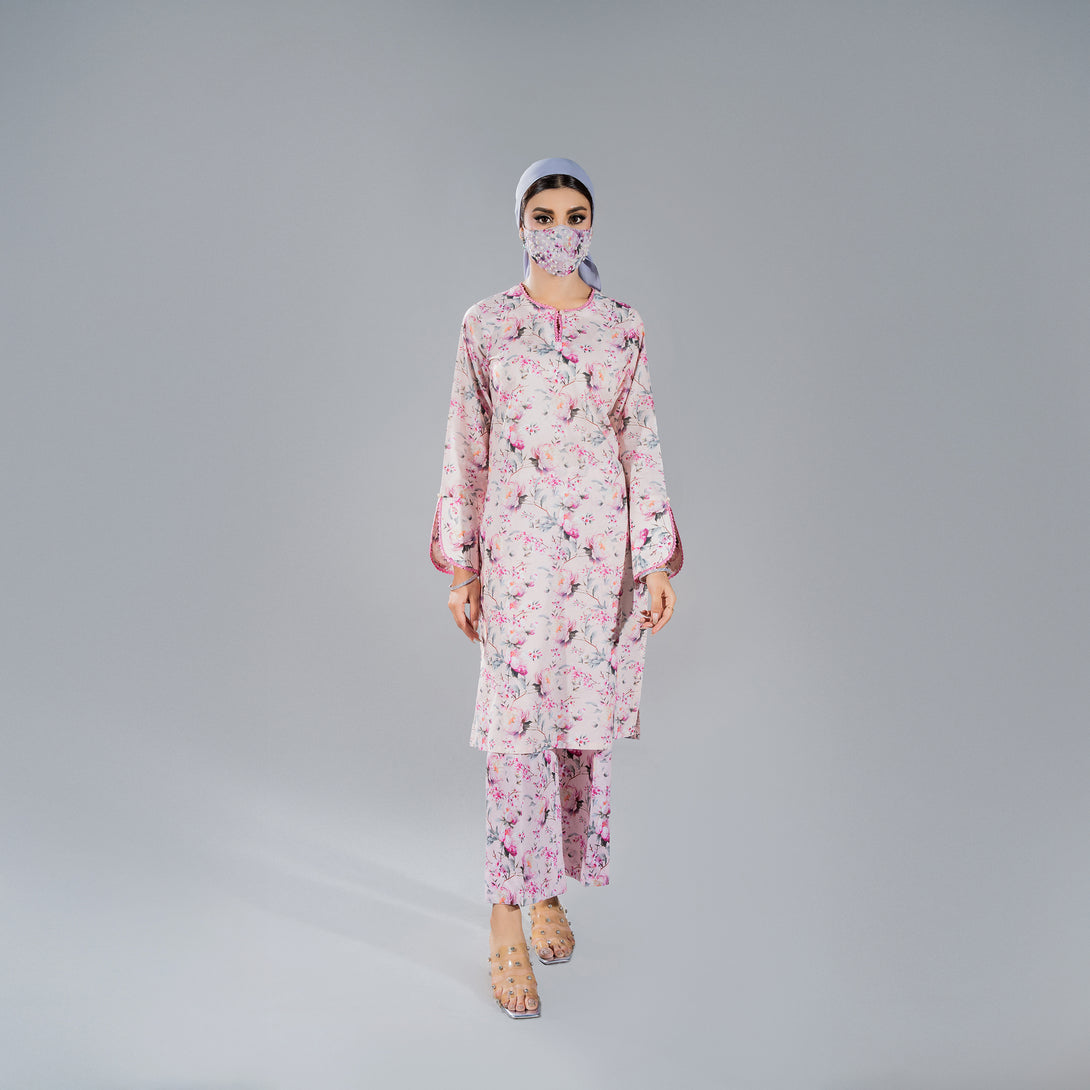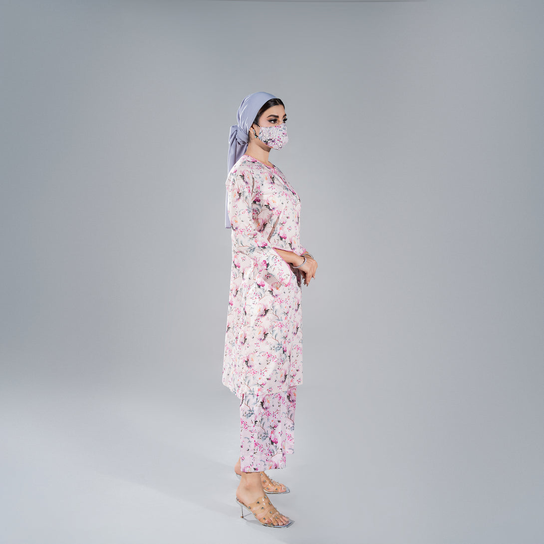 Step into effortless elegance with this light pink floral printed co ord set, crafted from soft, breathable lawn fabric. Delicate blooms dance across the pastel background, creating a look that's both fresh and feminine.