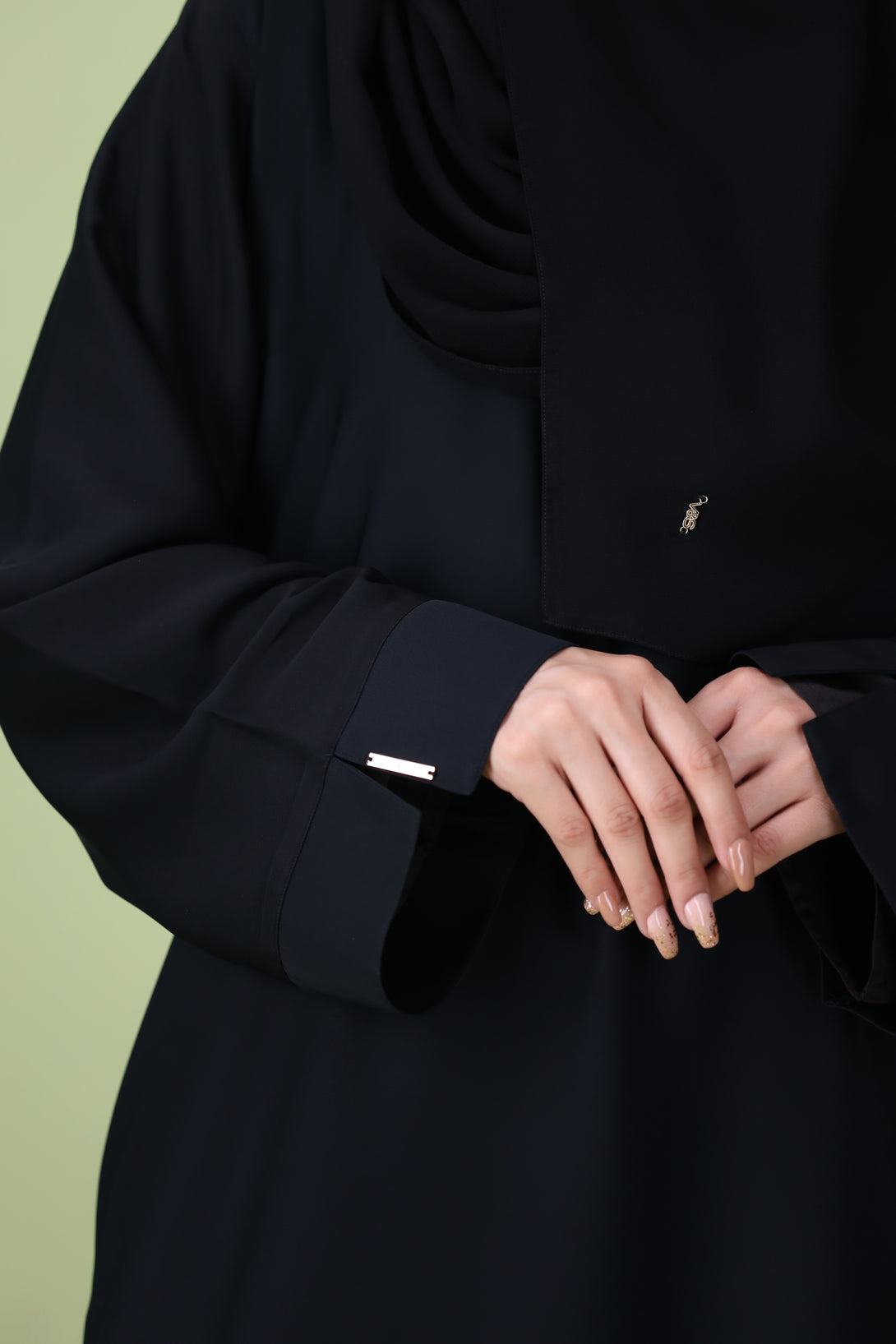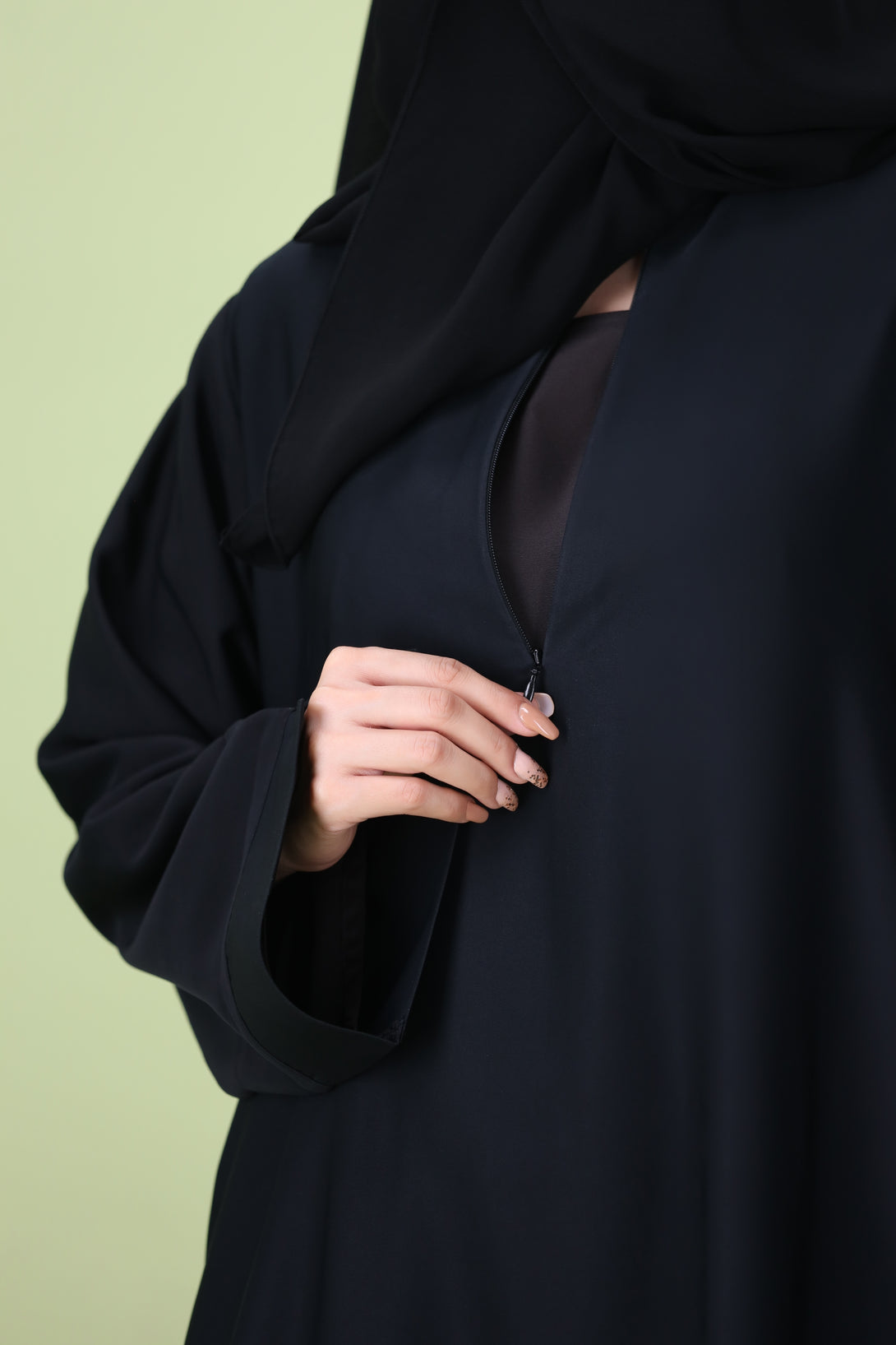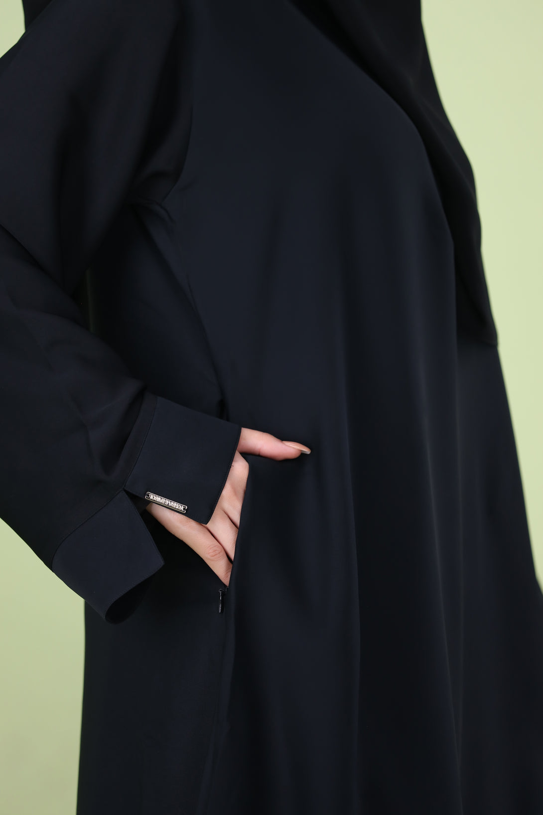 An elegant and modern black abaya defined by its minimalist design, featuring a discreet front zipper and refined cuffed sleeves with a subtle metal detail. Scarf Not Included.