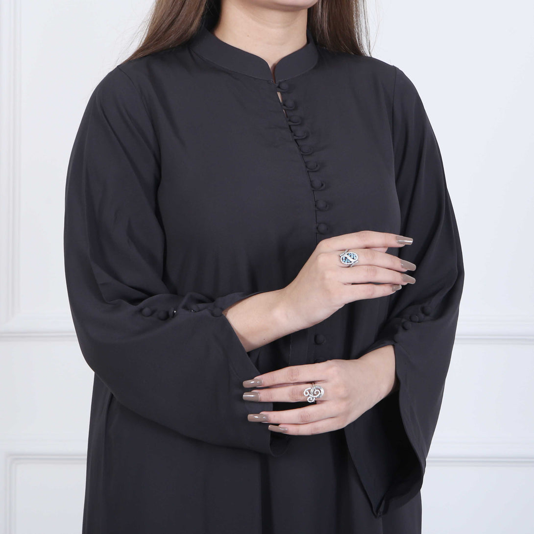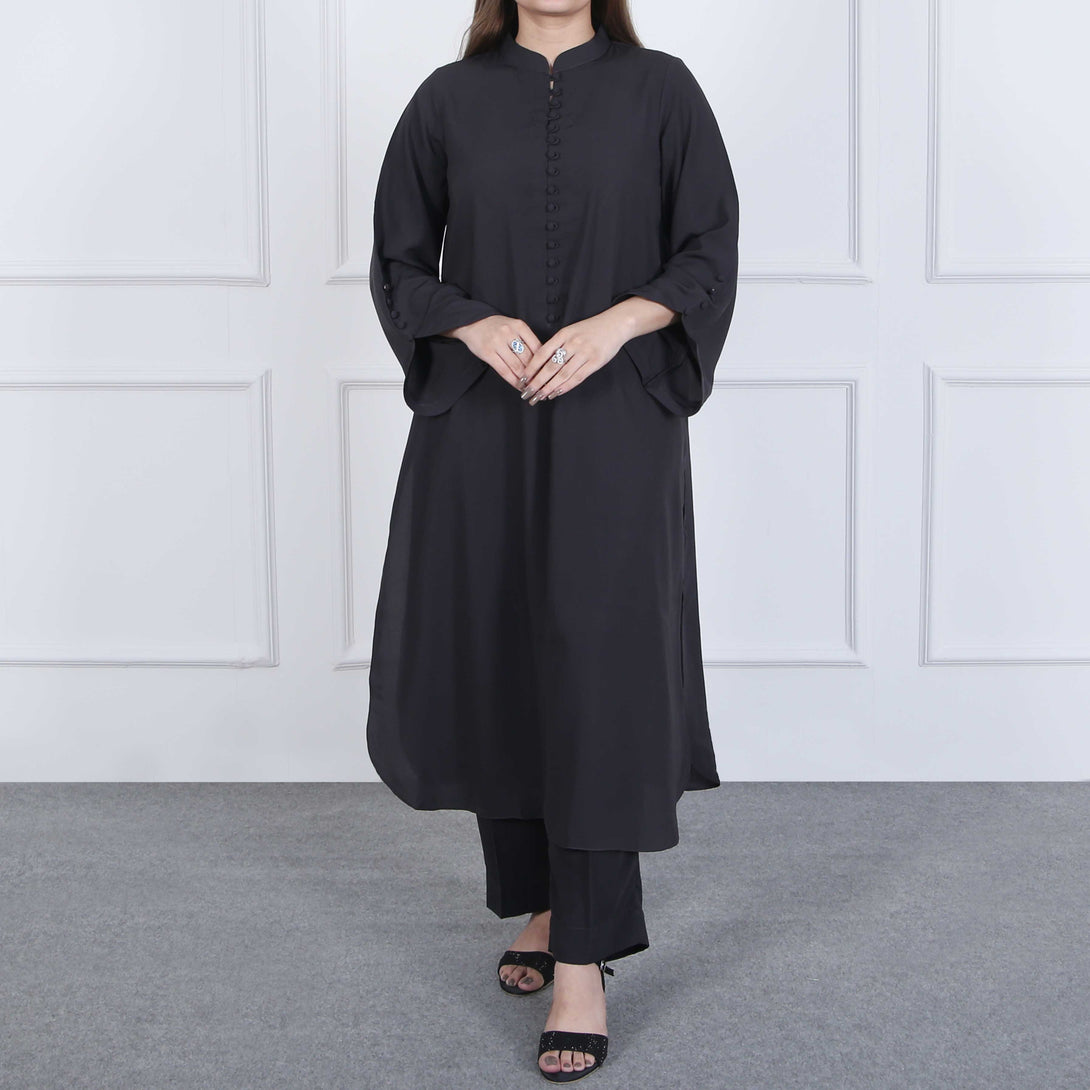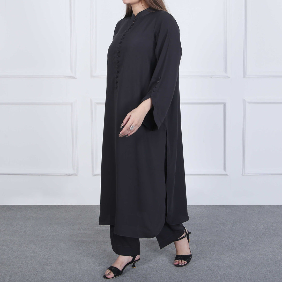 This charcoal grey trouser shirt is elegantly crafted from lightweight chiffon fabric, featuring a sophisticated banned collar and stylish buttons on the neckline. The flowing silhouette offers a graceful drape, making it perfect casual.