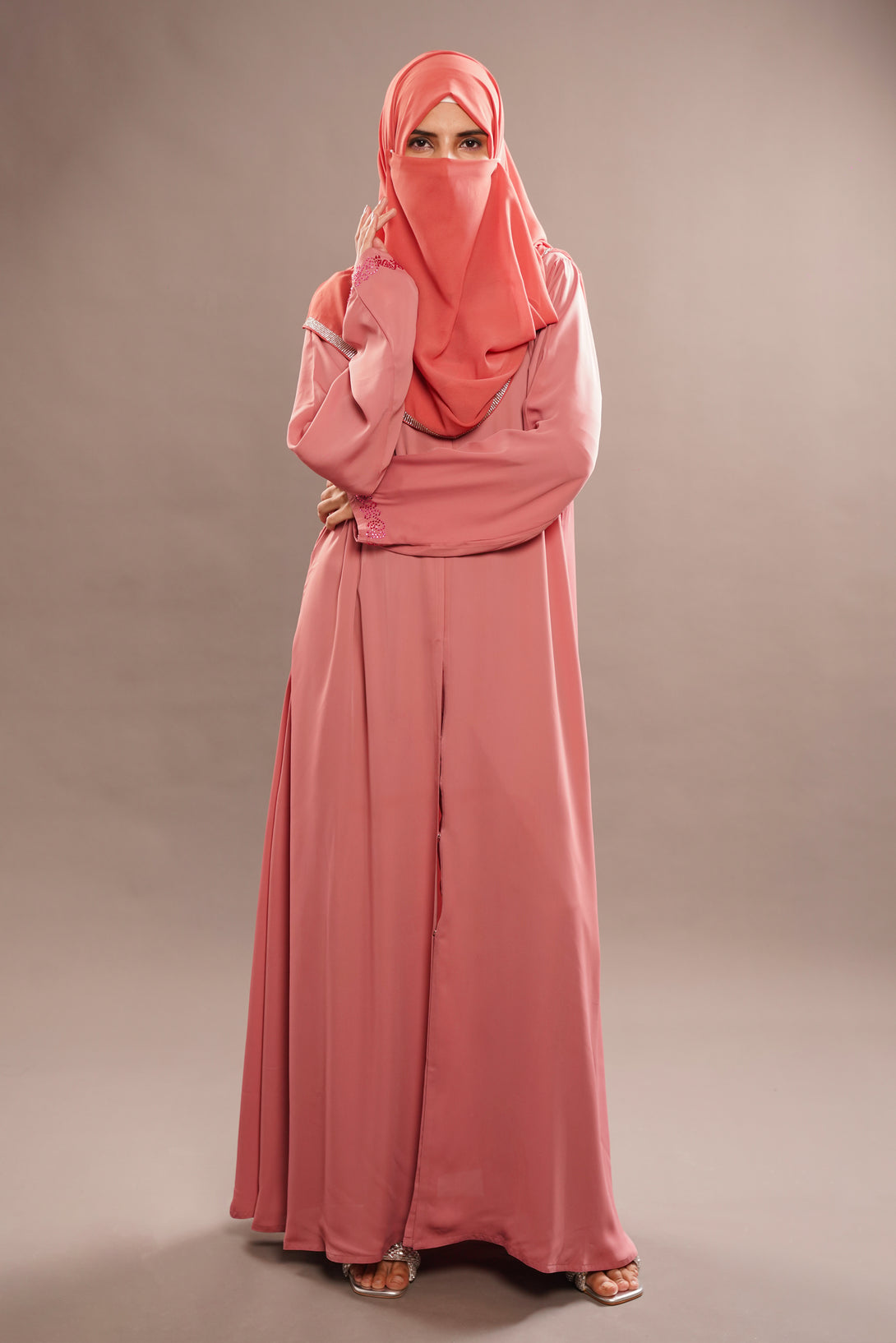 Let your elegance bloom in this exquisite coral abaya, featuring dazzling, stone-embellished cuffs that add a touch of sparkle to every gesture. Without scarf.