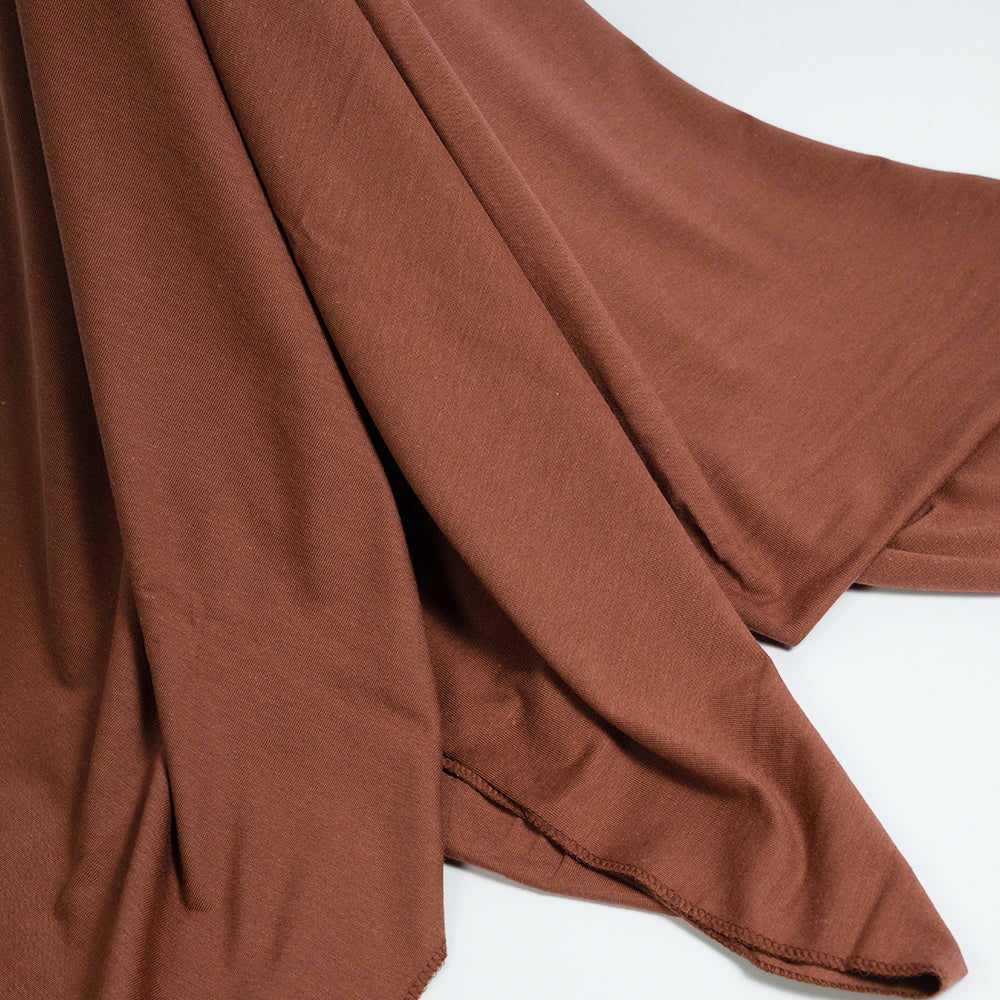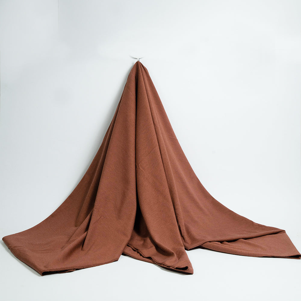 This coral colored scarf is made from soft, stretchy jersey fabric, offering a comfortable and cozy feel. Its lightweight material drapes beautifully, making it perfect for all day wear.