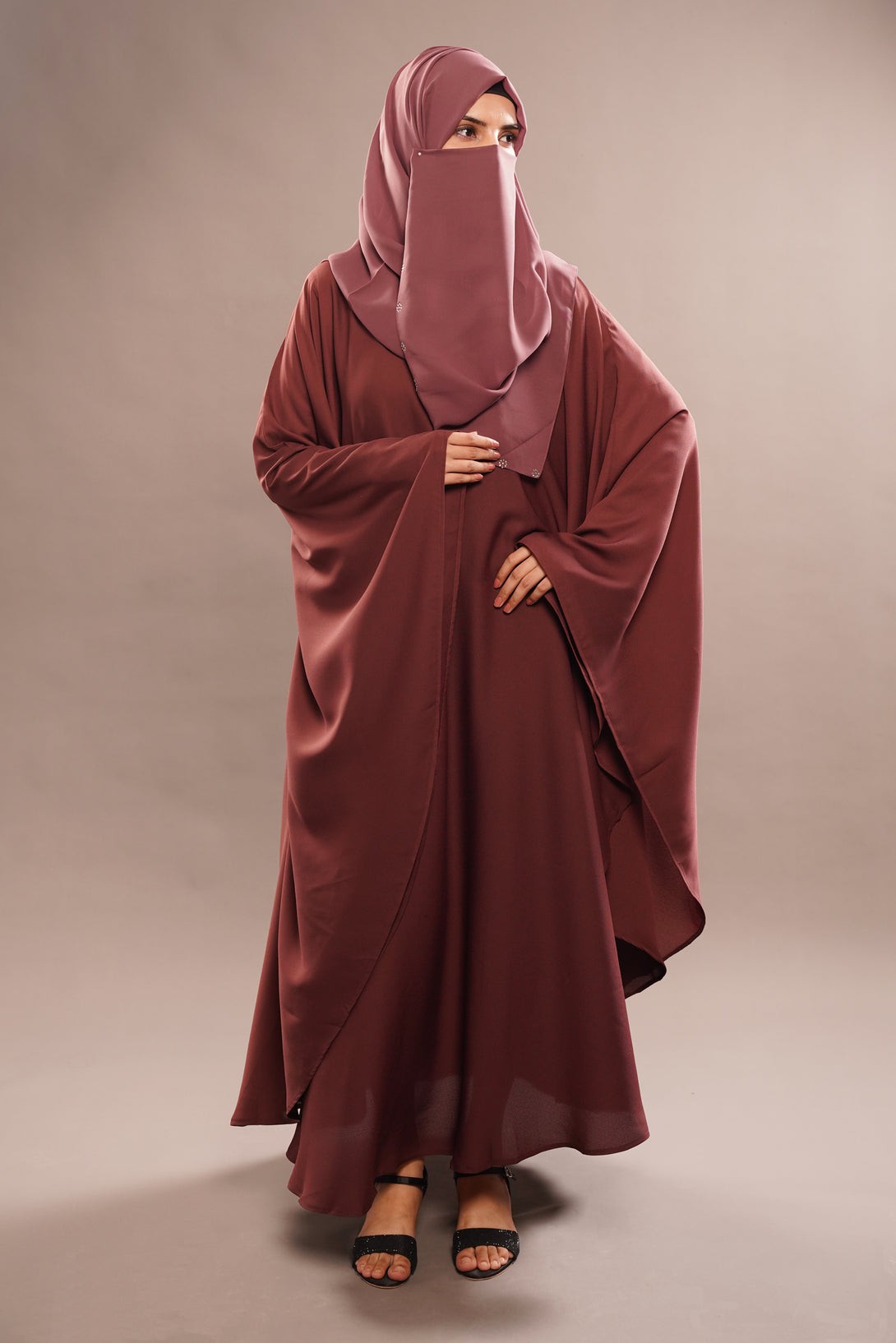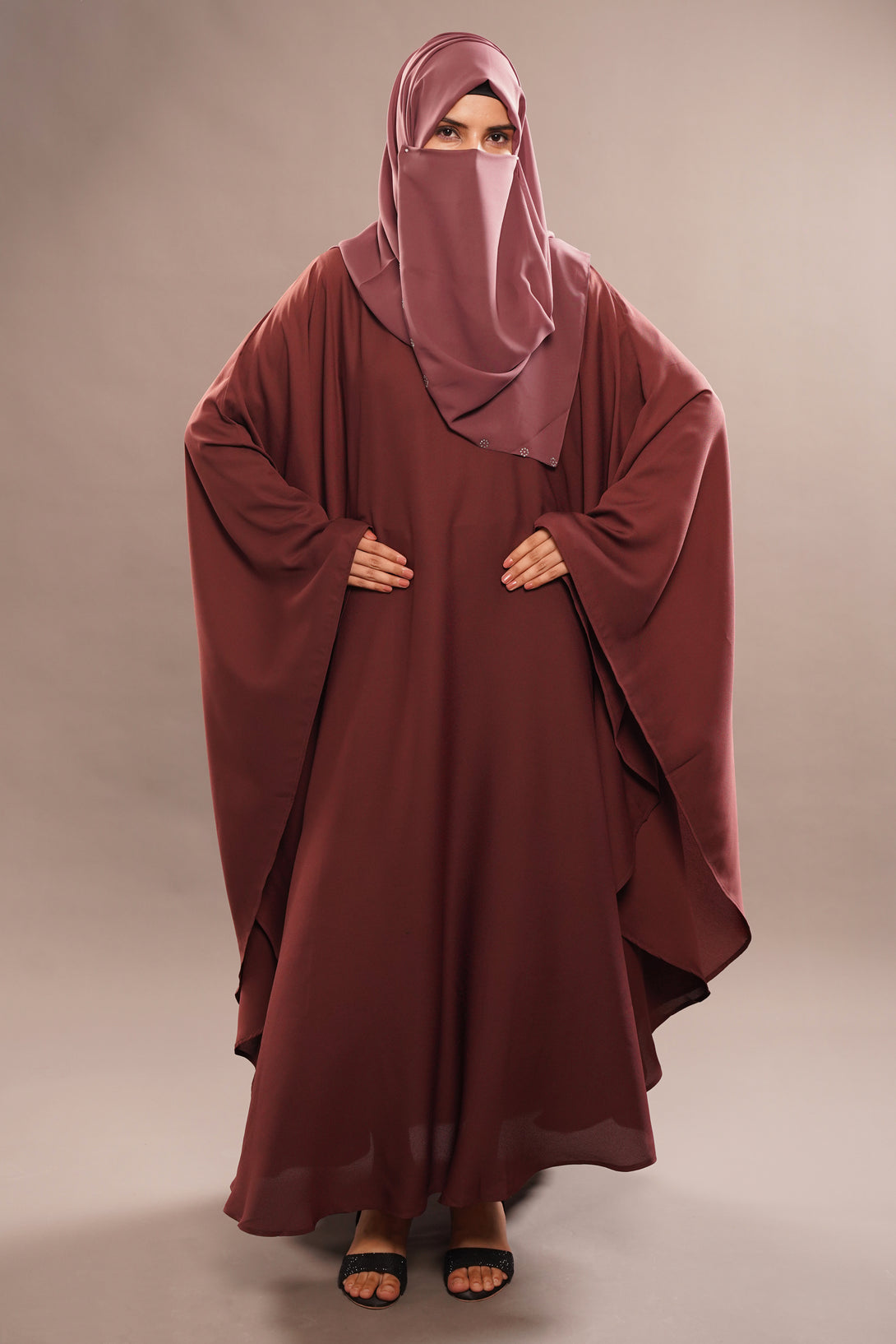 Make a powerful statement in simplicity. This stunning cranberry kaftan is crafted from lustrous satin that drapes and flows with breathtaking grace. Without scarf.