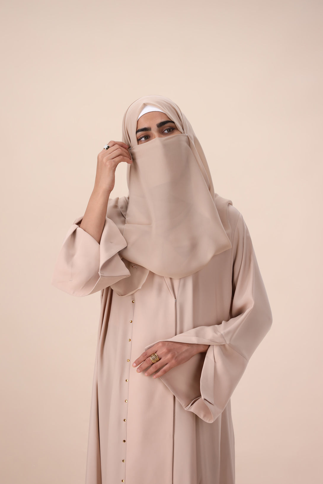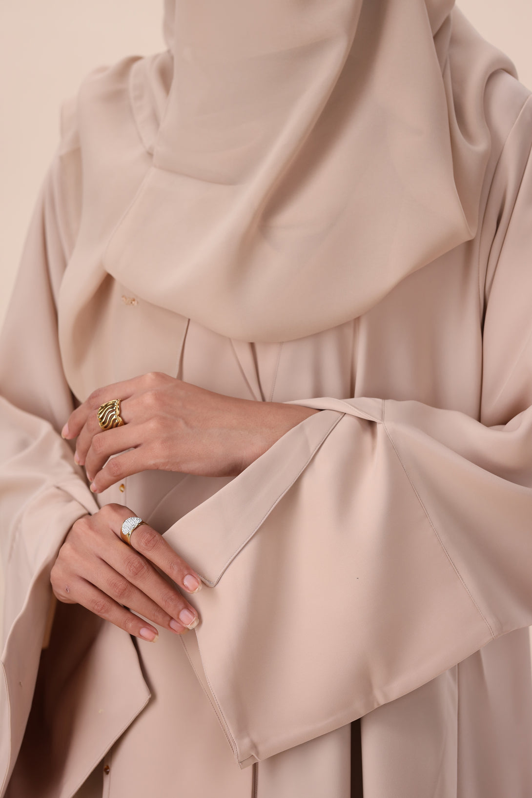 A serene fusion of tradition and modernity, this flowing beige abaya embodies quiet sophistication through minimalism and graceful design. Without scarf.
