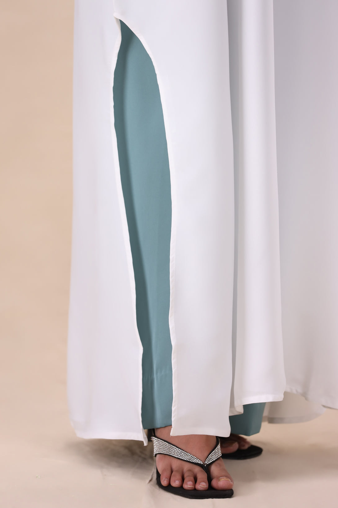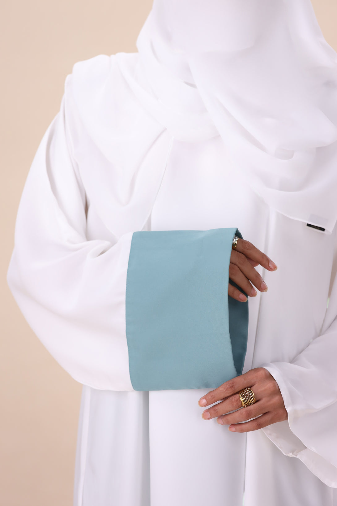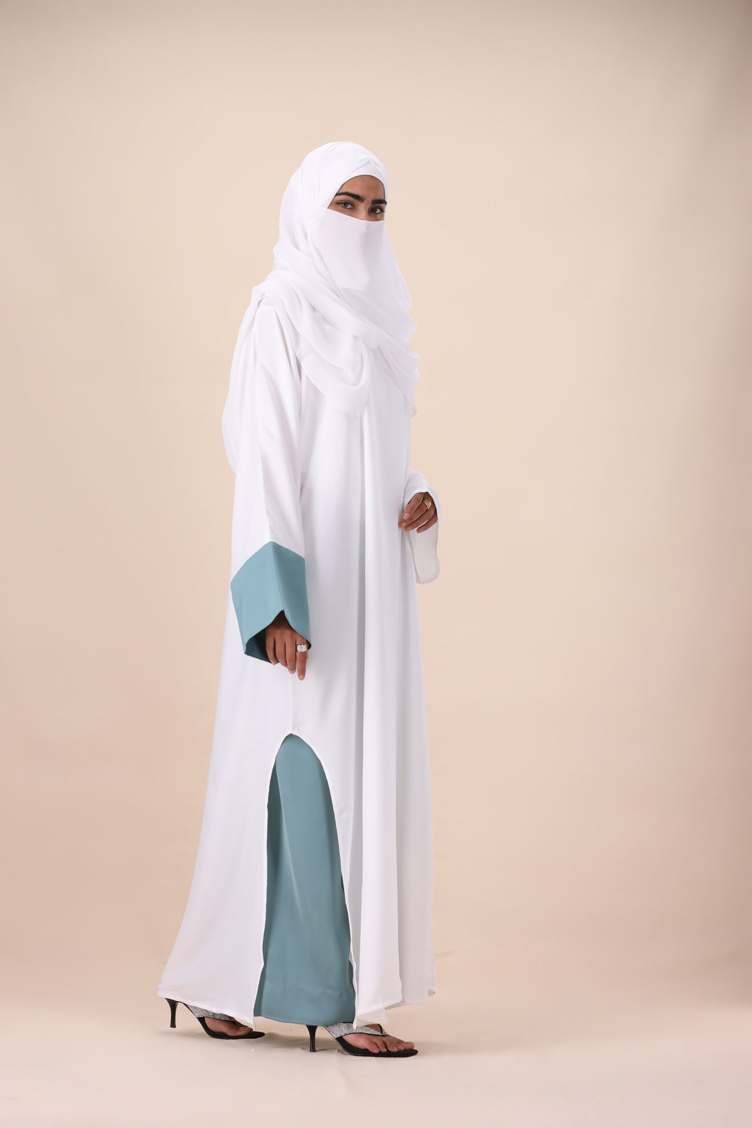 Experience the best of both worlds with this unique abaya, where pure white and serene blue layers create a dynamic and elegant look. In Korean nida fabric included scarf.