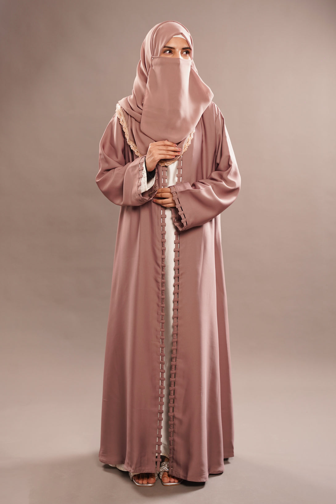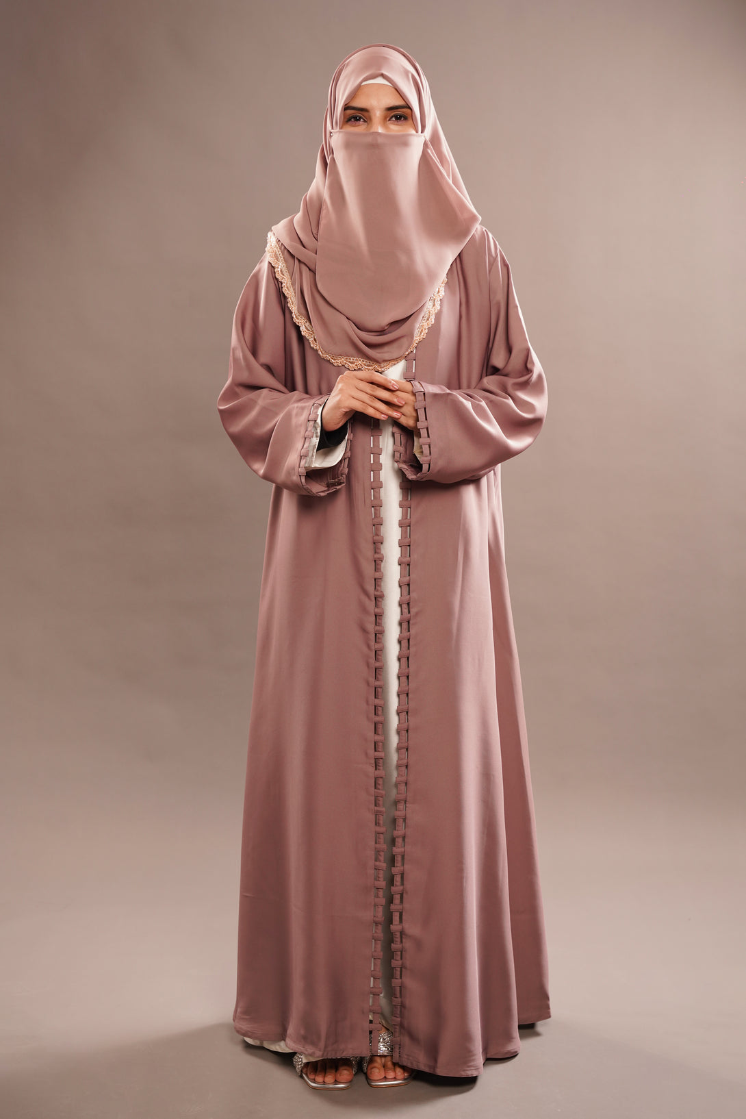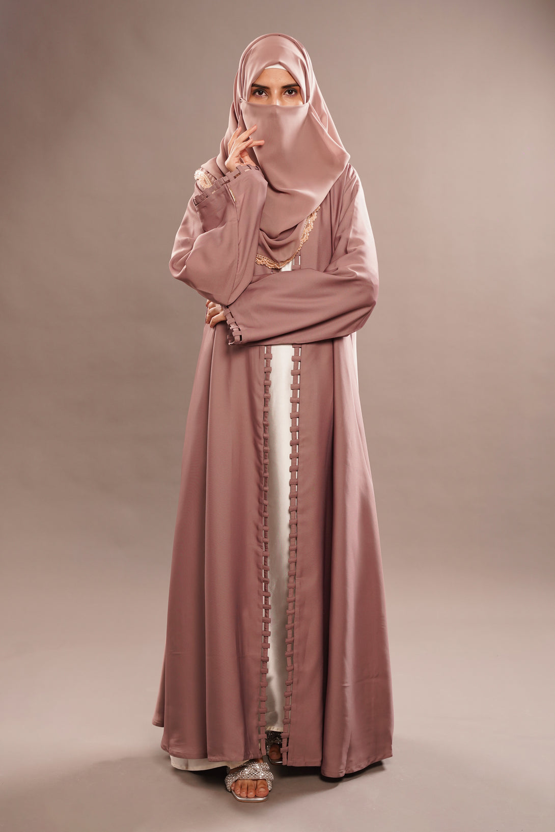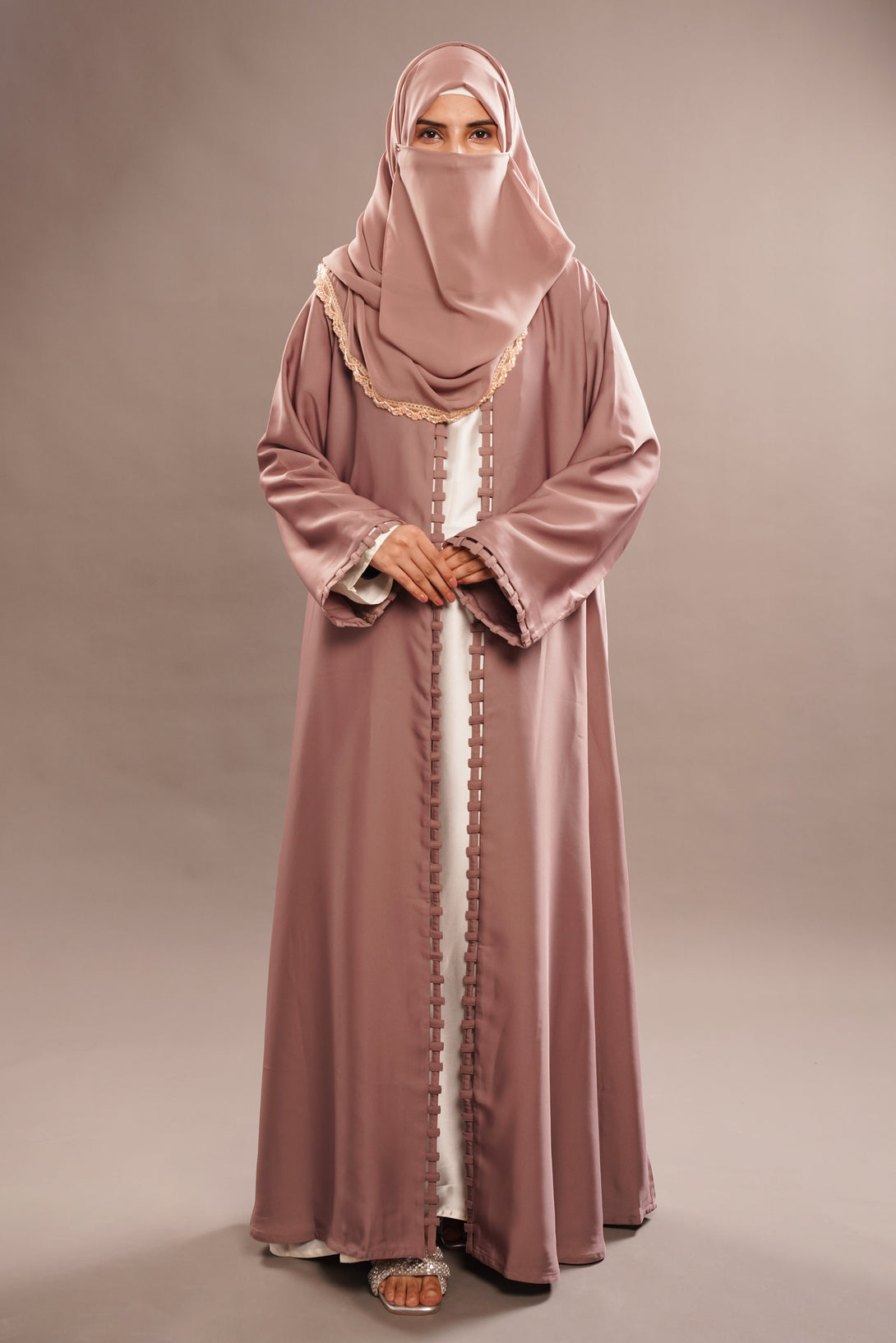 The Dusty Rose Elegance Abaya features a soft, muted mauve tone that exudes understated sophistication. With a clean, flowing silhouette and delicate woven trim detailing along the front and cuffs.