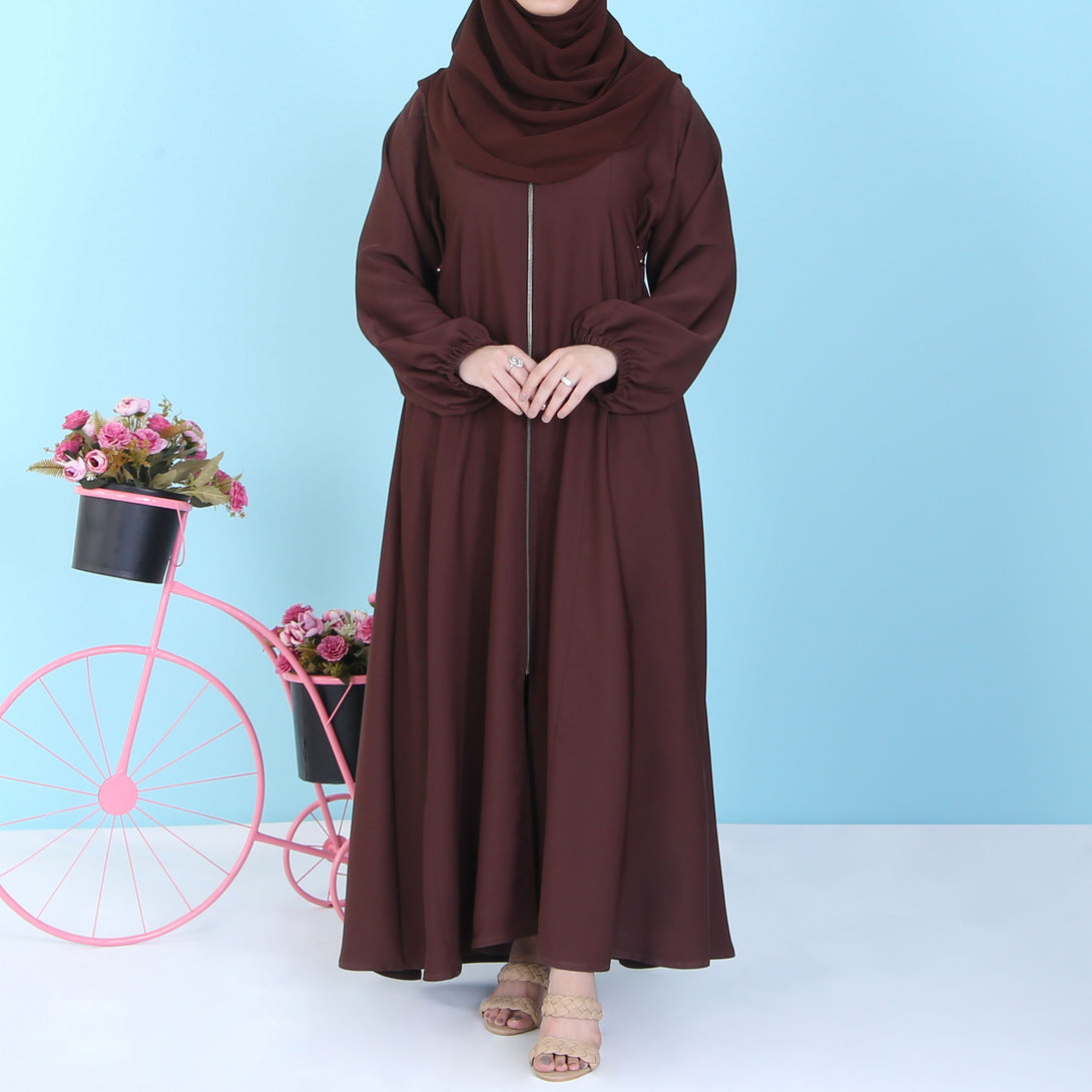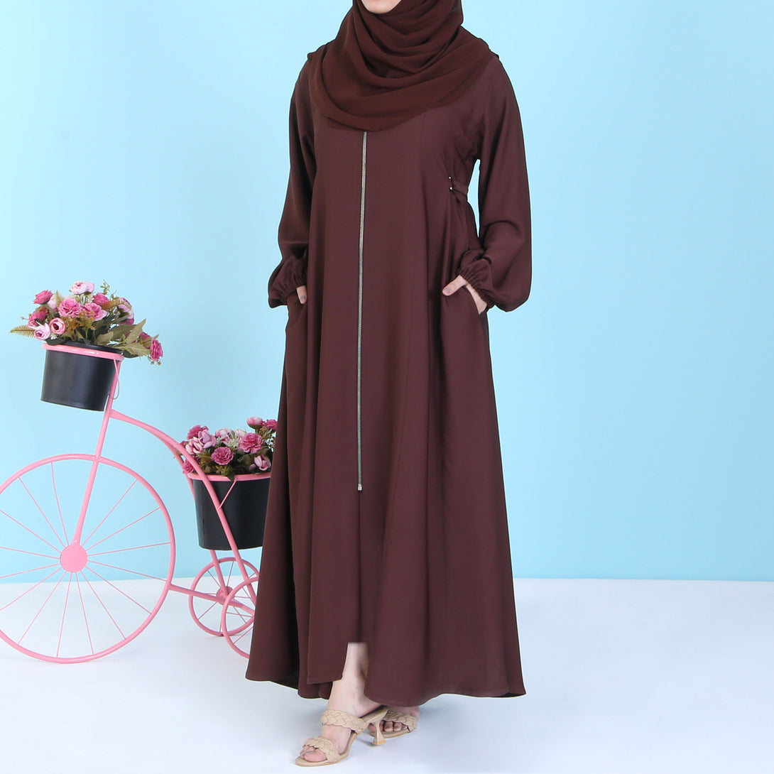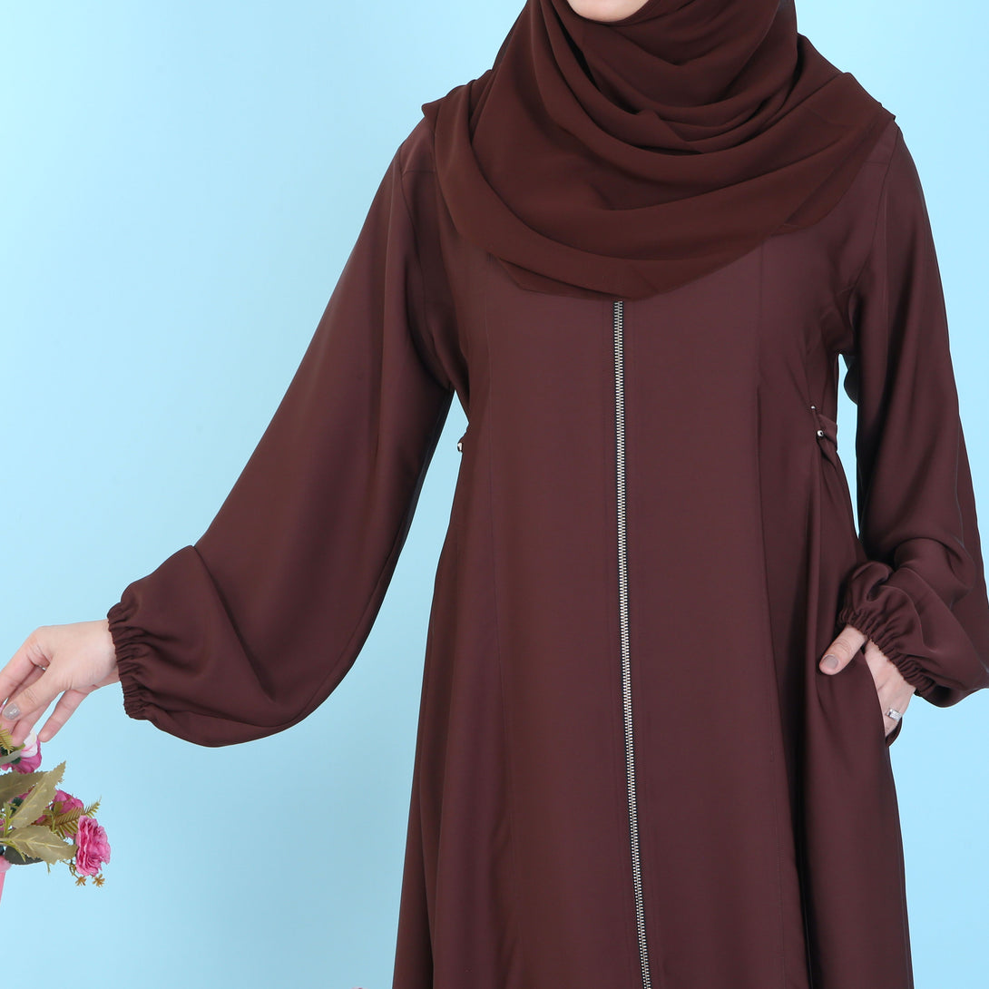 This abaya features a sleek design with a front zipper and decorative buckles attached to the front panels. The zippered front adds a modern touch while the buckles enhance its stylish appeal. With scarf.