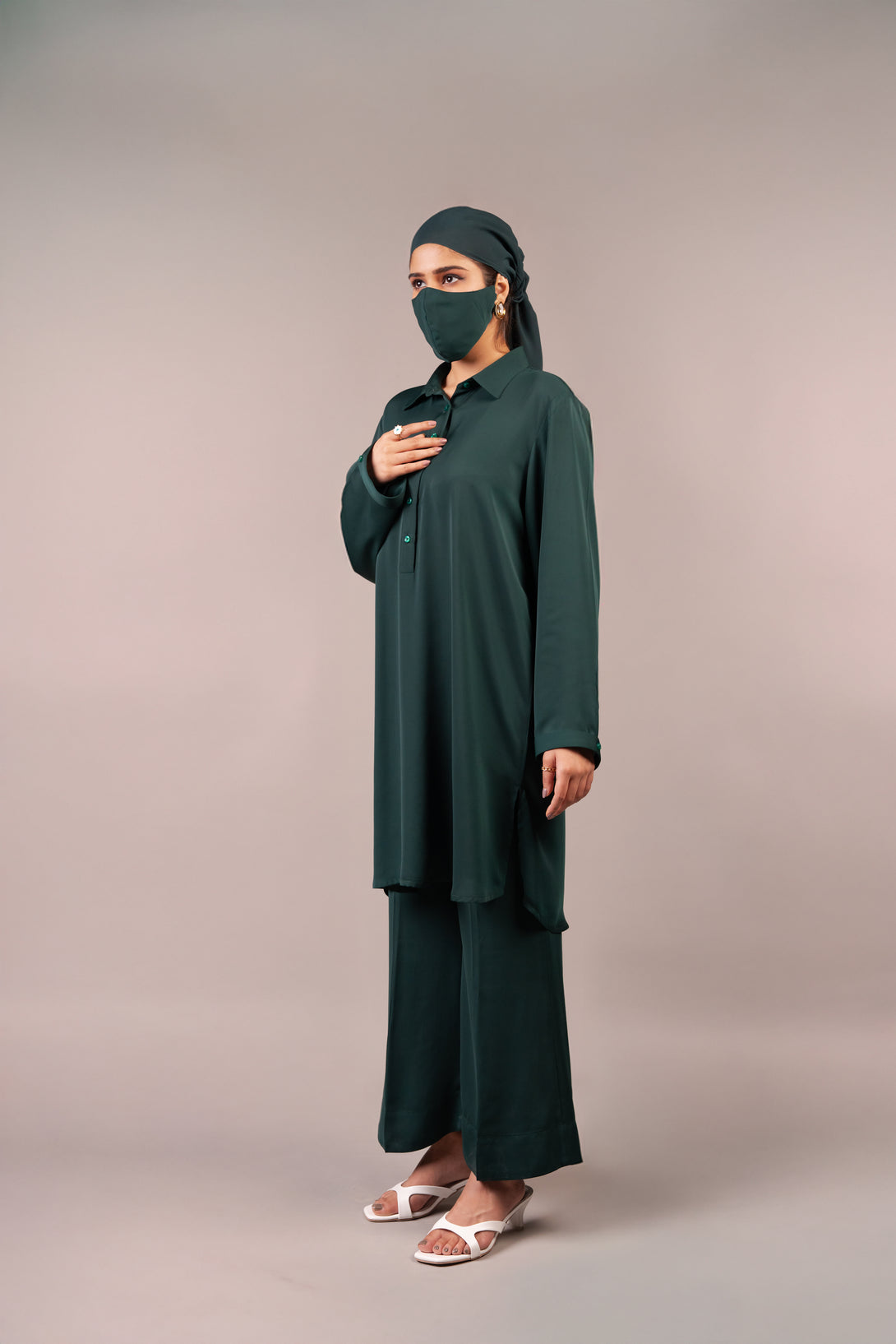 Command attention with the timeless elegance of the Emerald Muse Co Ord Set, tailored in flowy chiffon for all-day comfort. This deep green ensemble features a collared long shirt with a sleek button down placket.