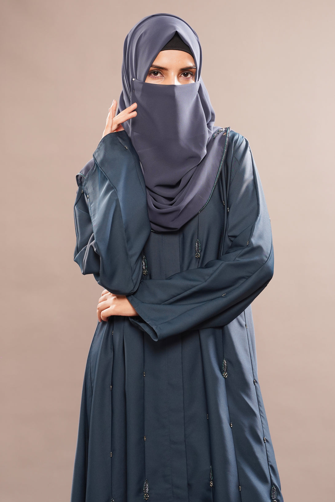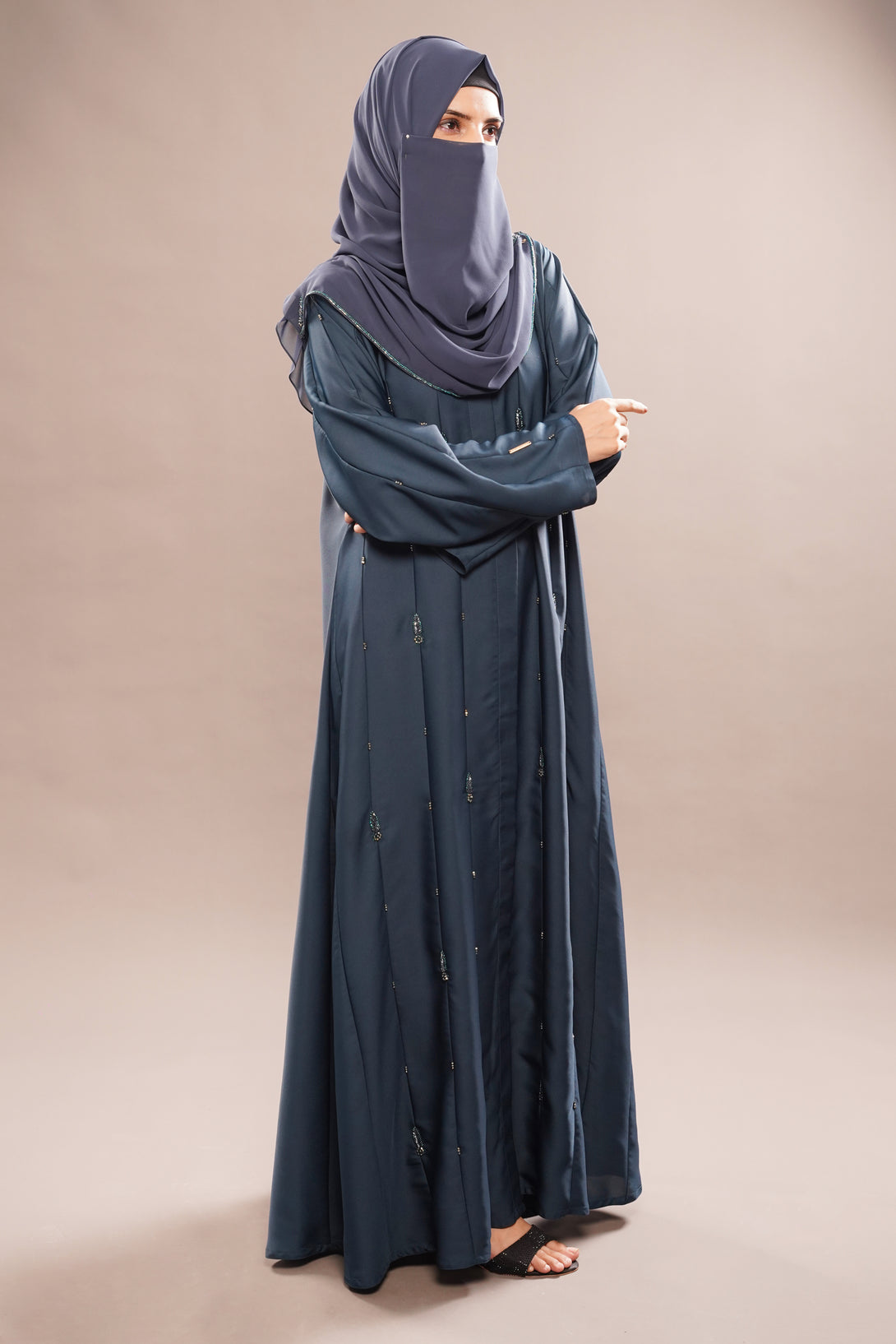 The Emerald Twilight Abaya is a refined statement piece in a rich, deep teal shade. Its elegant vertical paneling is adorned with delicate beadwork and subtle embroidered motifs with scarf.