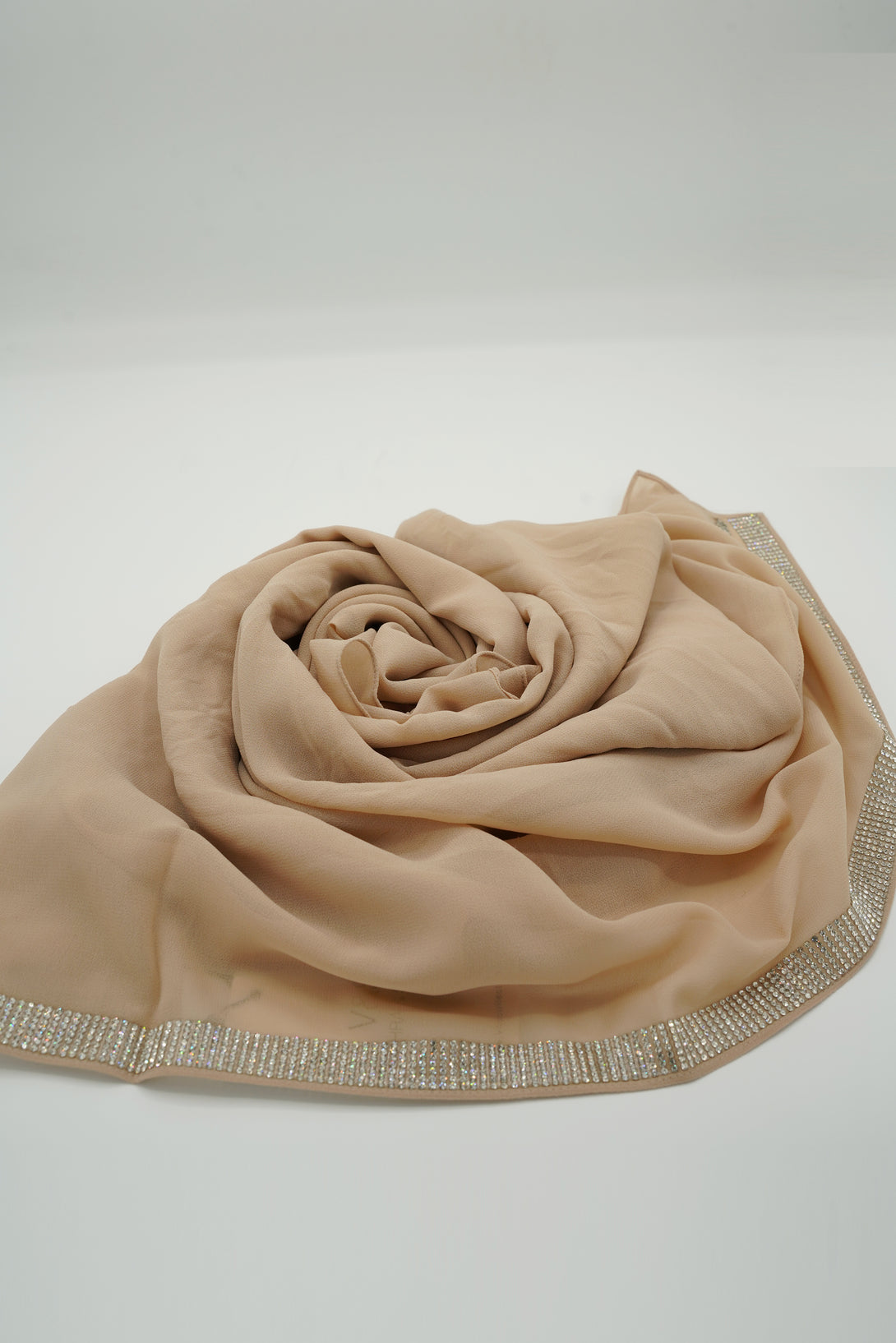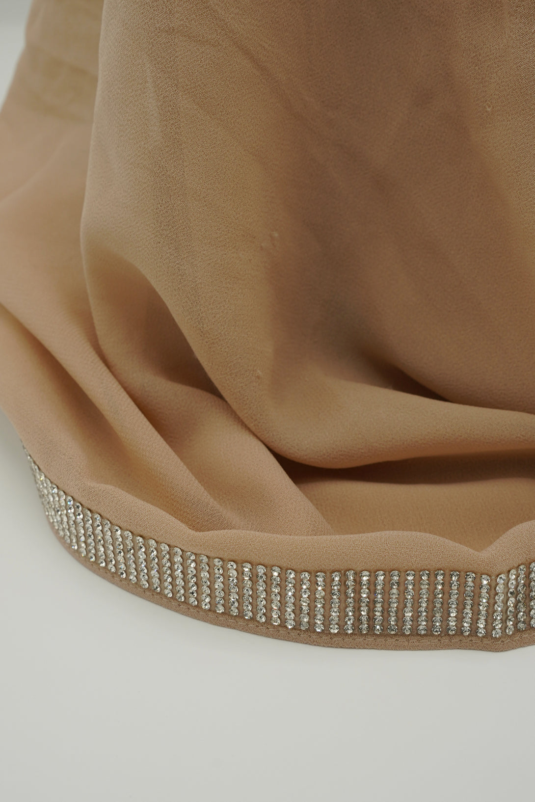 Make a dazzling entrance with this statement scarf, where a warm golden beige hue is edged with a spectacular, wide border of pave crystals for maximum glamour.