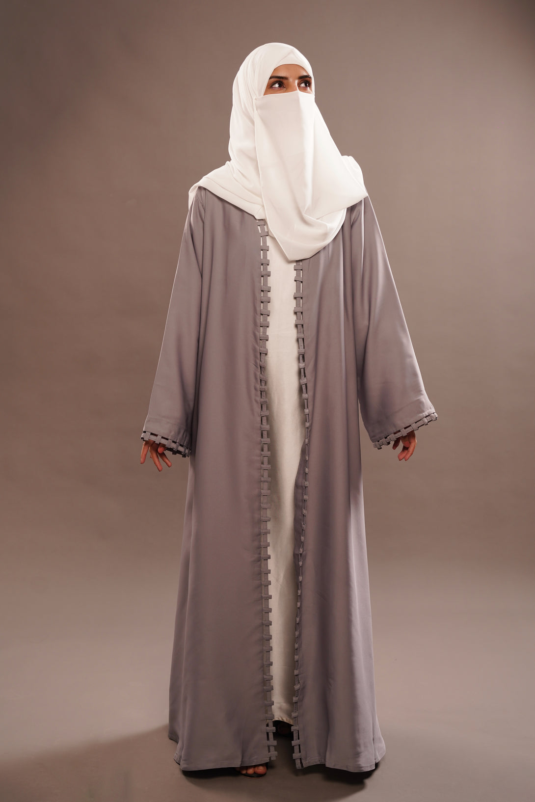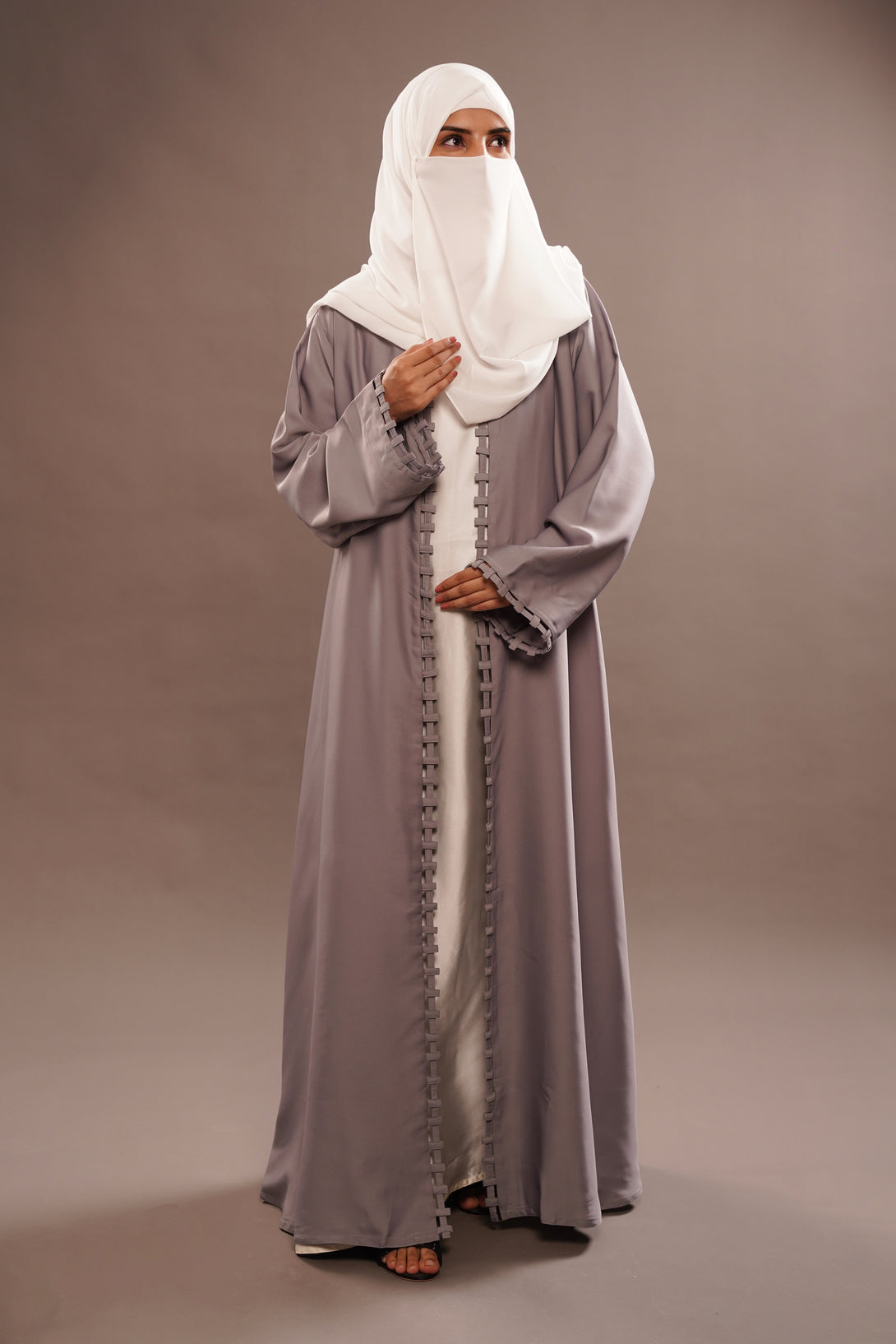 The grey Serenity Abaya offers a graceful and modest design in a calming muted shade. Made from smooth, high quality fabric, it features intricate loop detailing along the front and sleeves, adding a refined charm.