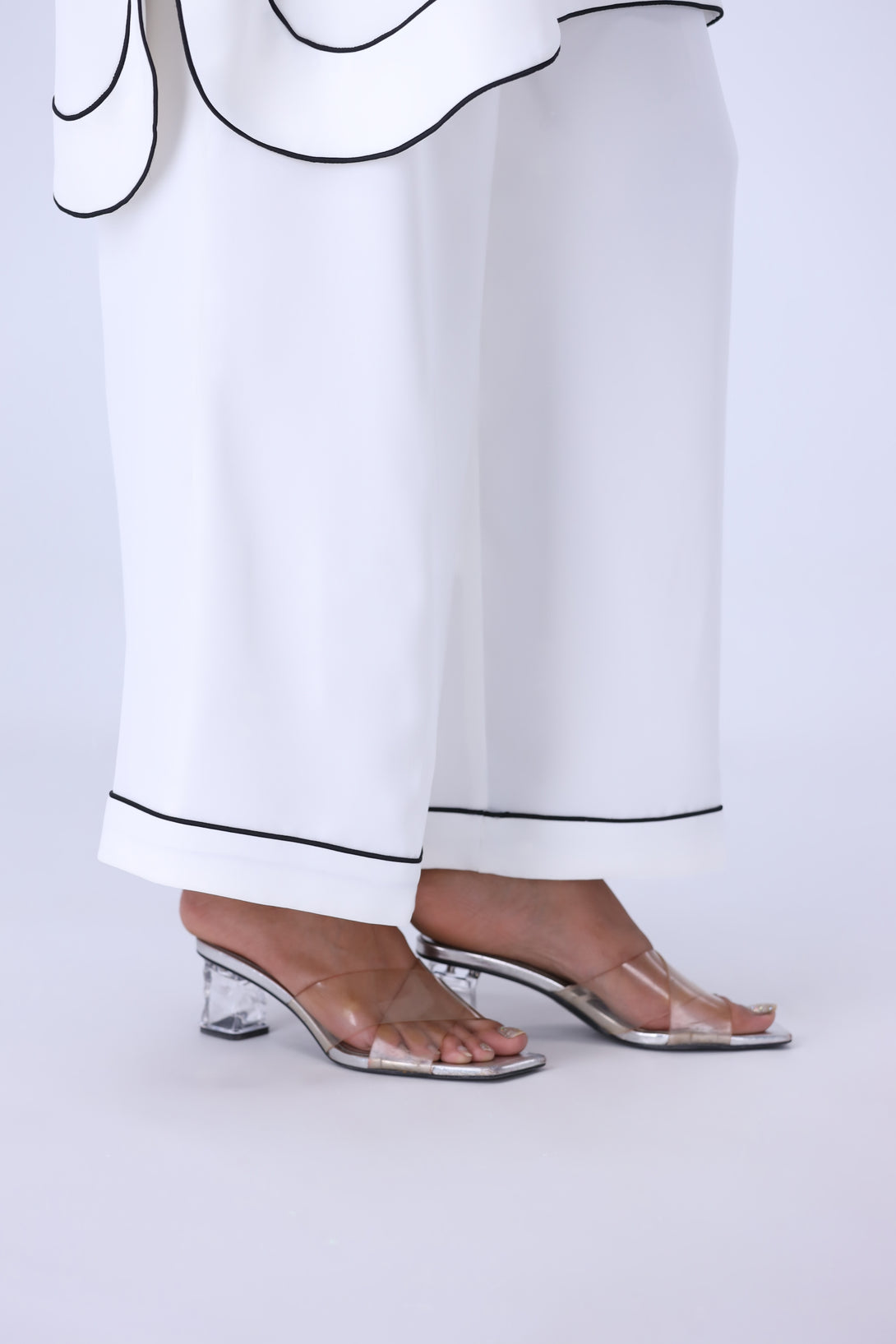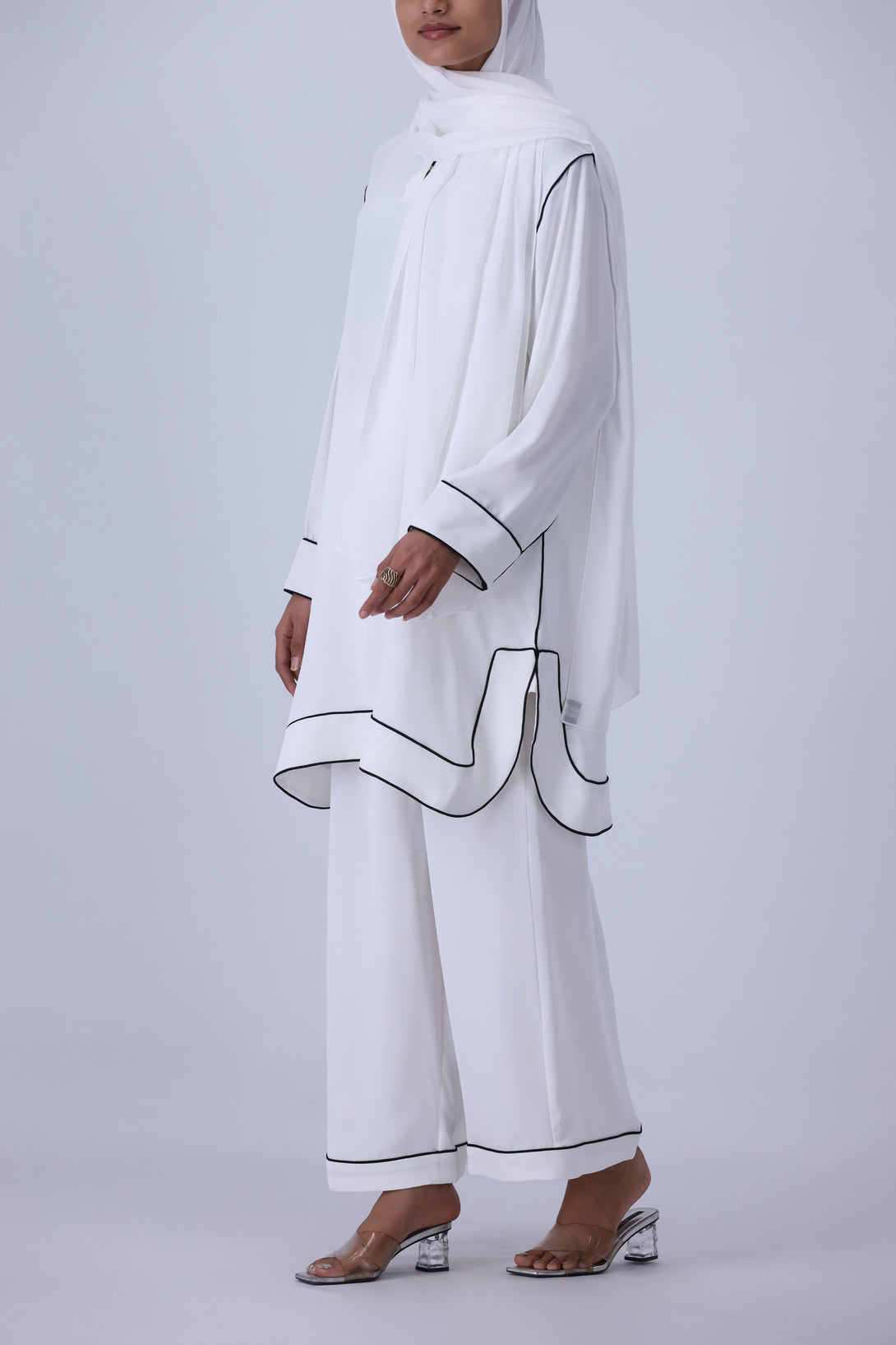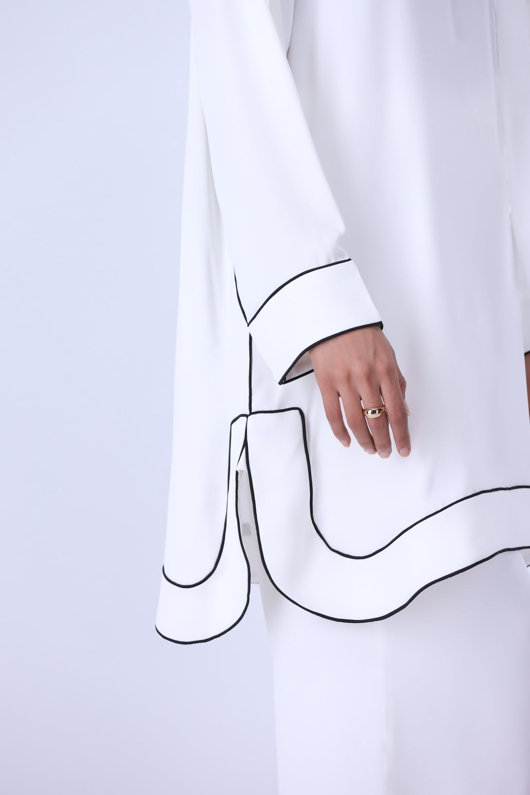 Minimalist perfection featuring fluid white fabric framed by a striking continuous black contour Shirt and trouser.