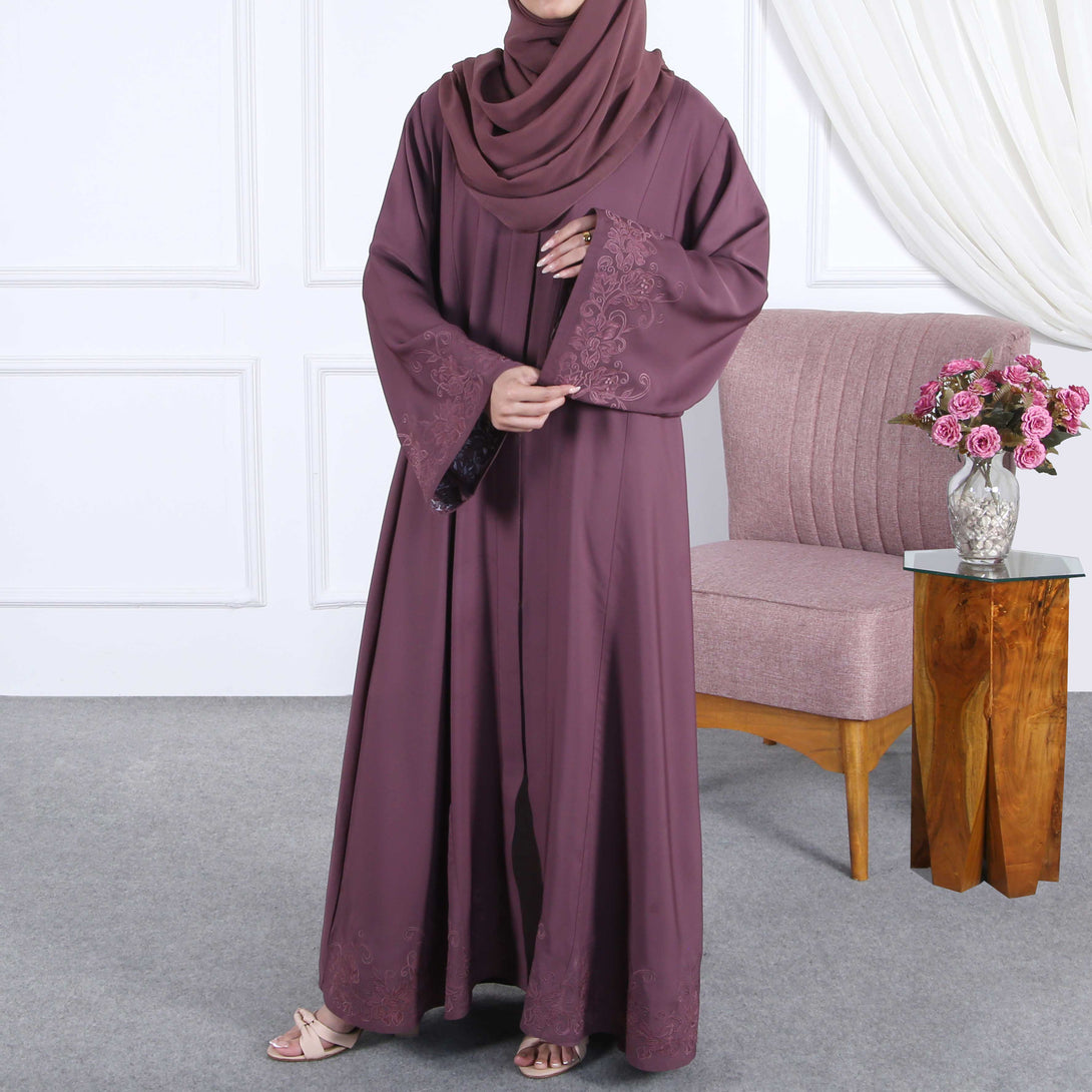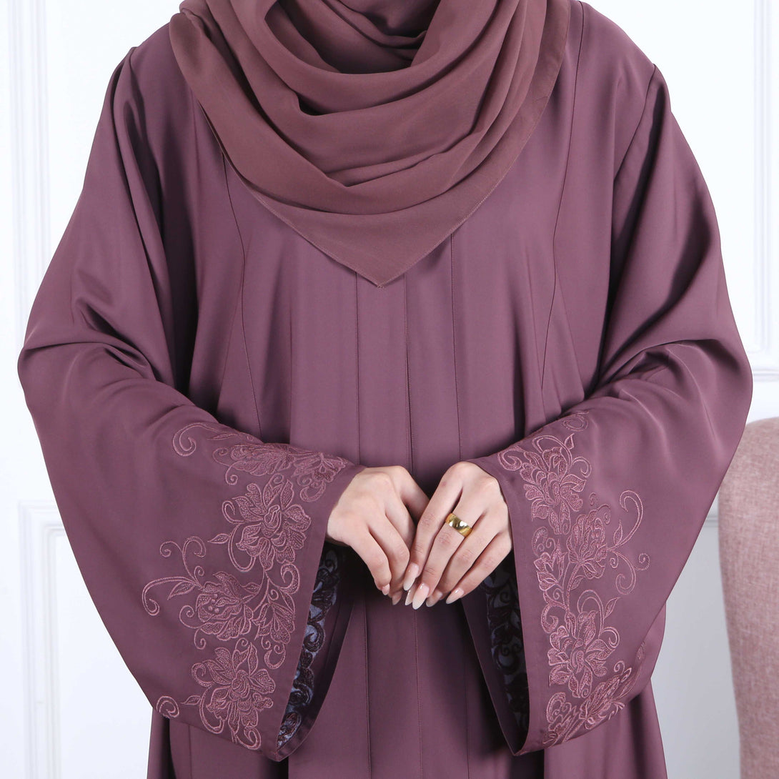 This elegant Jam Rose front-open abaya exudes sophistication with its intricate embroidery work adorning the sleeves. The delicate patterns add a touch of grace Scarf is not included.