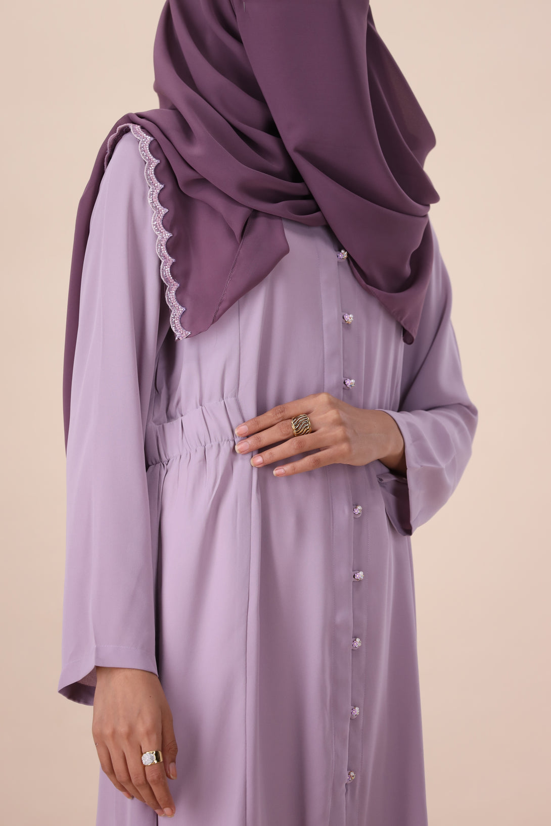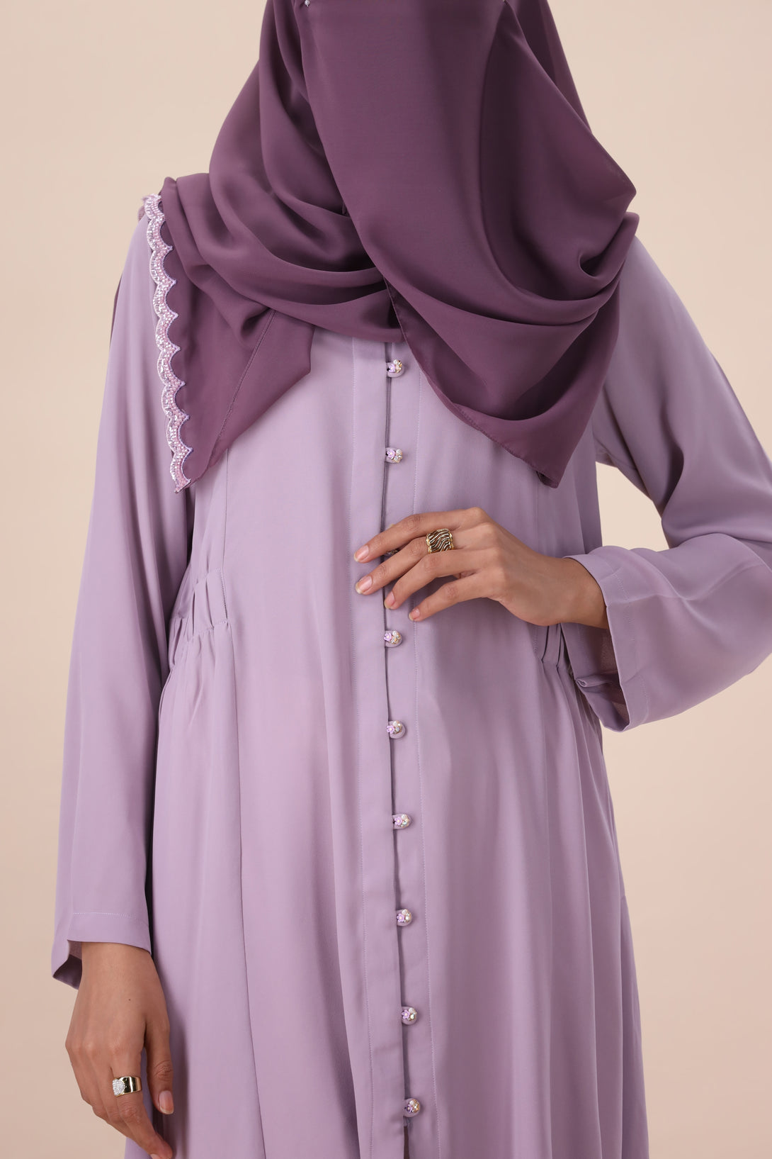 A whisper of lavender and white, this ensemble redefines modest style with its soft sophistication and delicate charm.
