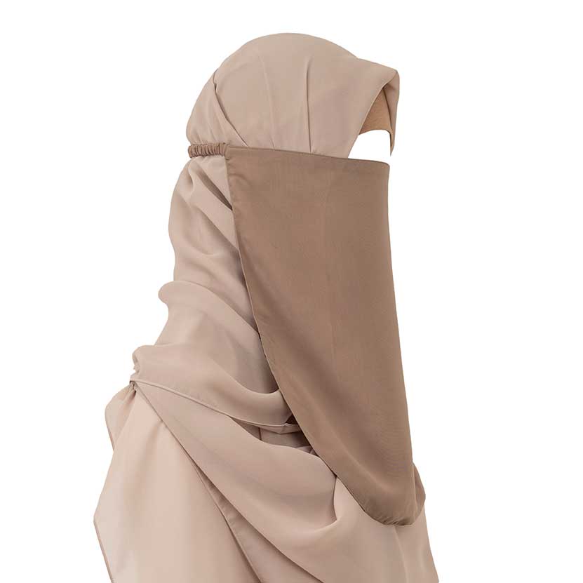 A brown naqab in chiffon exudes understated elegance. The sheer fabric delicately veils the face with a soft, graceful drape. Its subtle pale brown tone adds a touch of warmth and sophistication, ideal for both formal occasions and everyday use.