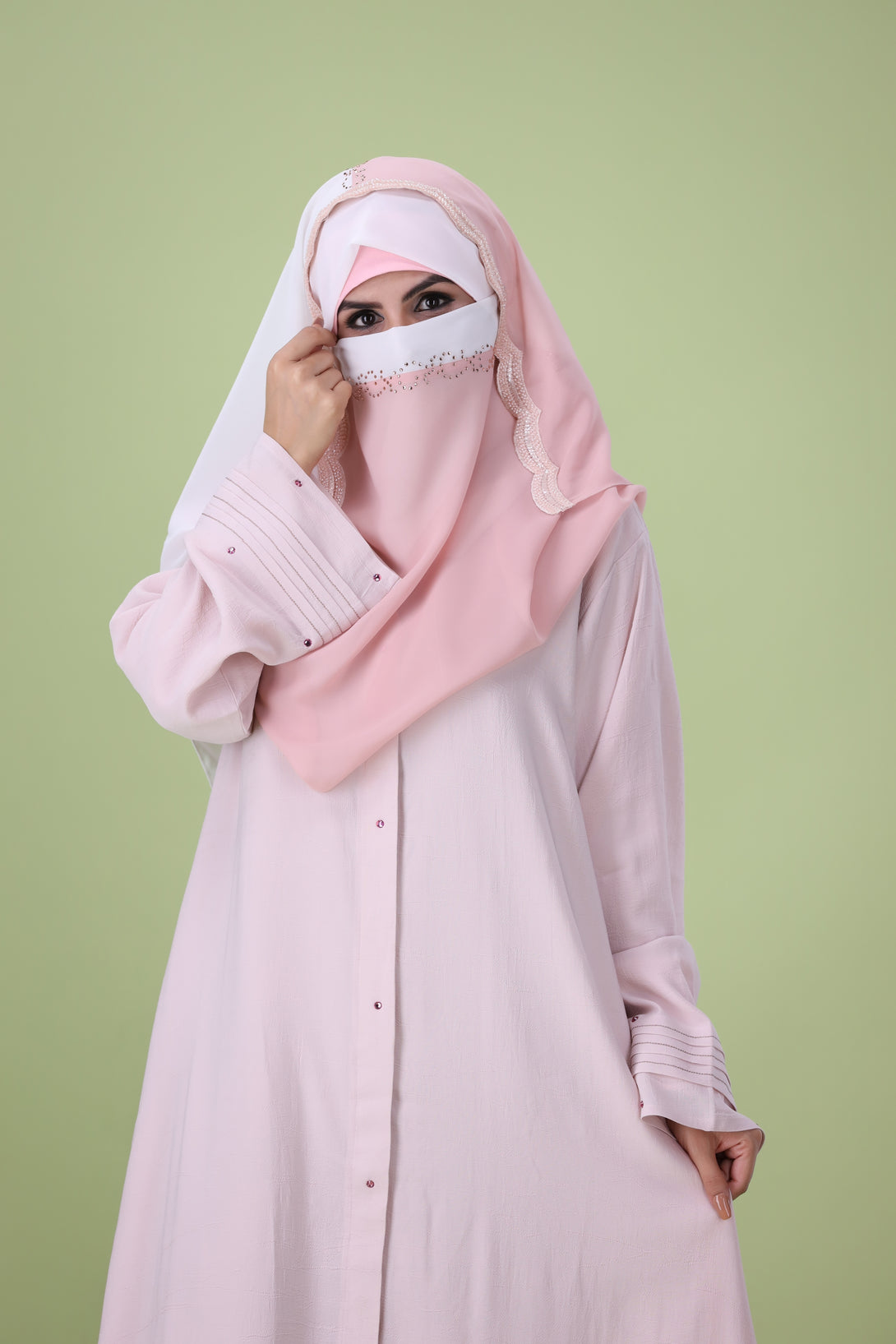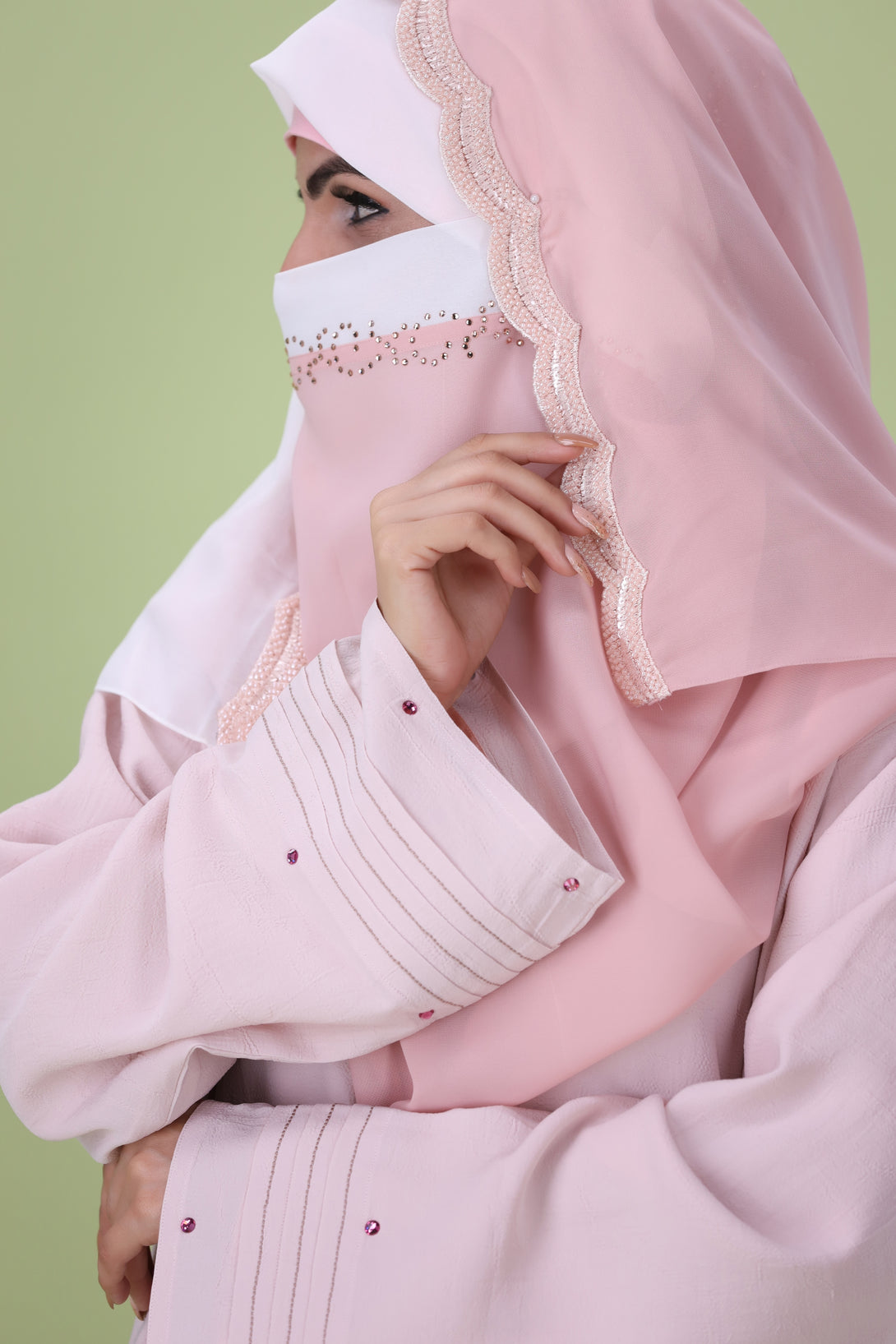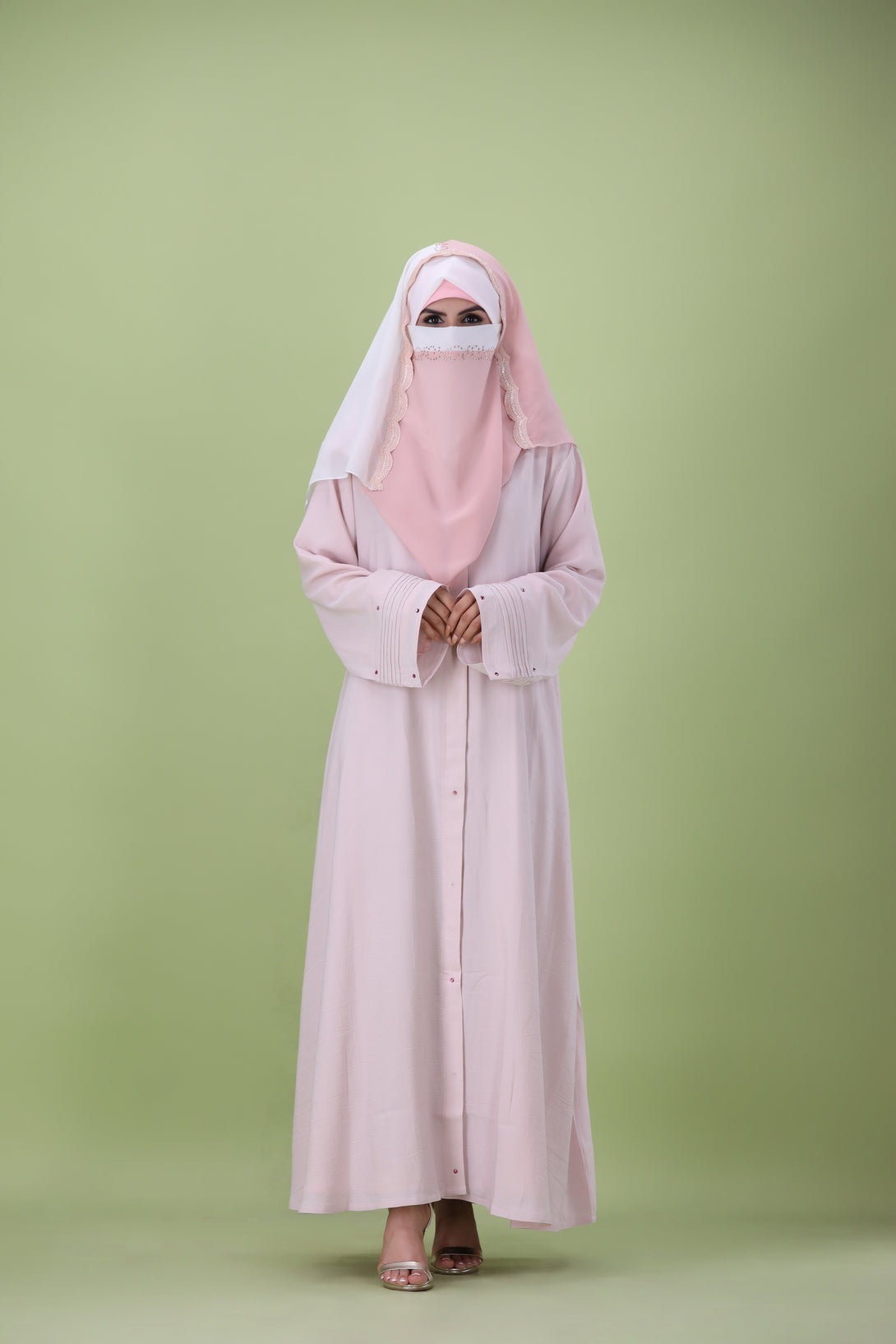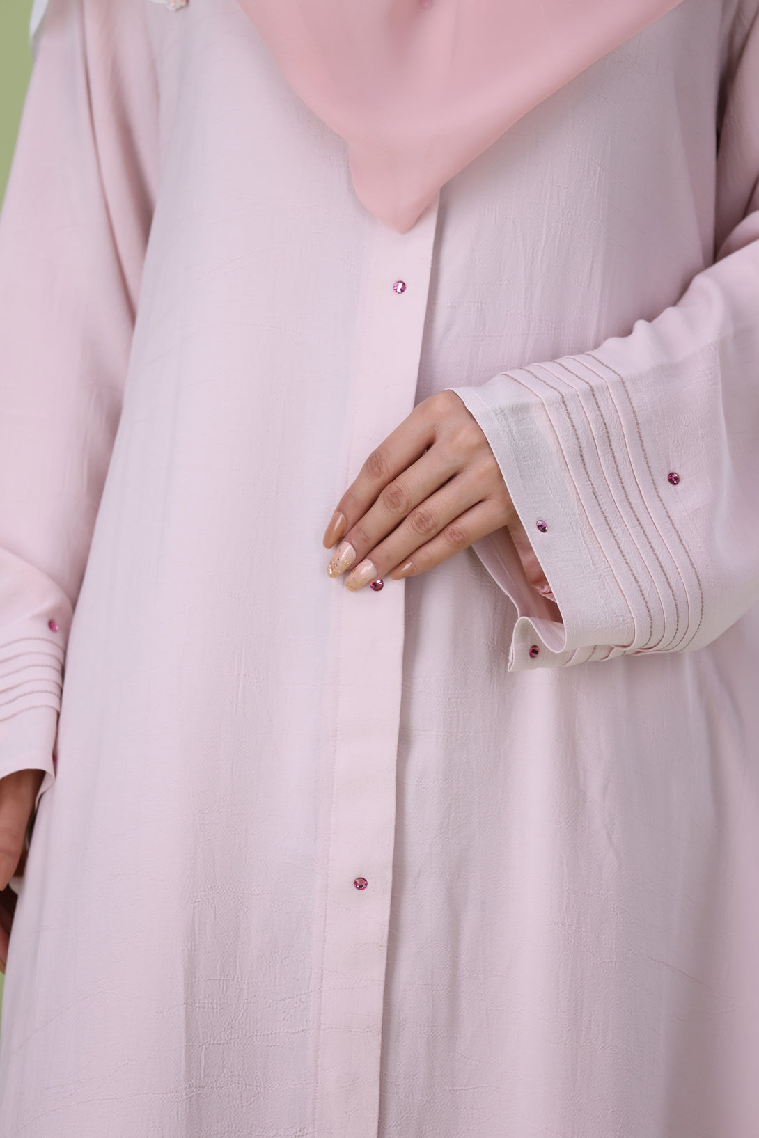 An elegant and sophisticated button-down abaya in a soft pink shade, highlighted by decorative pin tuck stitching and sparkling crystal accents on the cuffs. With scarf.