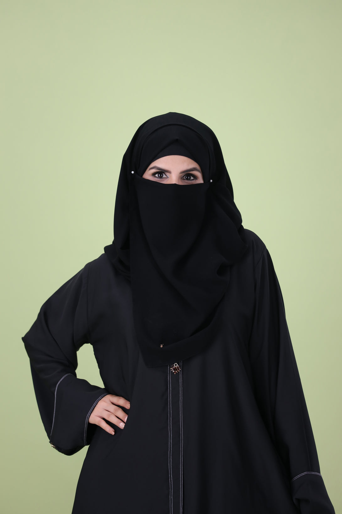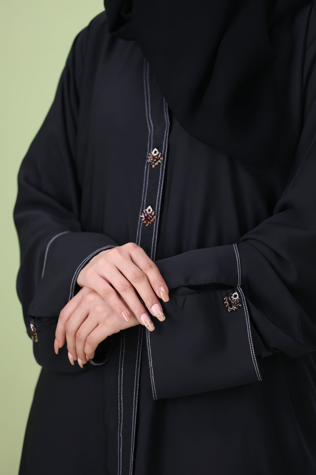 Reveal elegance in our meticulously designed black abaya, crafted in soft lawn fabric with distinctive top stitches and button detailing. Elevate your style effortlessly with this thoughtfully crafted piece, without scarf.