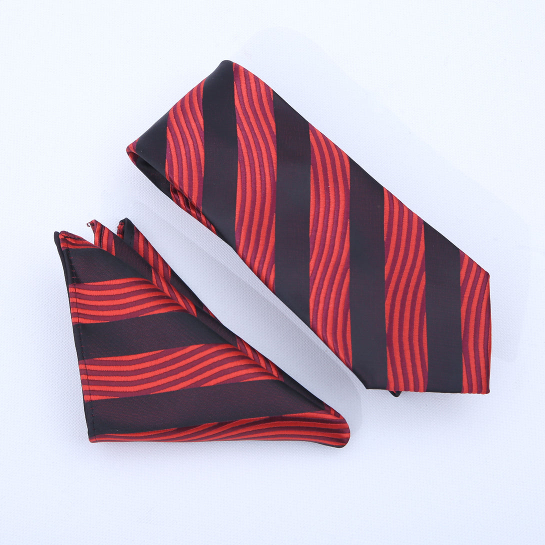 Presenting our bold red tie and pocket square set, accentuated with sleek black lining print. This striking ensemble combines classic sophistication with a modern edge, ideal for making a statement at any formal event or special occasion.