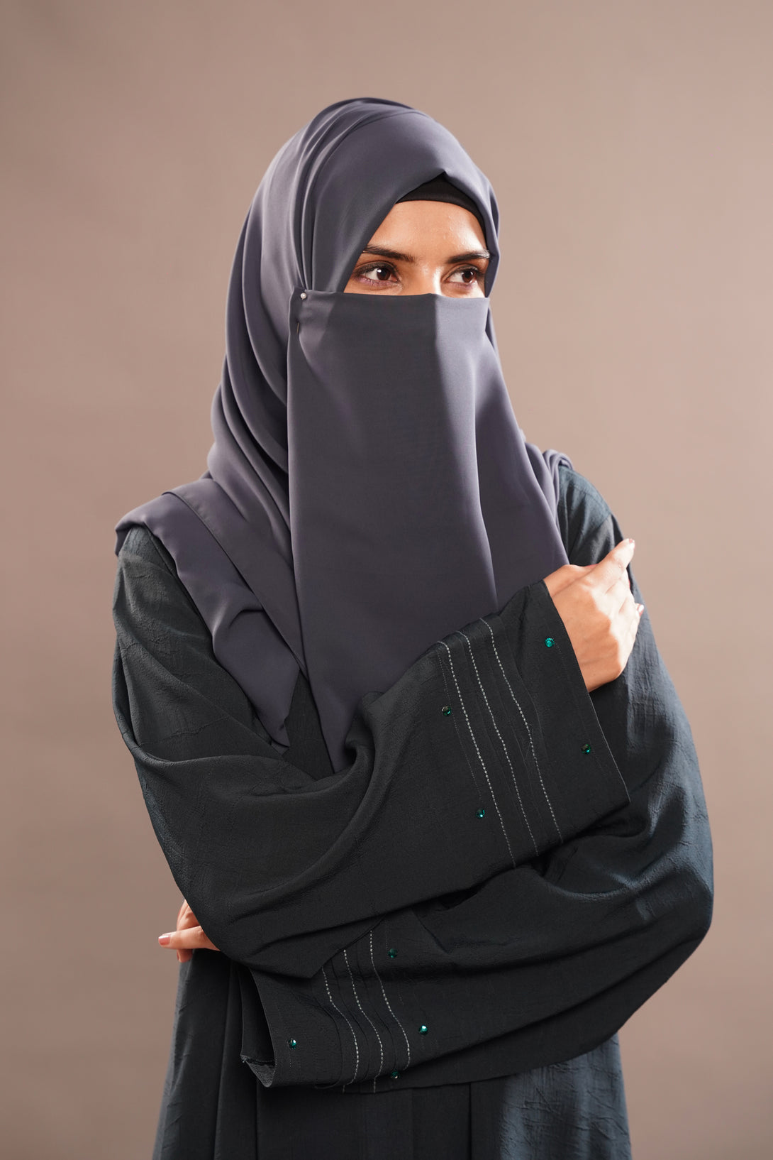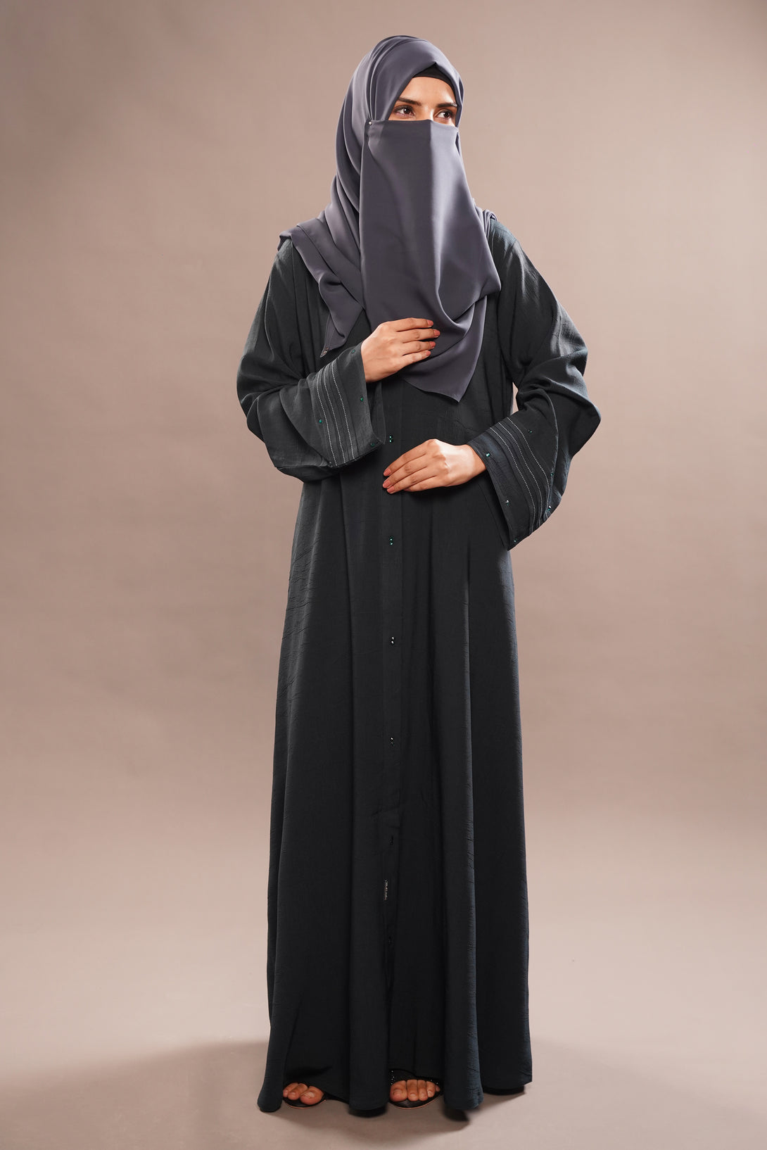 The Midnight green Essence Abaya features a deep, understated shade with a soft textured fabric that offers both comfort and sophistication. The front button down design adds practicality, while delicate detailing on the cuffs.