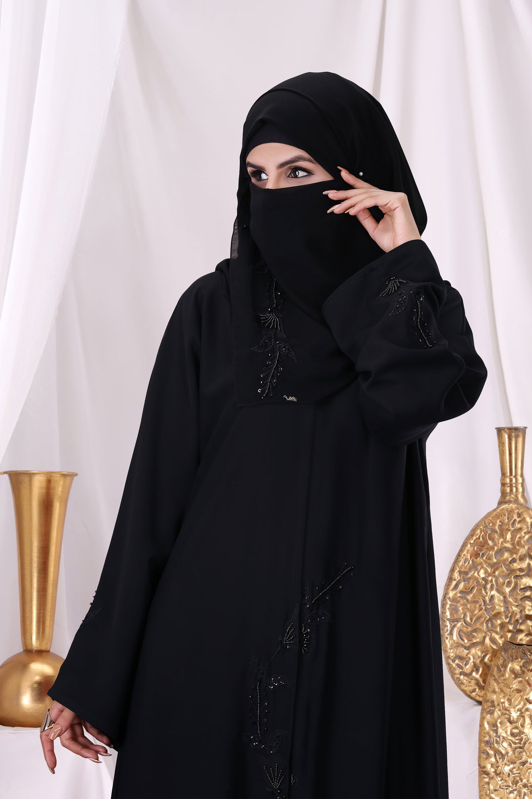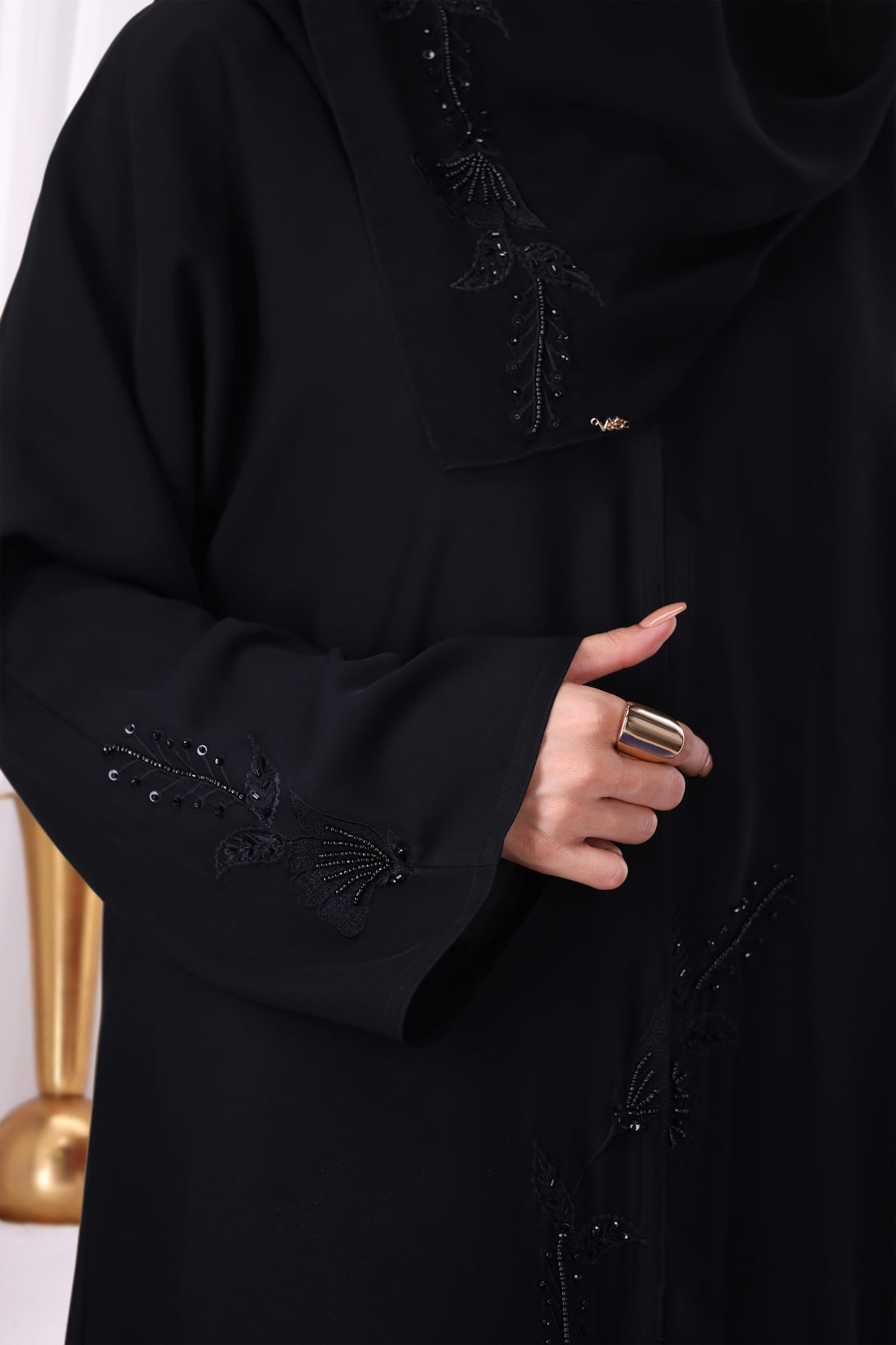 A sophisticated black abaya with beautiful, shimmering black beaded and sequin vine motifs on the front and sleeves for a touch of understated luxury. Included Scarf.