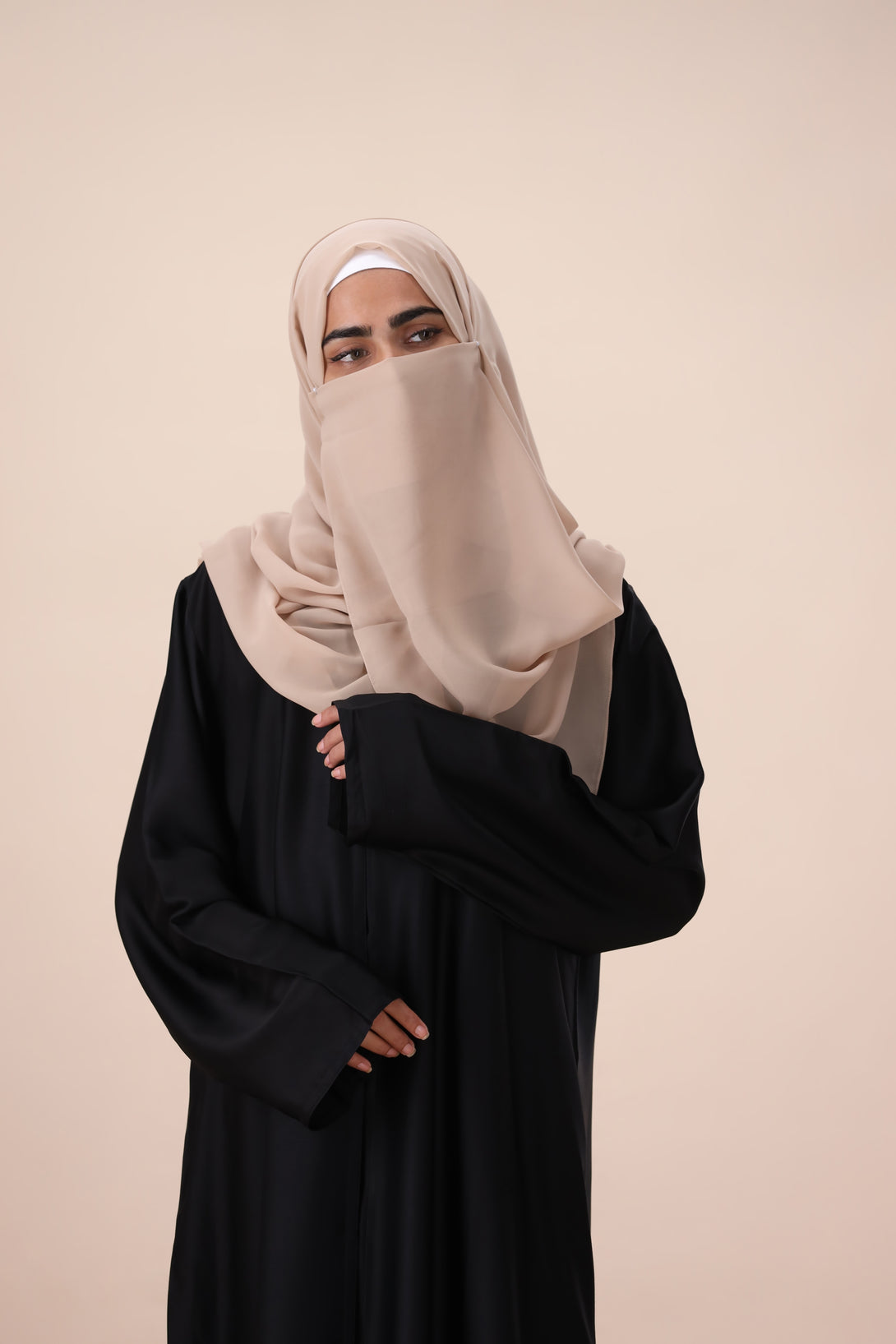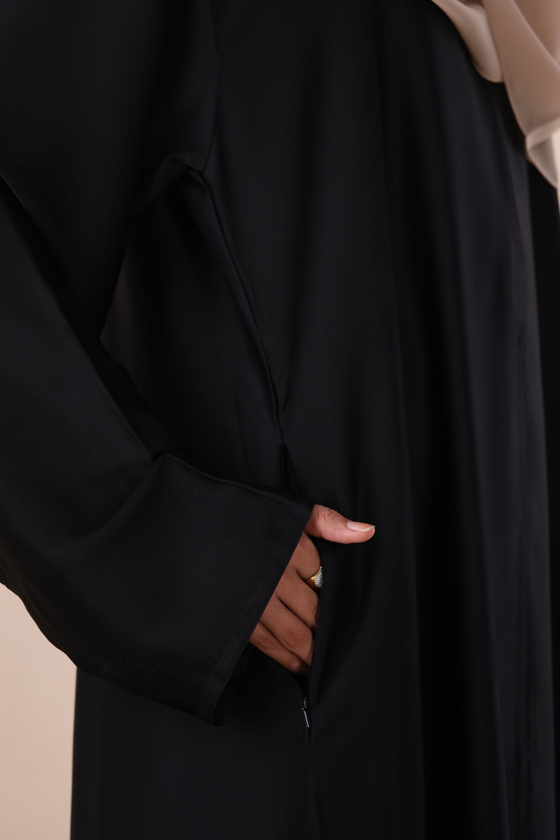 A symbol of classic elegance, this black abaya drapes with a quiet, profound grace. Plain front open with graceful Korean nida fabric. Without scarf.