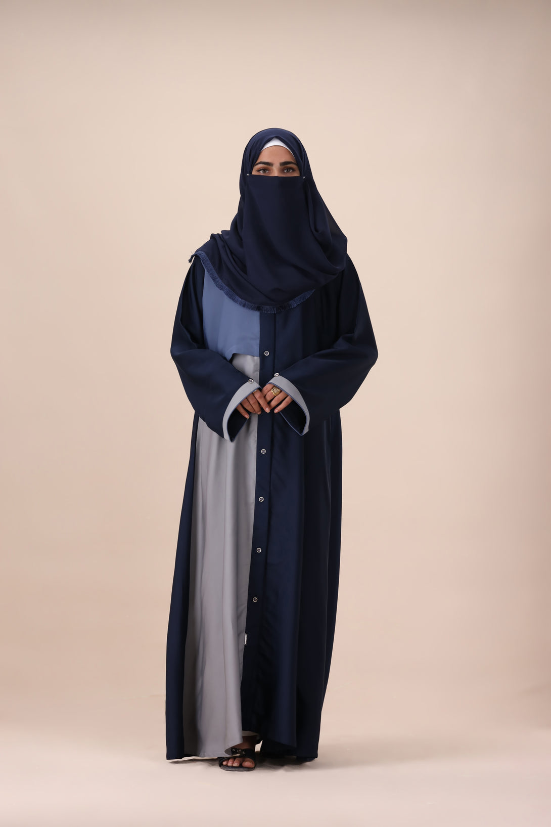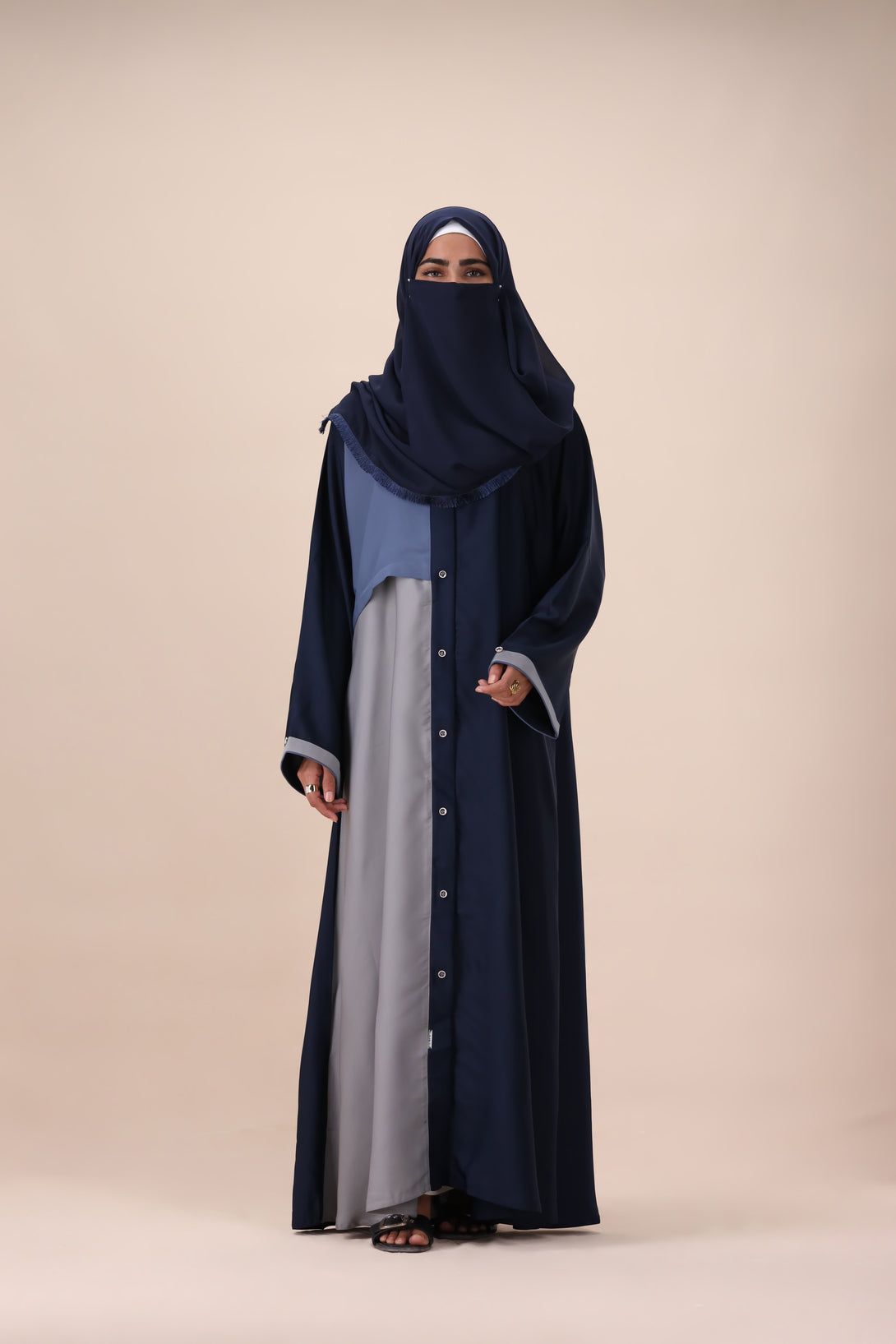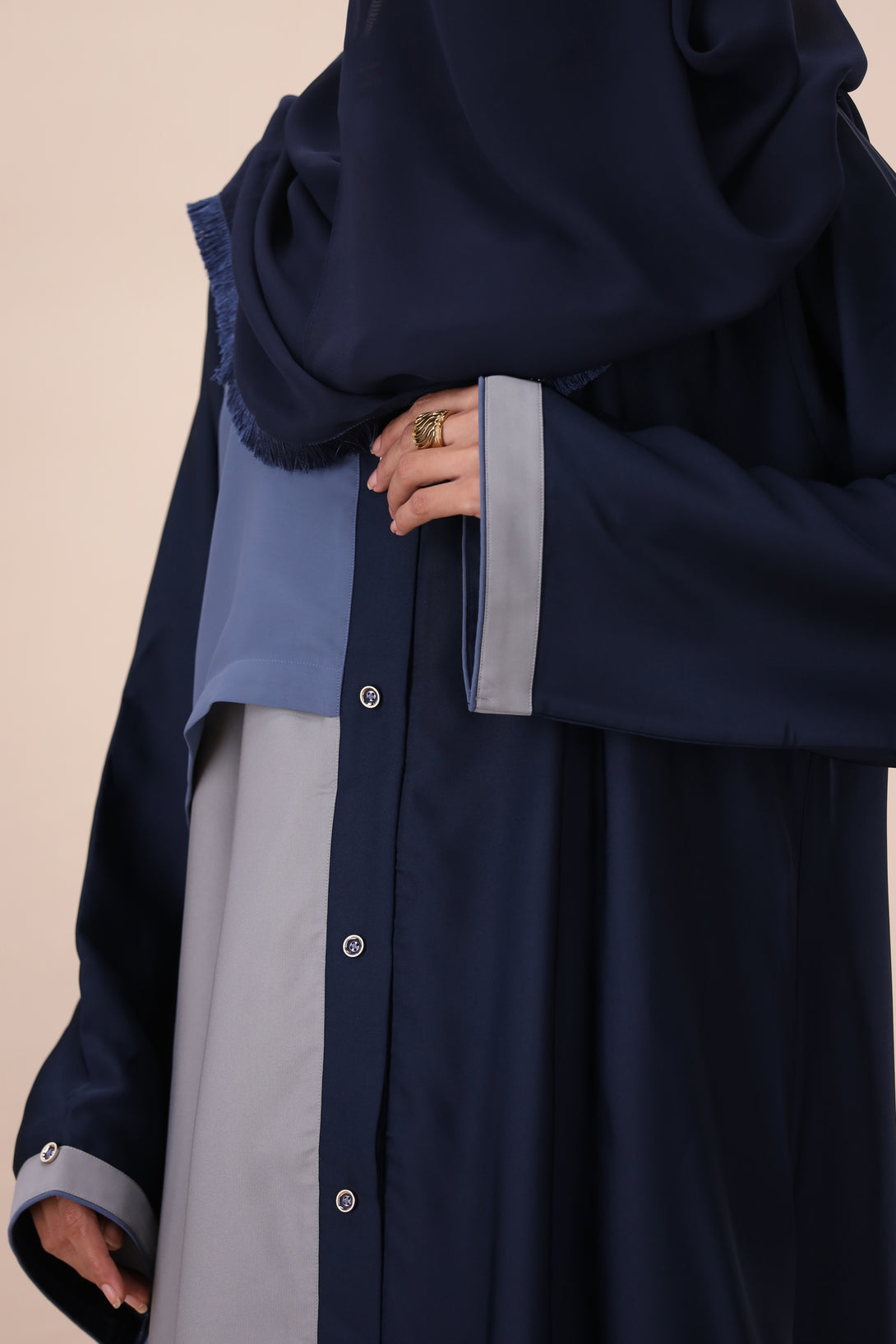The Misty Horizon Abaya blends cool-toned elegance with contemporary flair through its unique color block design. Featuring panels of deep navy, slate blue, and soft grey, this front open style.
