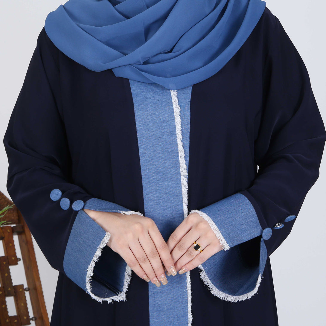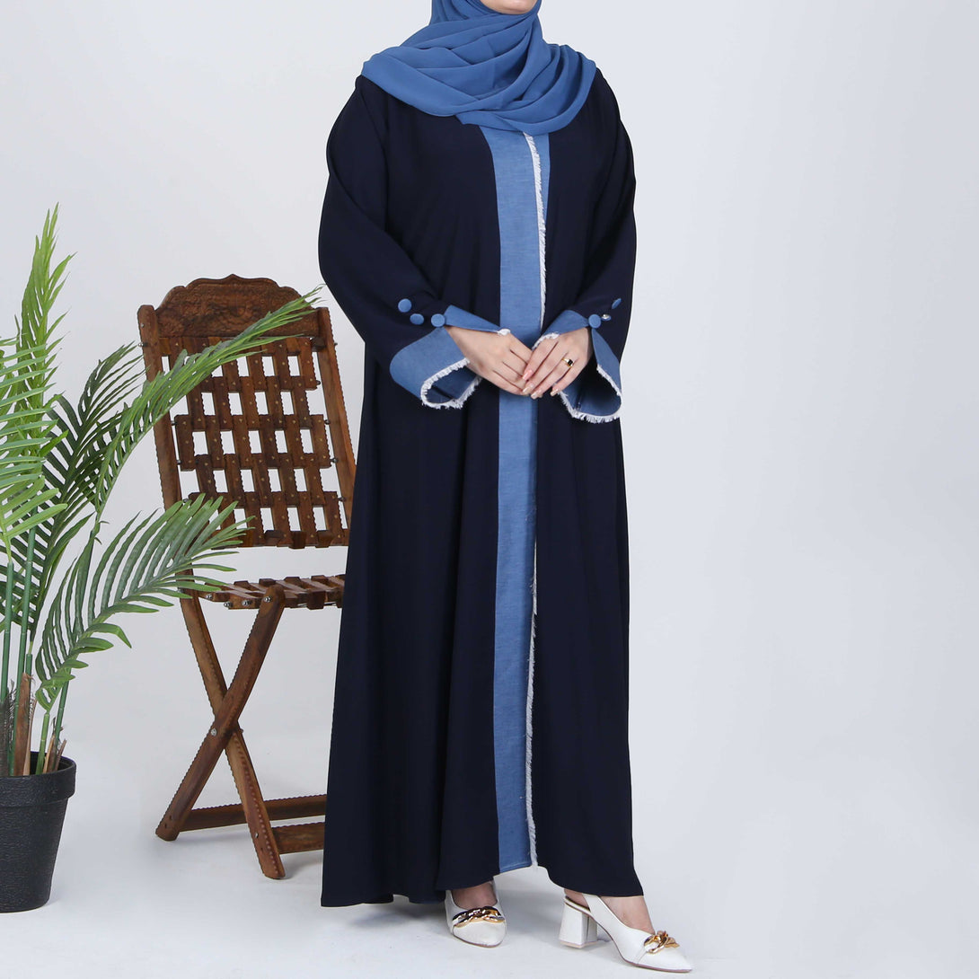 Elevate your look with our navy blue abaya, featuring a faded blue patti on the front and sleeves. The design is completed with elegant buttons on the sleeves, blending classic sophistication with modern details