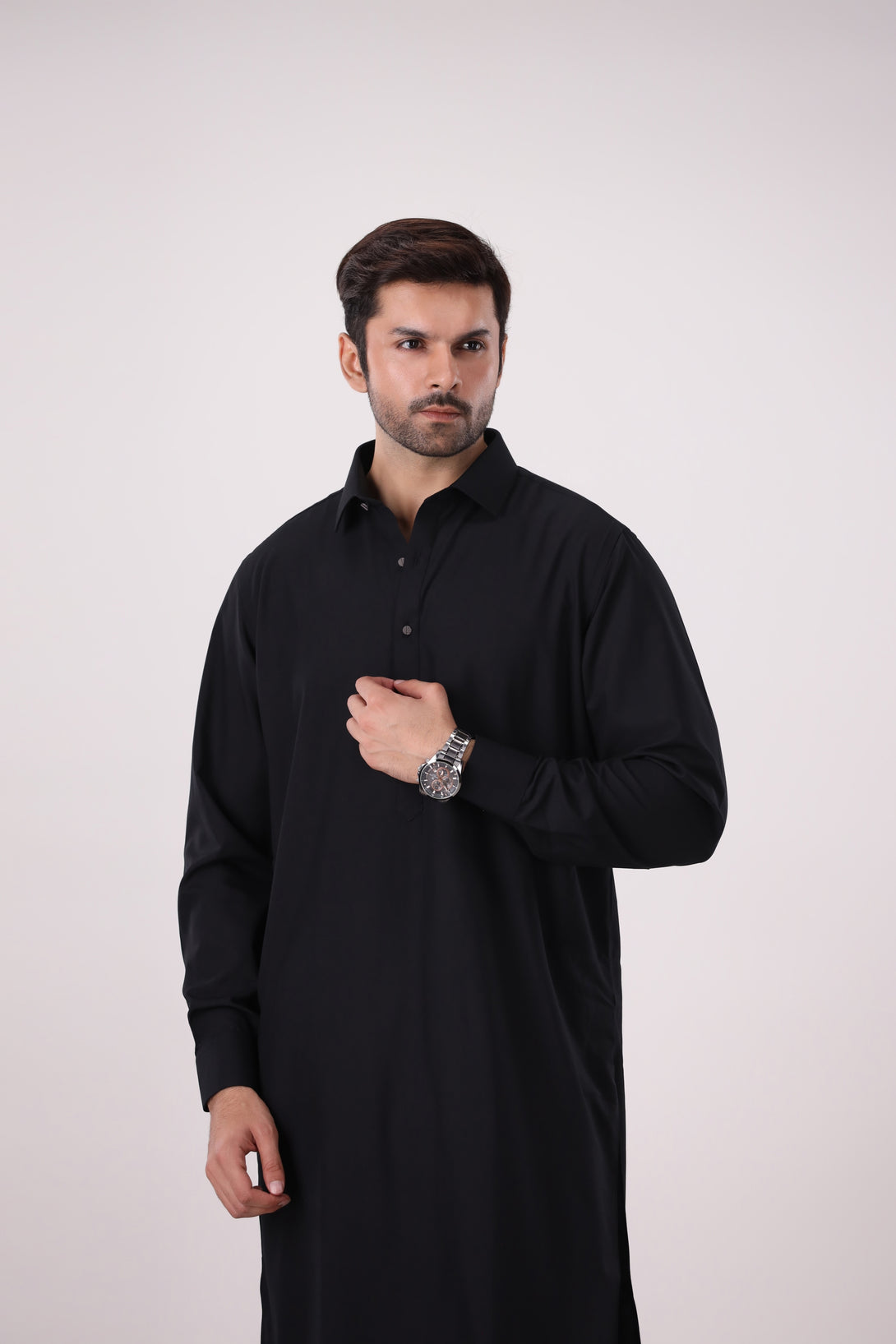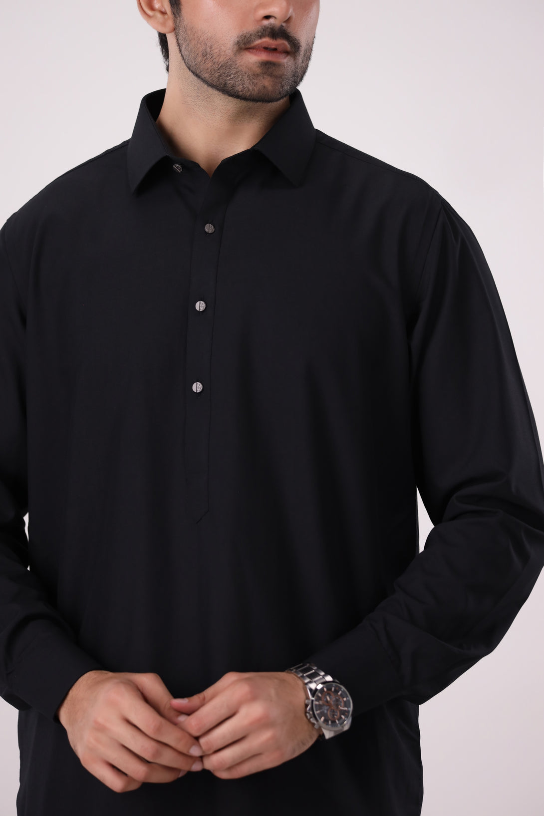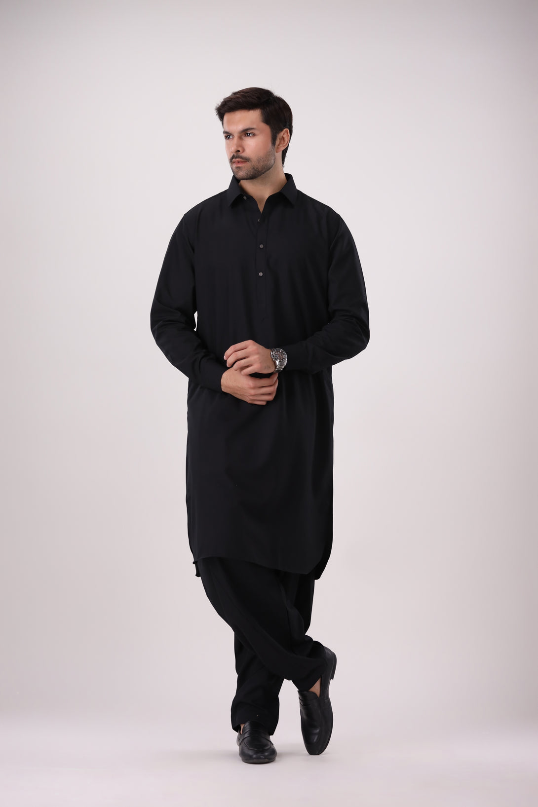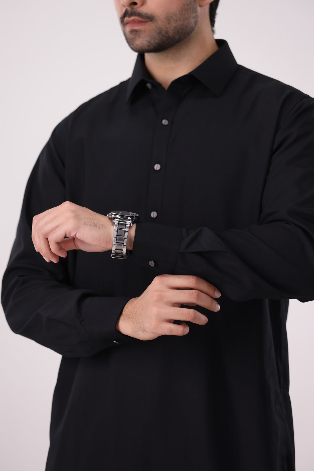 Elevate a timeless classic with this jet black suit, featuring striking polished steel buttons for a modern, sophisticated edge.