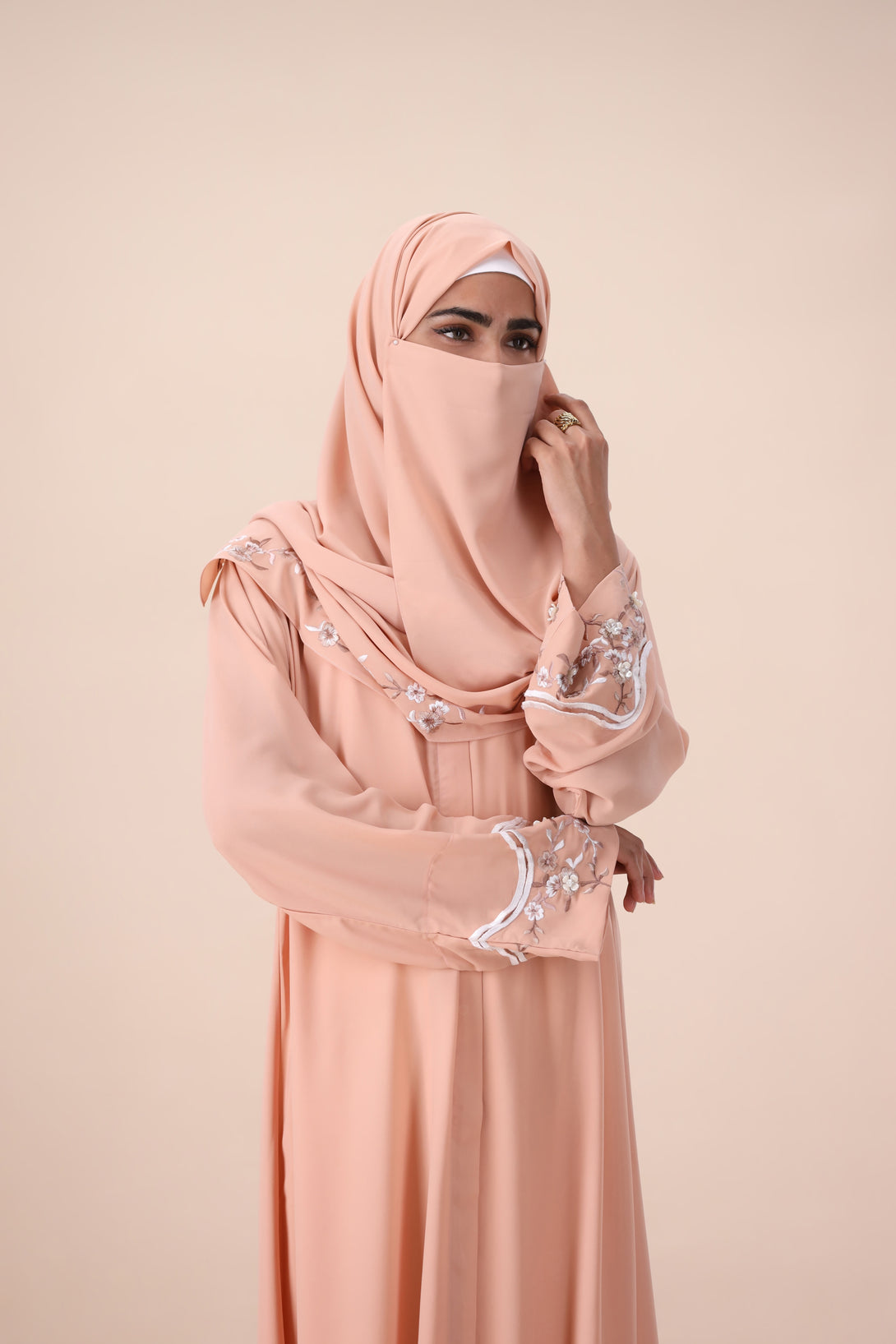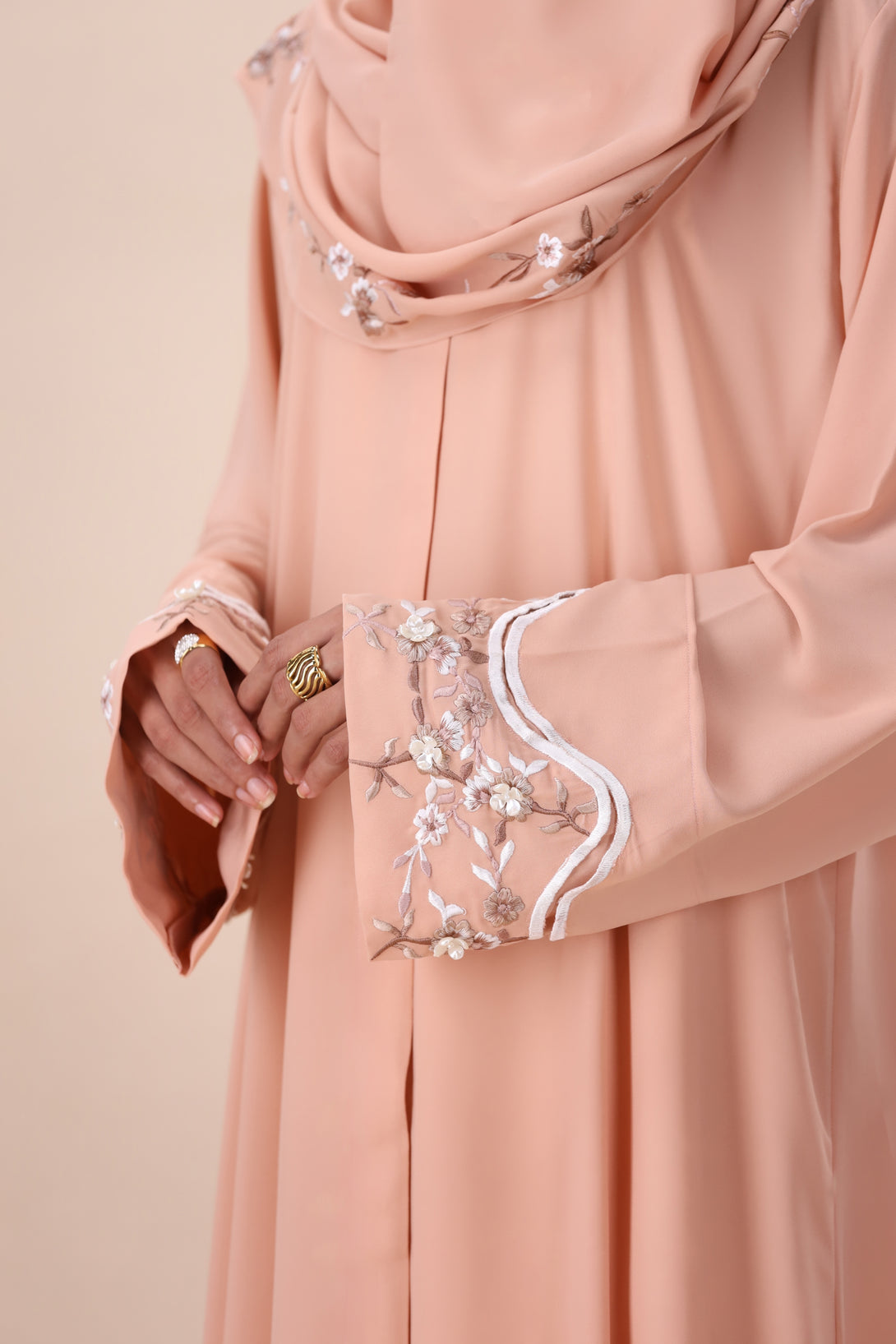 An elegant blush-toned abaya featuring delicate floral embroidery, offering a graceful and sophisticated look for any occasion. Included scarf.
