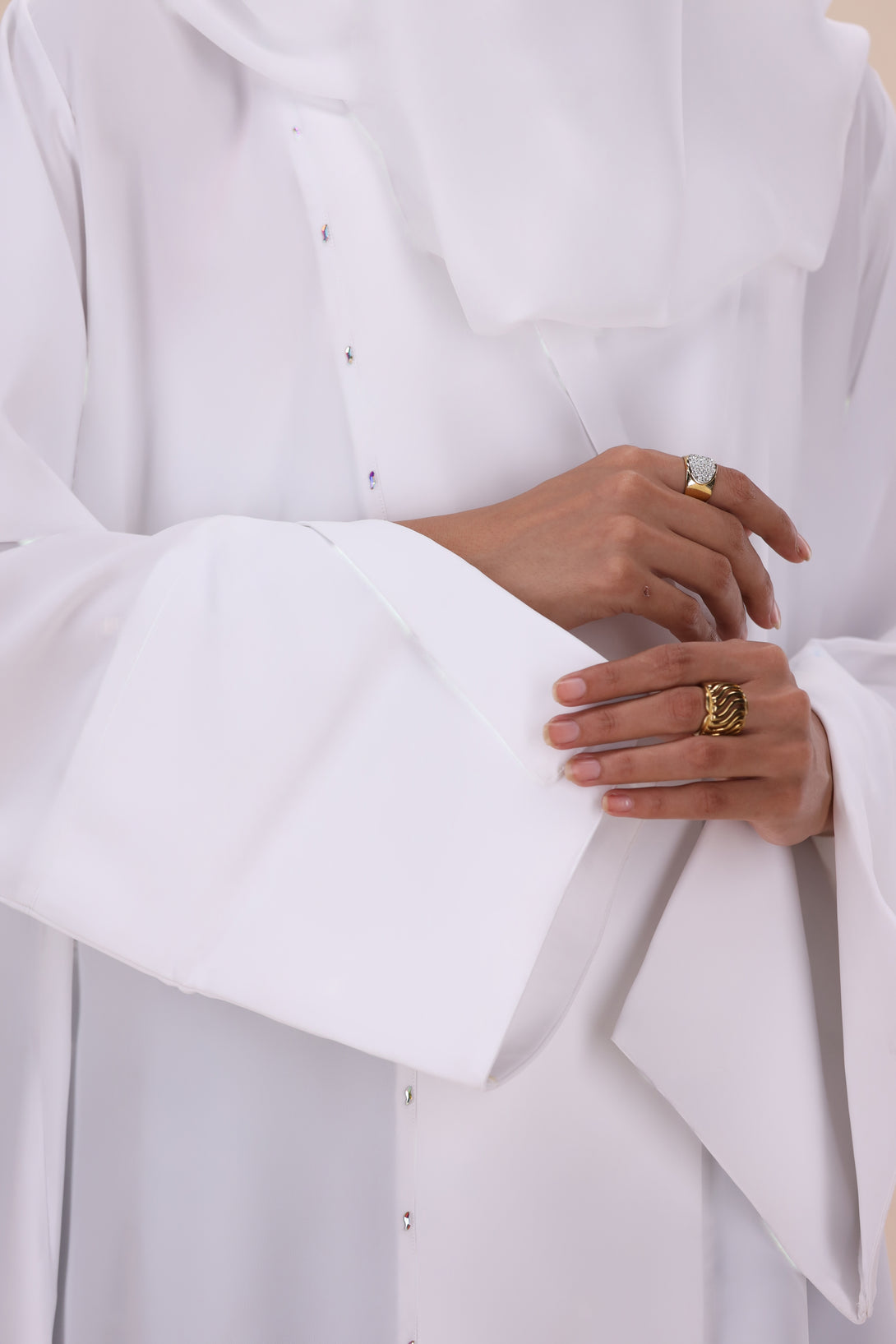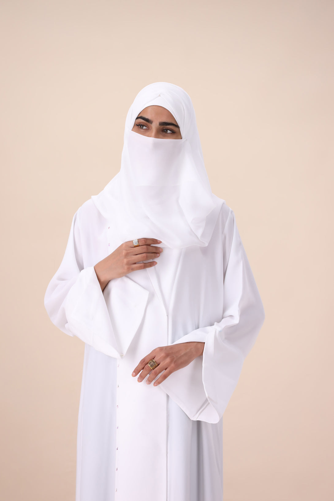 A masterpiece of simplicity, this white abaya is adorned with delicate details that trace a line of luminous, modern grace. In Korean nida fabric included scarf.