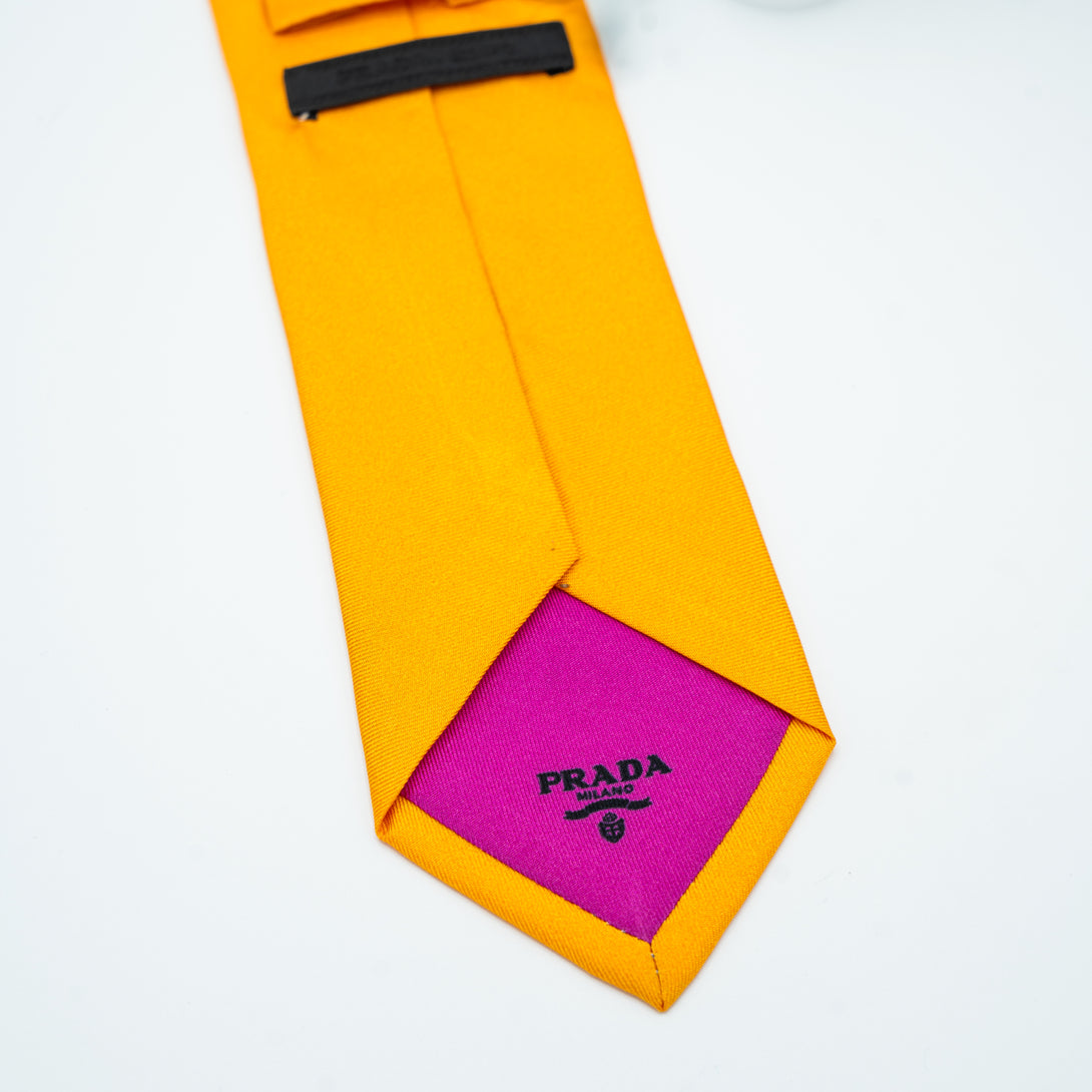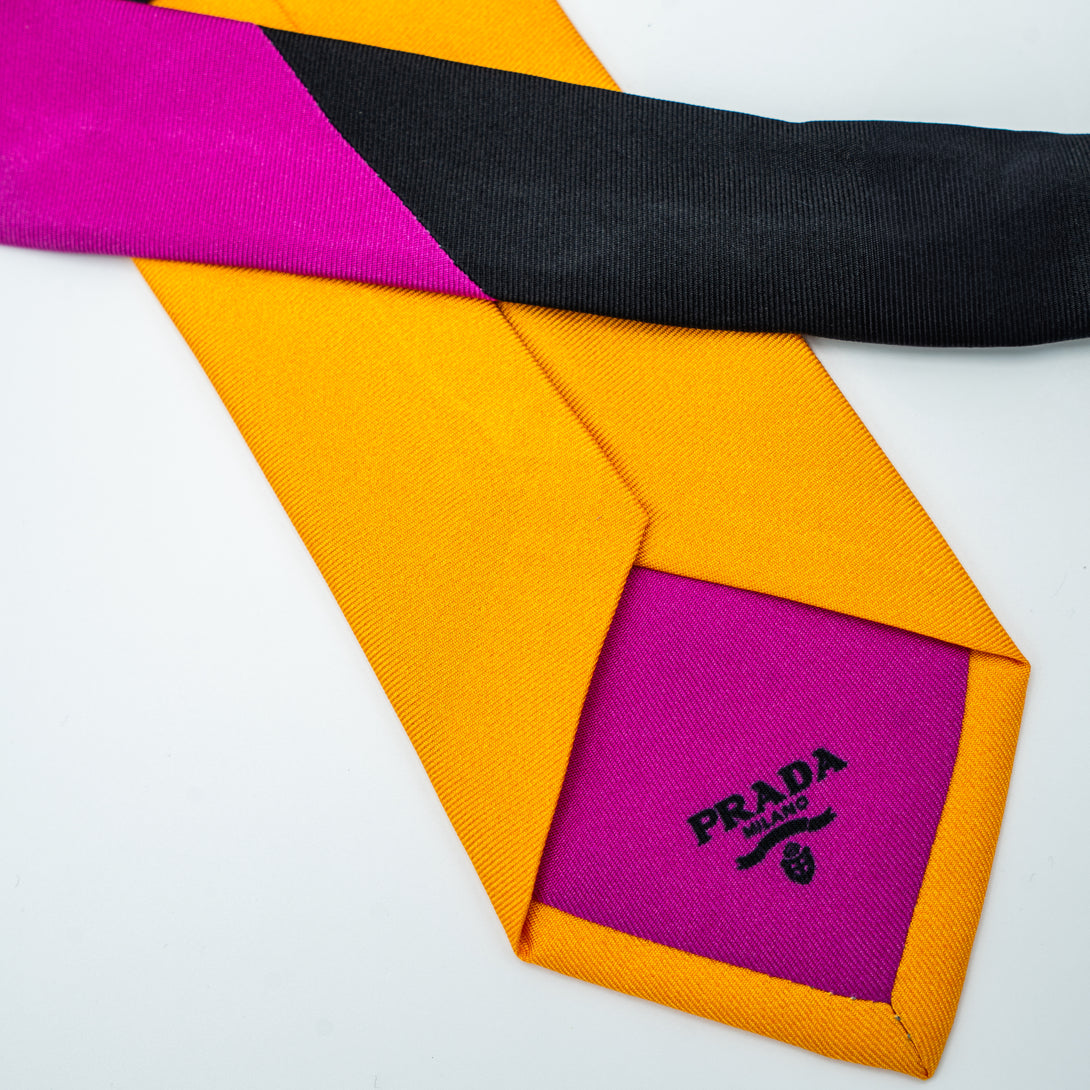 Make a bold statement with this vibrant Prada tie, featuring a striking color-block design of mustard, black, and hot pink for a truly modern look.