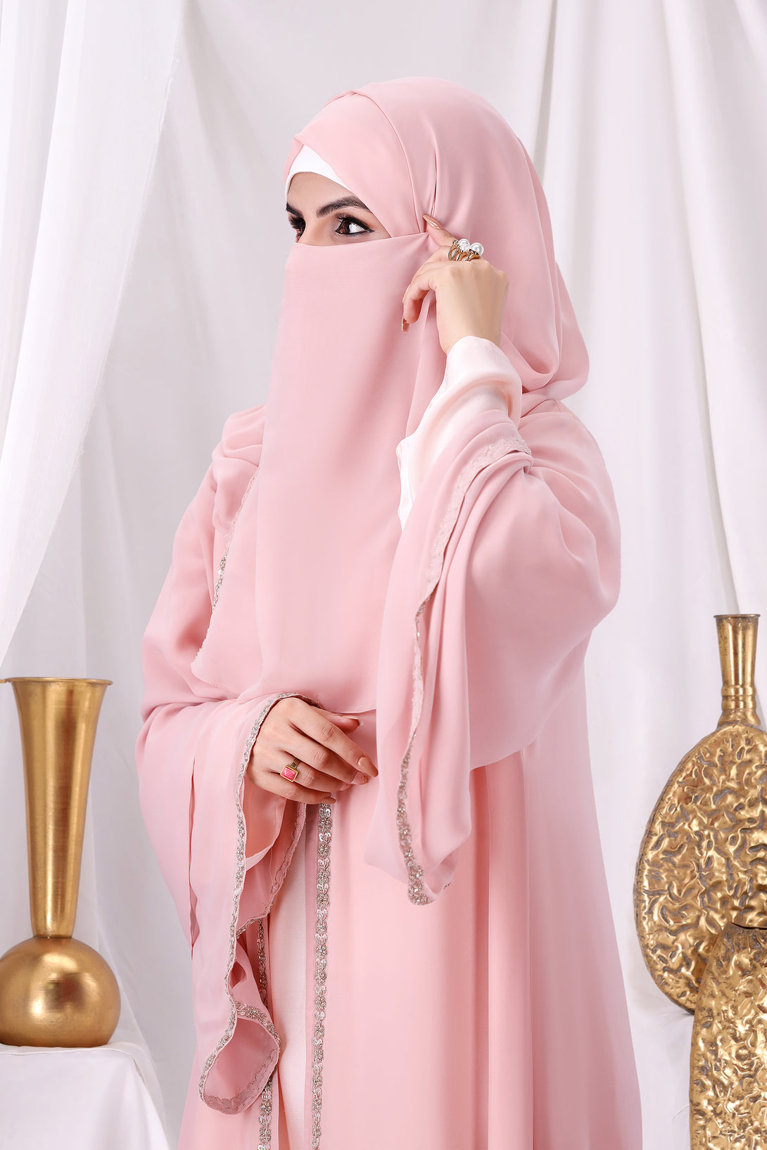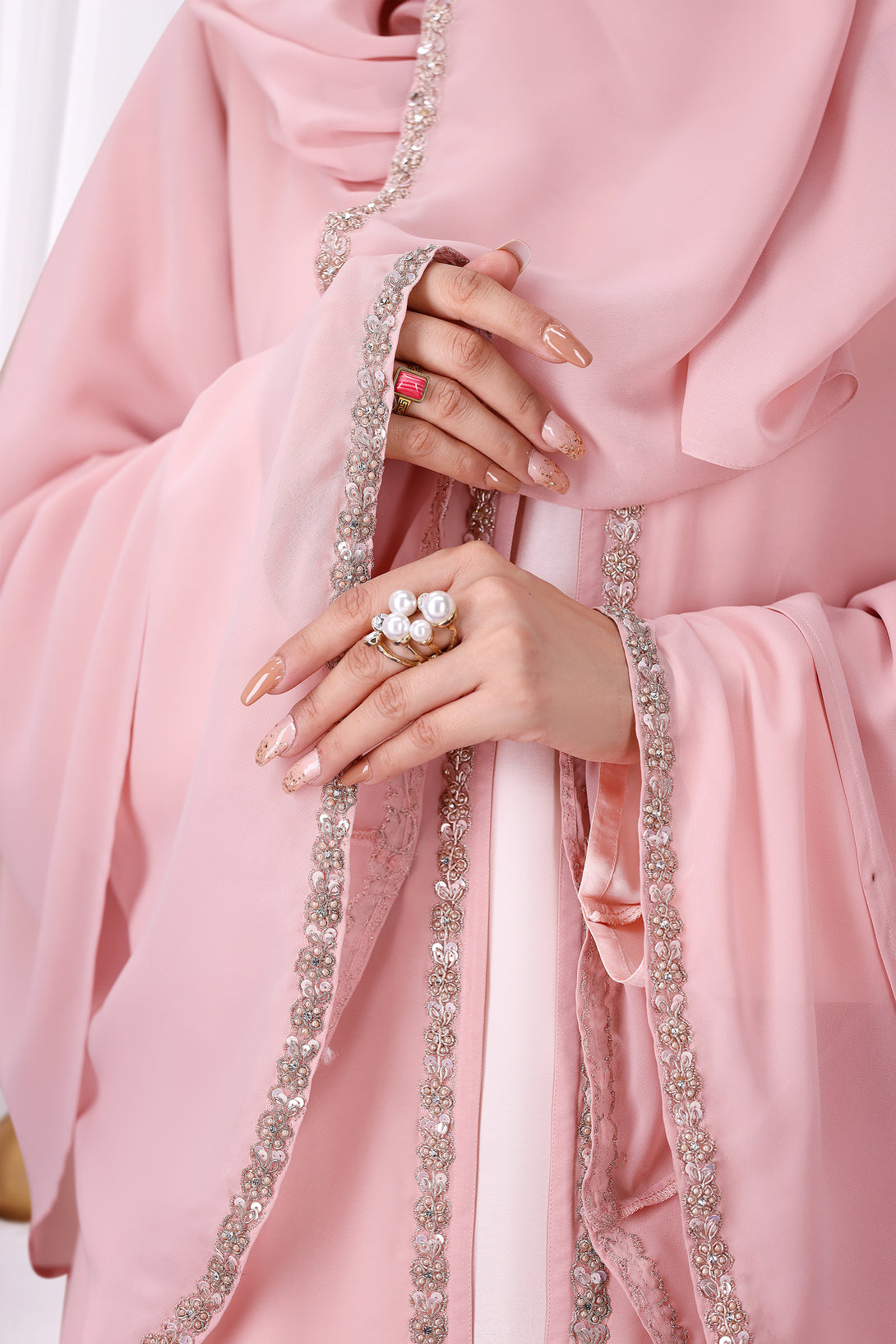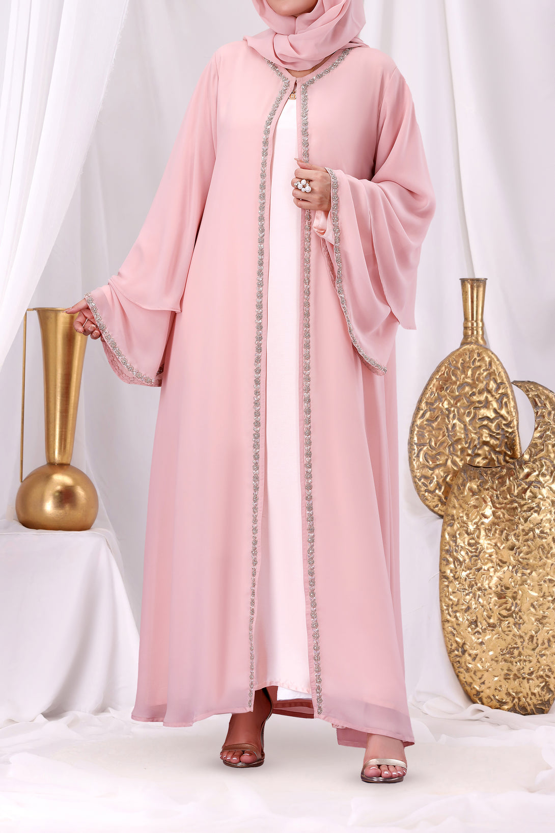 An elegant and sophisticated abaya in a delicate rosé shade, distinguished by its flowing silhouette and sparkling beaded trim on the front opening and sleeves. Included Scarf.