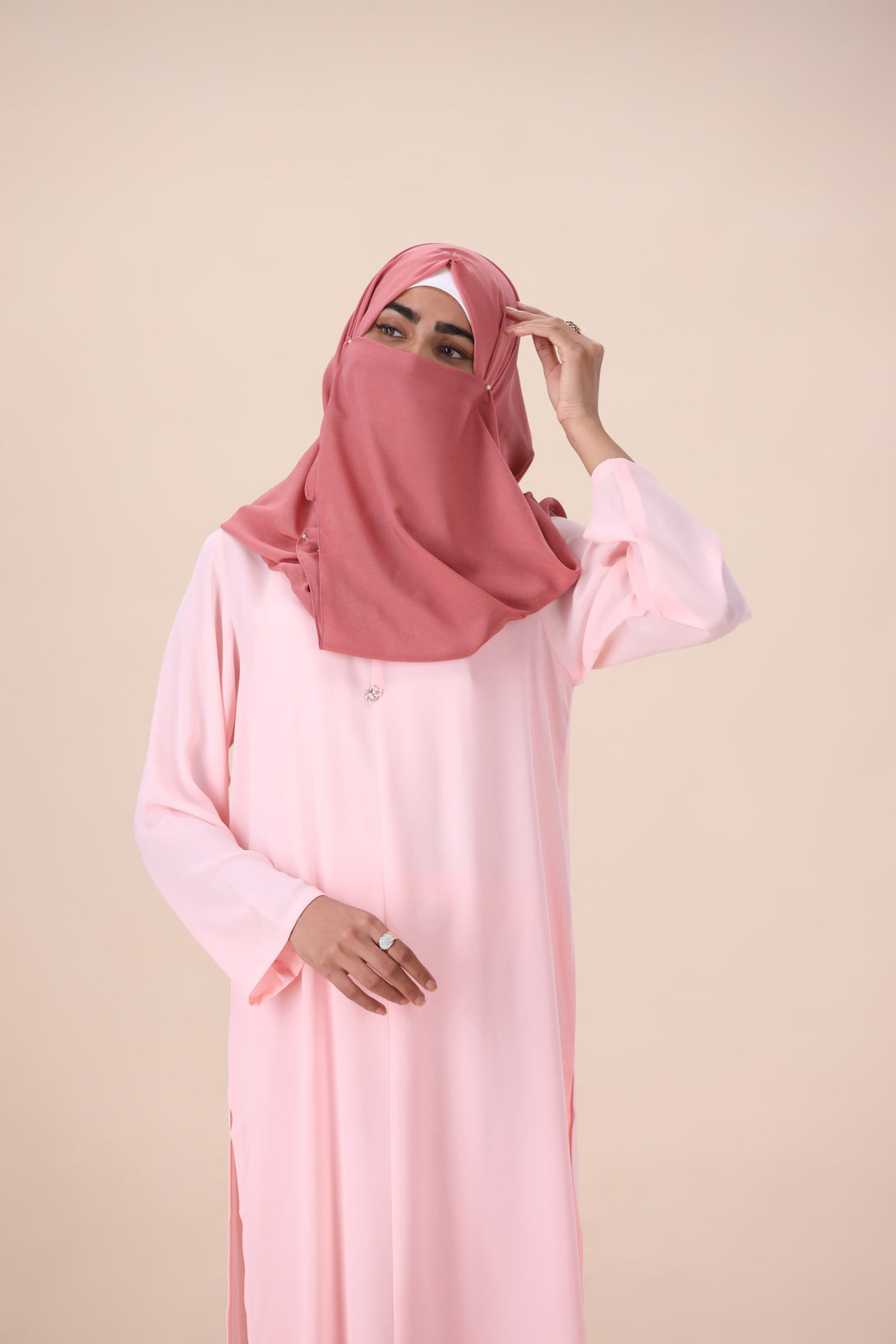 A whisper of rose and a gentle flow, this ensemble redefines modest style with soft sophistication.