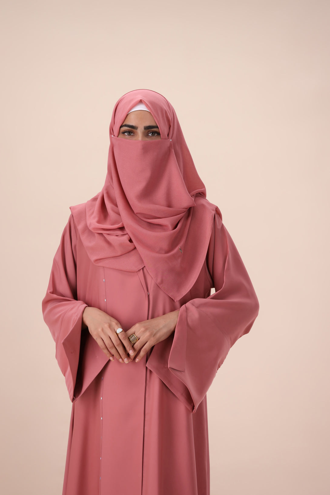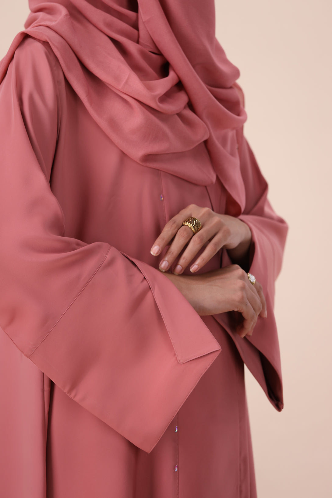 A stunning front-open rosewood abaya adorned with a delicate line of crystals, designed for a radiant and graceful look. Included scarf.