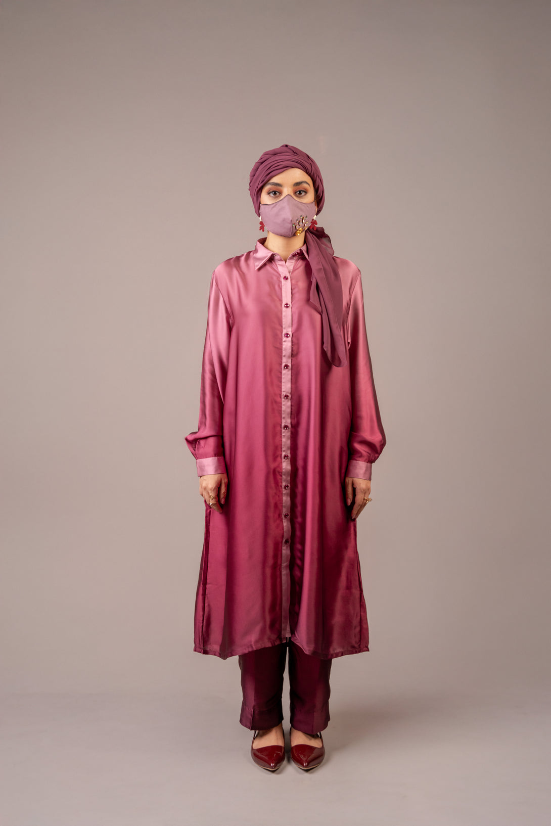nfuse glamour into your everyday look with the Rosewood Shine Co Ord Set, designed in a luxurious, satin finish fabric. The set features a long, button down tunic with a shirt collar and full length, creating a sleek and graceful silhouette.