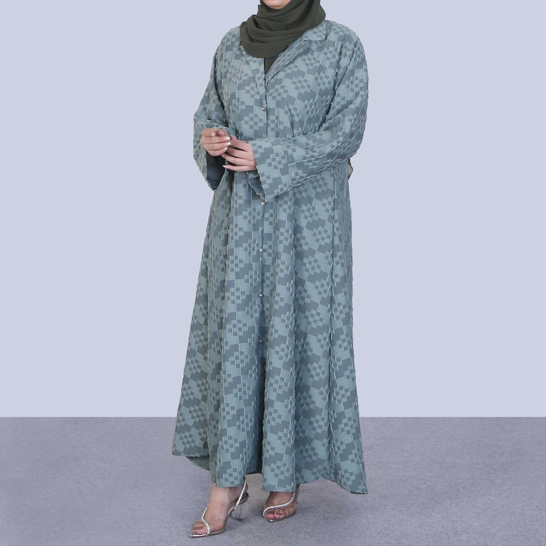 This coat-style abaya features a sophisticated design with an offering versatility and elegance. The coat-like silhouette adds a chic and stylish touch, making it ideal for various occasions. The soft grey enhances its understated beauty. WithouT scarf.