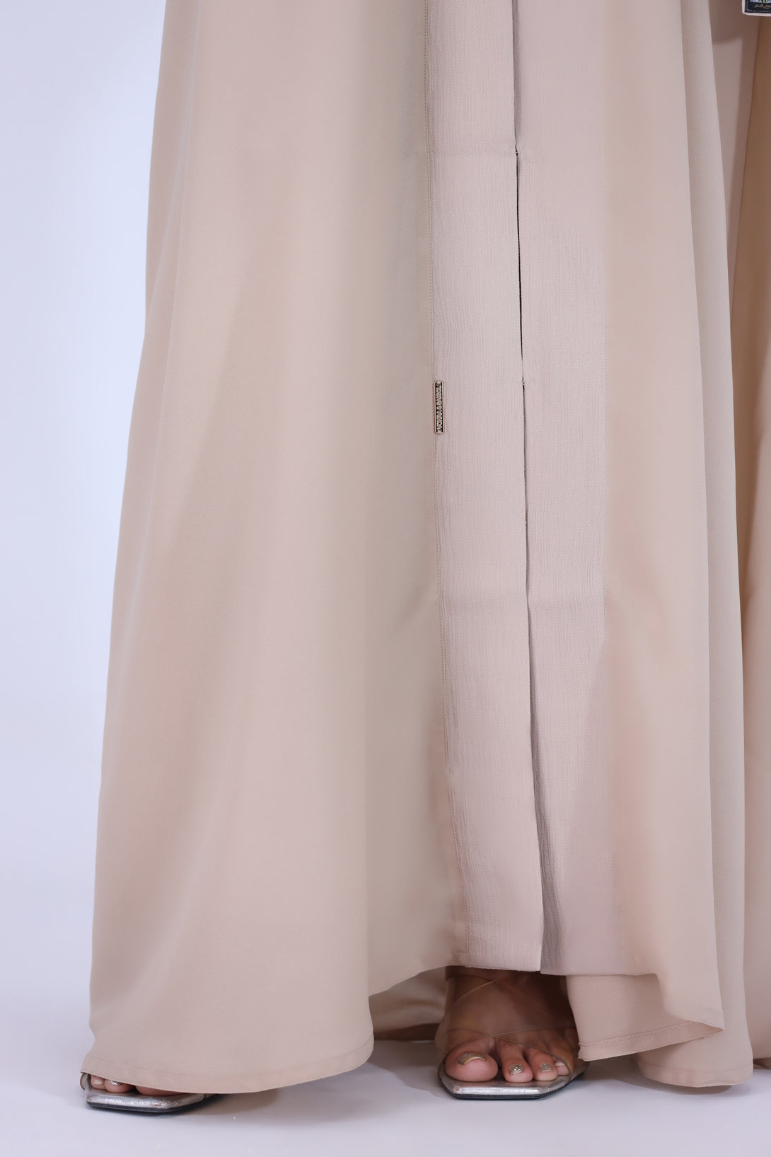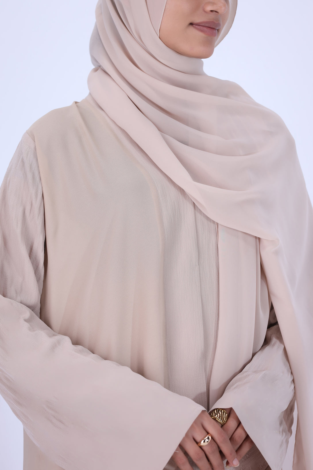 Embrace natural warmth with this sandstone-hued abaya, defined by its fluid drape and unique tonal textured panels. Scarf is not included.