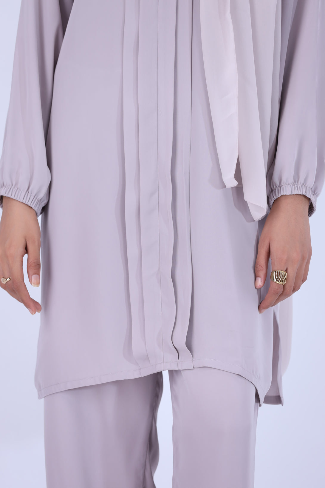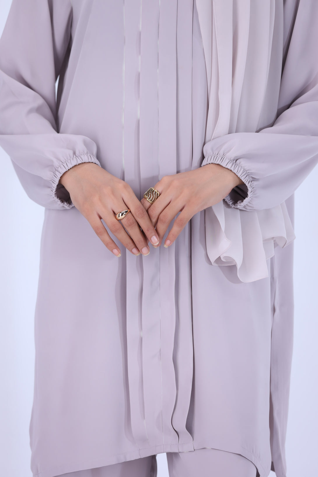 A breath of fresh air in soft lilac, featuring sophisticated central box-pleats and gathered bishop sleeves for an effortlessly graceful look.