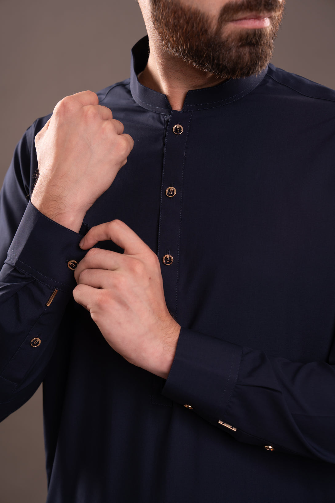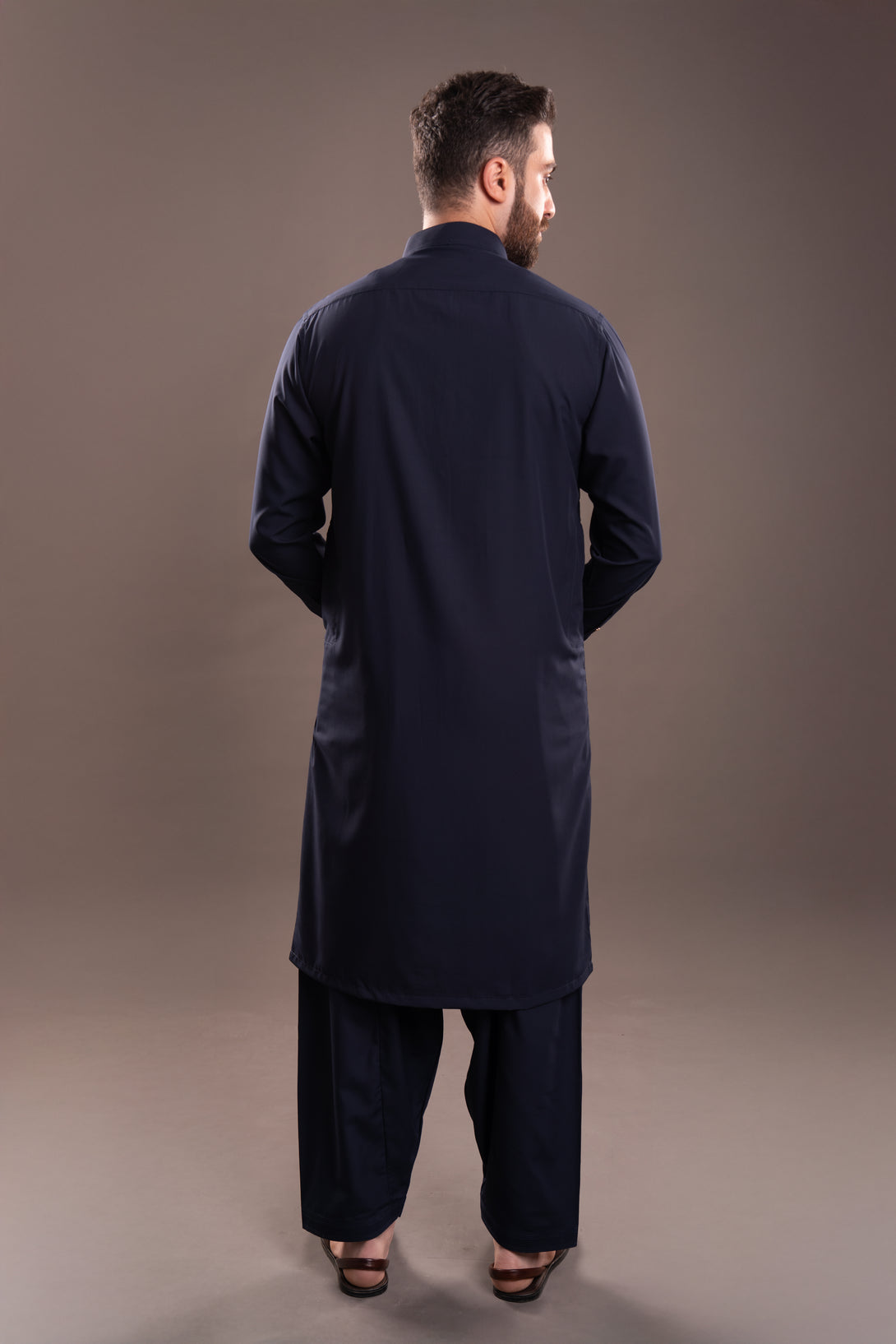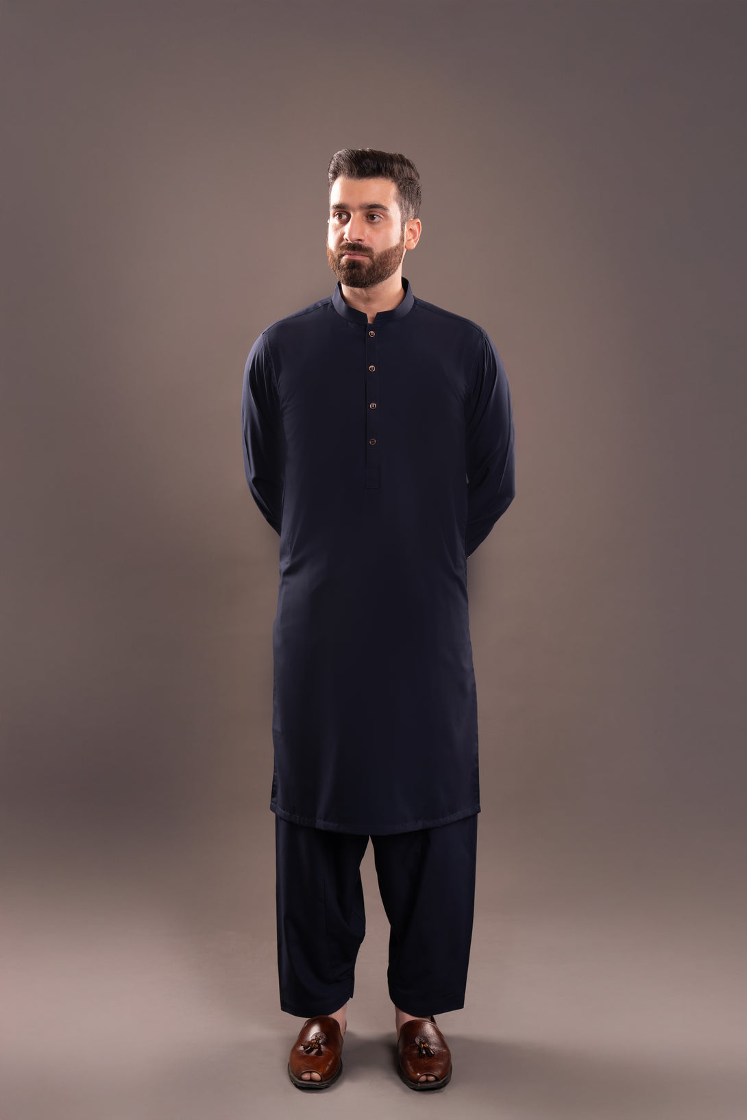 Elevate your style with our Navy Blue Shalwar Qameez, crafted for a sharp and graceful appearance. This refined piece features a stylish band collar and button detailing on the neckline, giving it a modern yet traditional vibe.