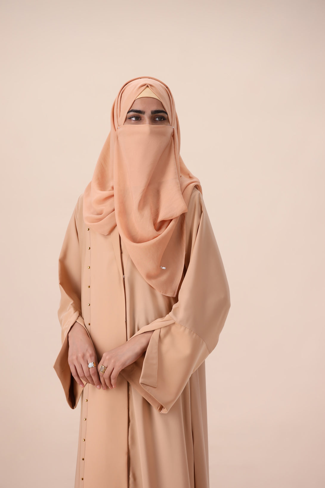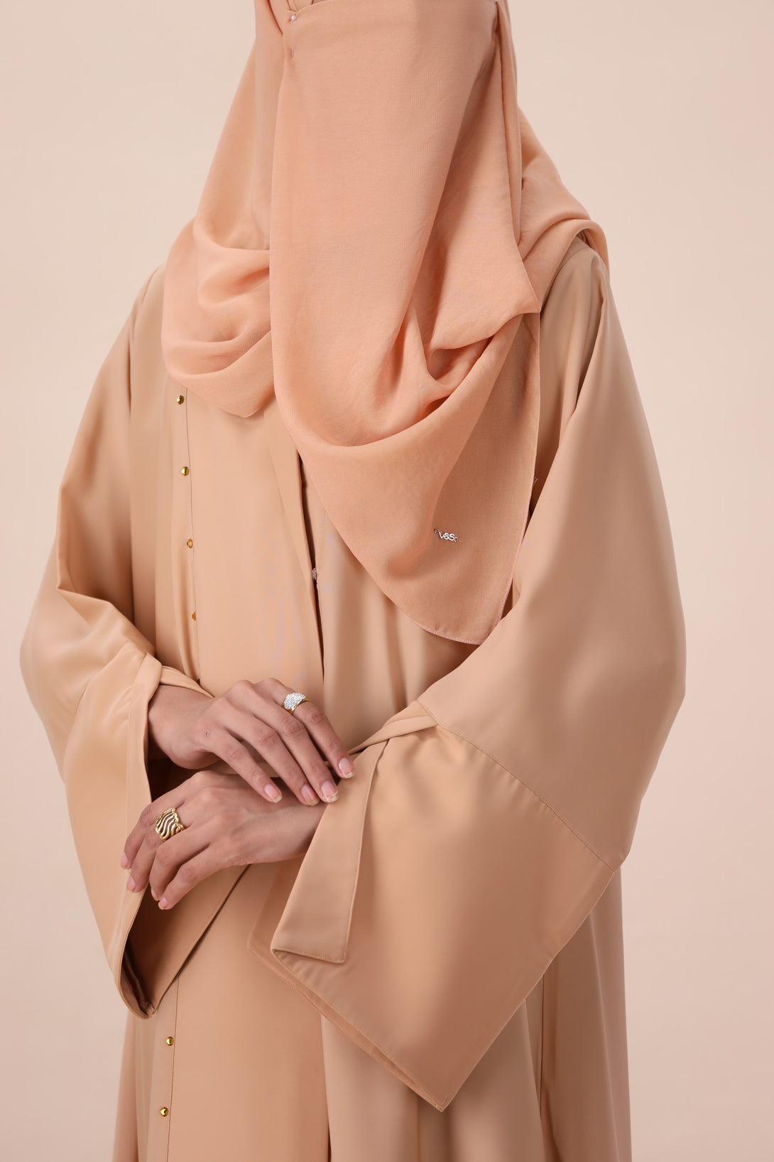A timeless ode to soft femininity, this abaya flows with the warm, gentle light of a sunset. Imported stones in front of abaya in korean nida fabric without scarf.