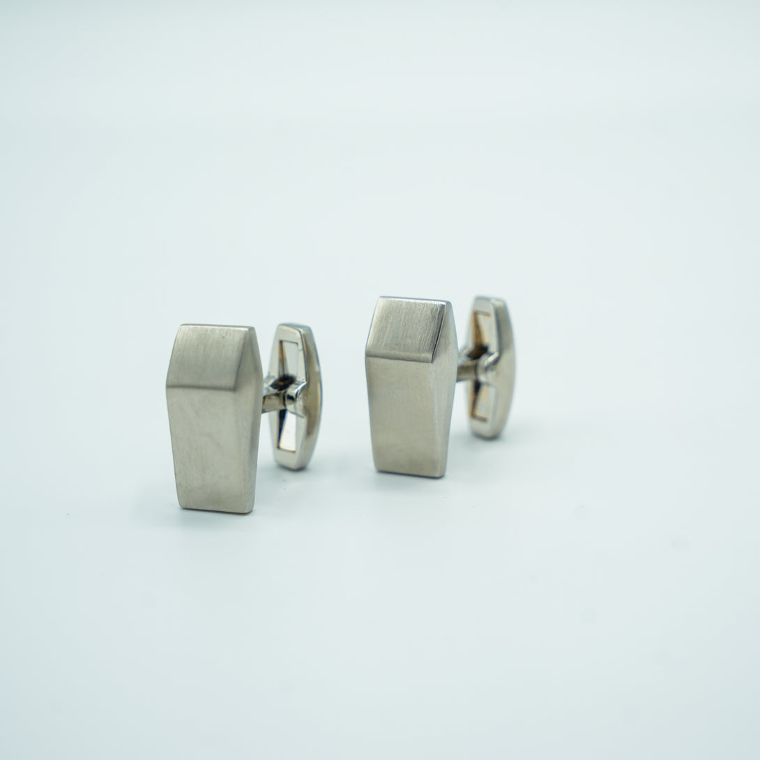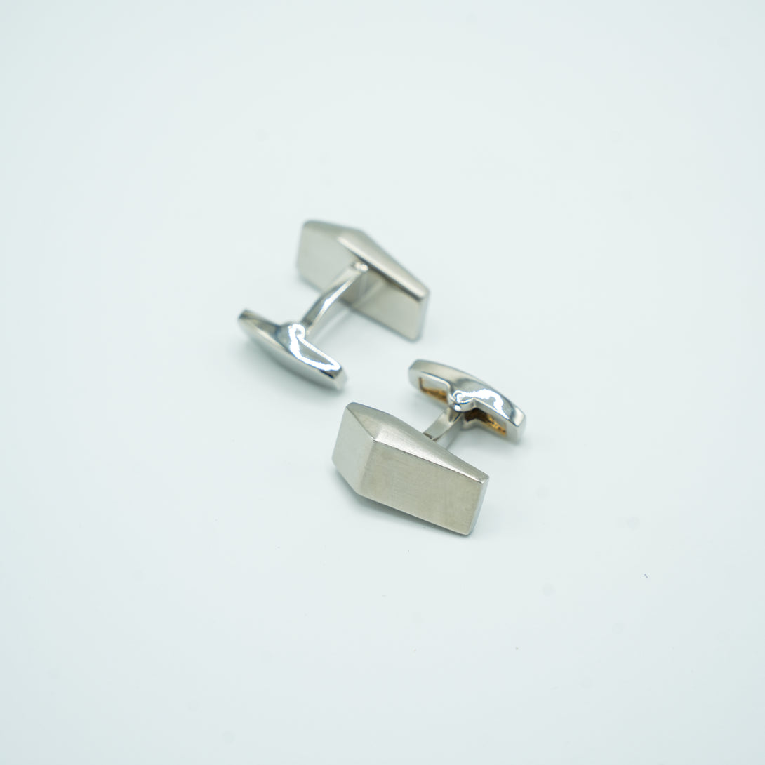 These cufflinks are a masterful blend of modern geometry and classic sophistication, mirroring the sharp angles of a tailored suit.