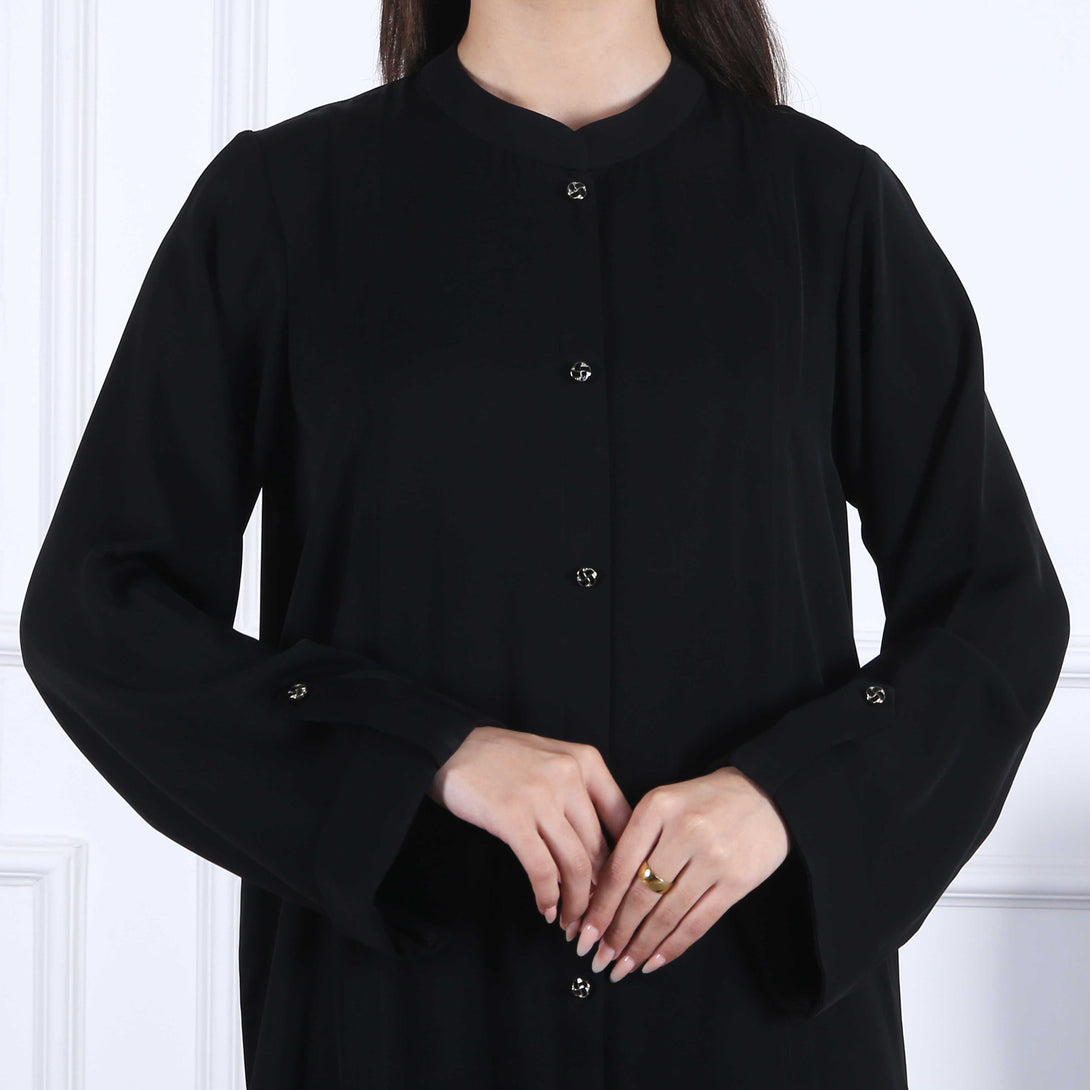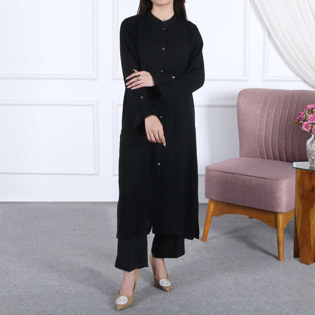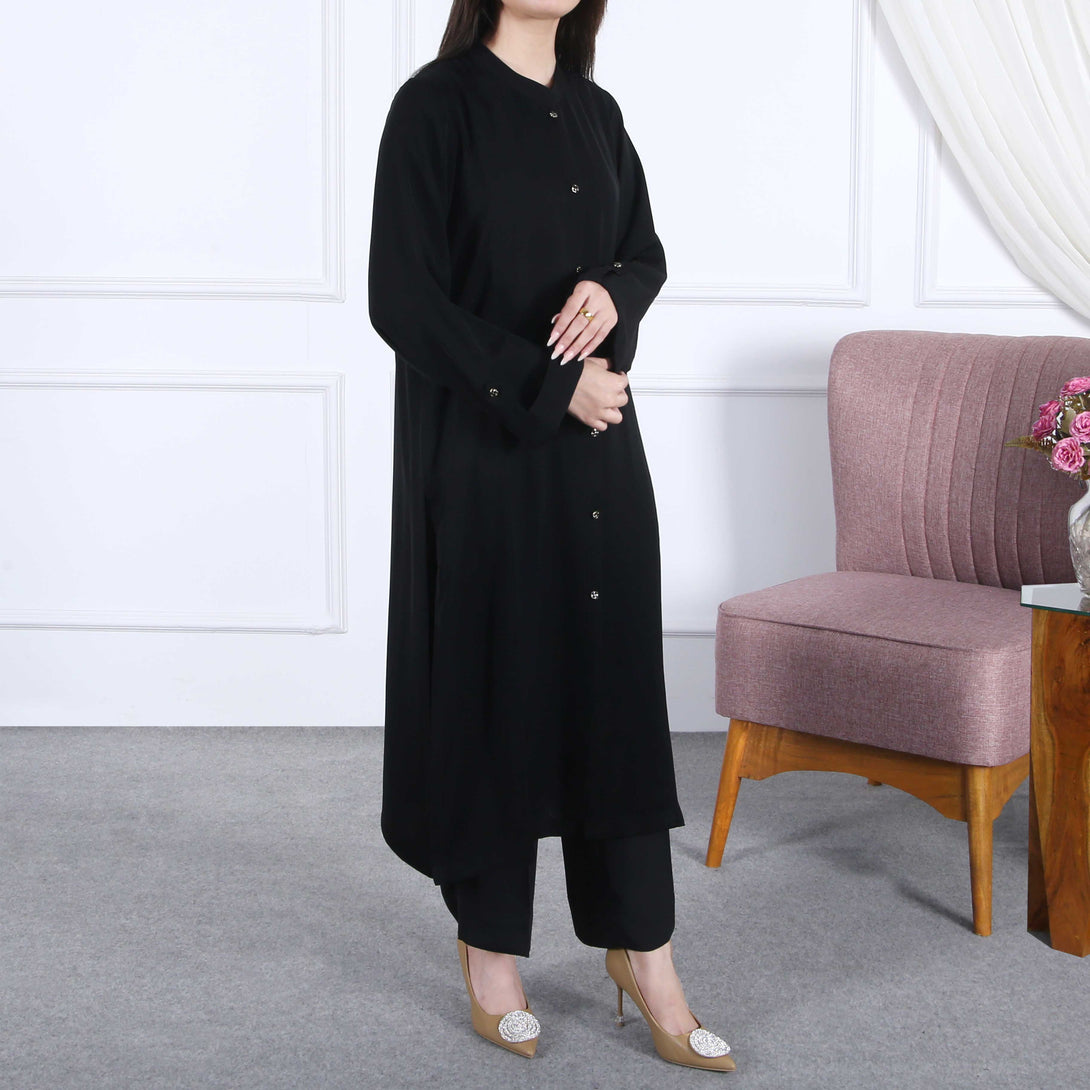 This black simple pret suit features a front-open style shirt with elegant button details on both the shirt and sleeves, paired with a matching trouser. The clean, minimalist design offers a sleek and sophisticated look.