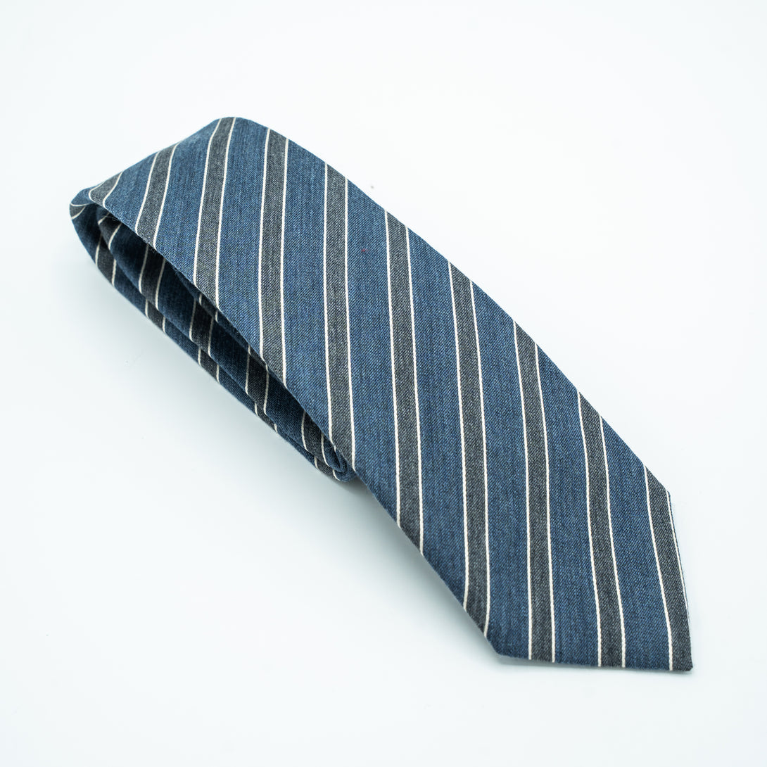 Achieve a sophisticated look with this multi-striped tie in a blend of denim blue, slate gray, and crisp white for a modern and versatile accessory.