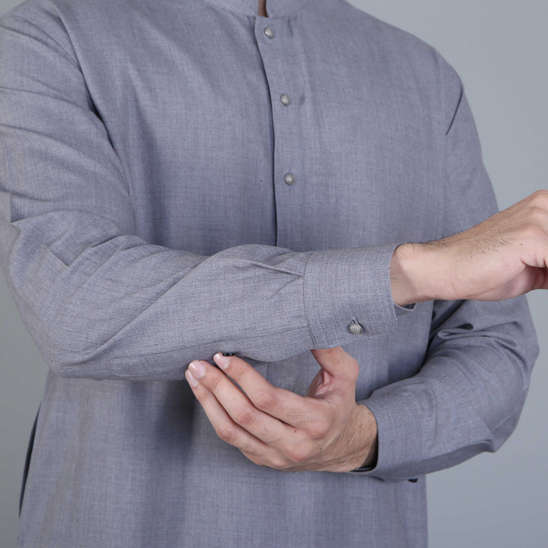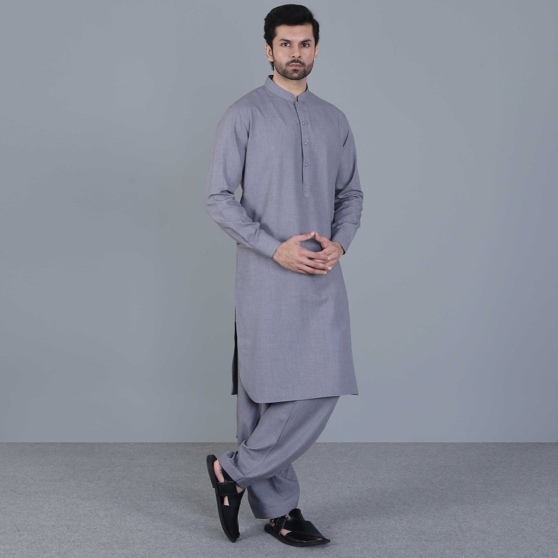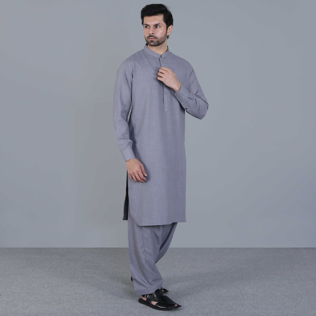 The Venus grey Shalwar Qameez is a striking blend of modern style and timeless elegance. Featuring a chic banned collar and tasteful buttons, this outfit is designed to make a statement. Crafted from premium wash-and-wear winter fabric