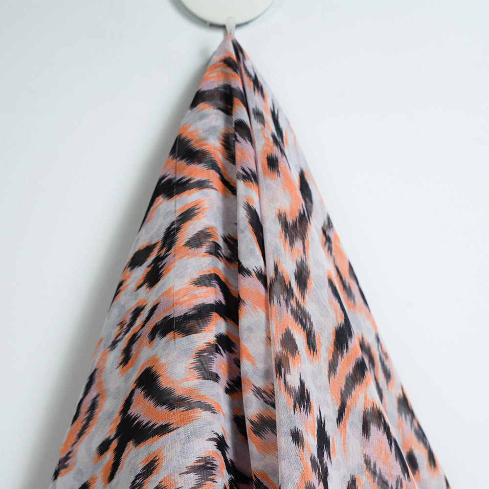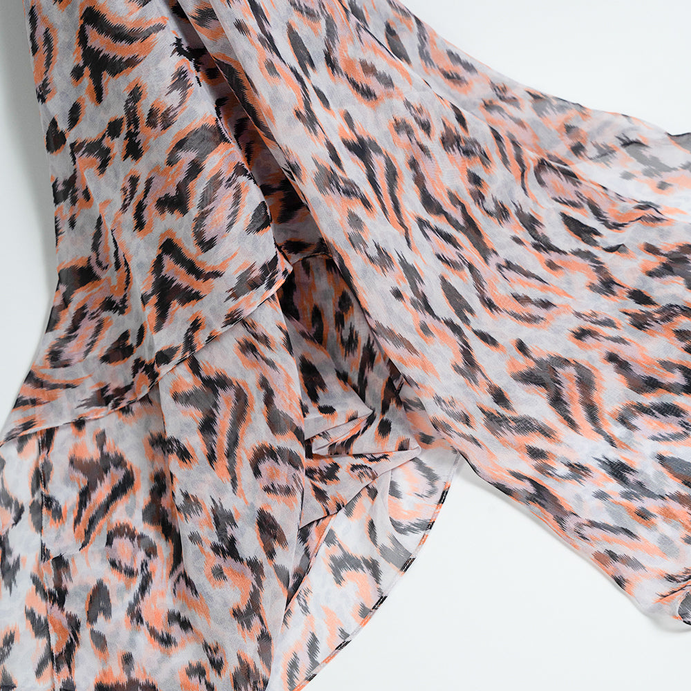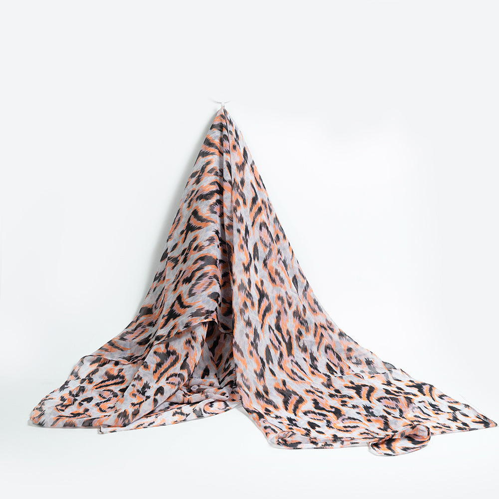 Make a bold statement with this chiffon scarf featuring a vibrant print design. Lightweight and breathable, the soft chiffon fabric drapes effortlessly, adding a stylish flair to your outfit. With its mix of peach, black, and white tones.