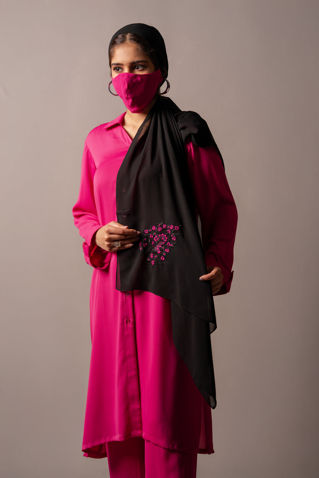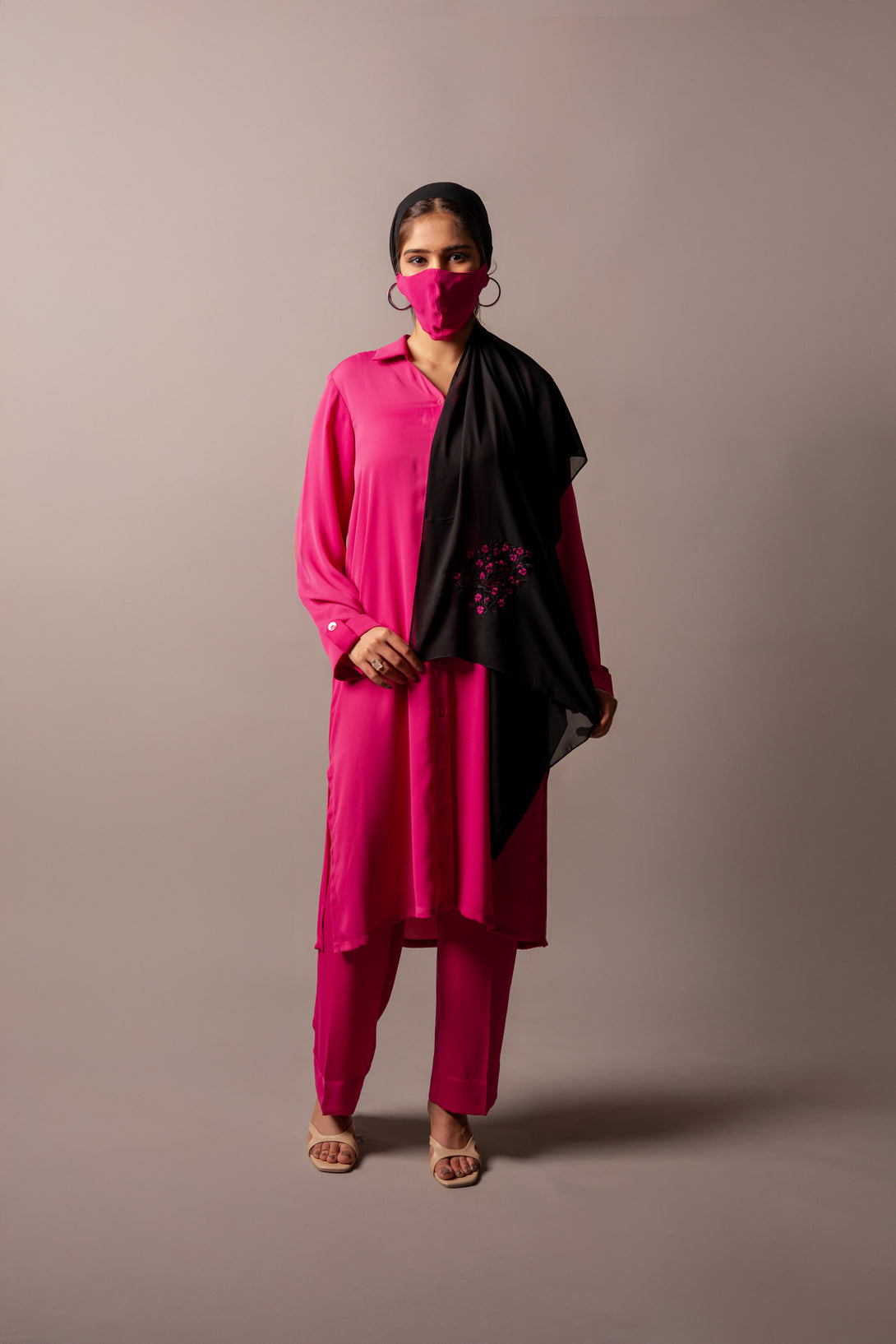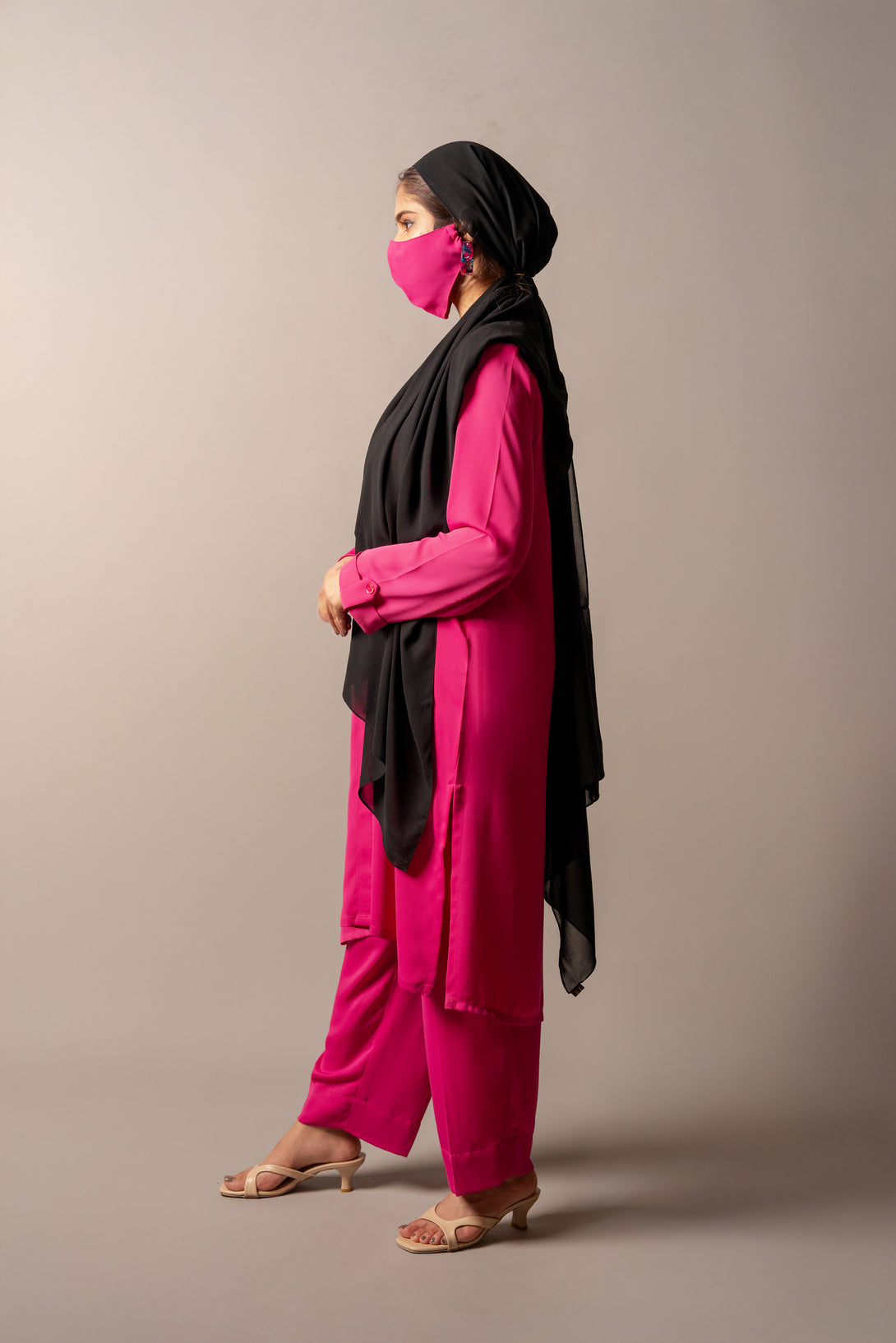 Elevate your everyday elegance with this vibrant fuchsia pink chiffon co ord set, designed for both comfort and chic appeal. The outfit features a flowy, button down long Kurta with a V neckline and full sleeves.