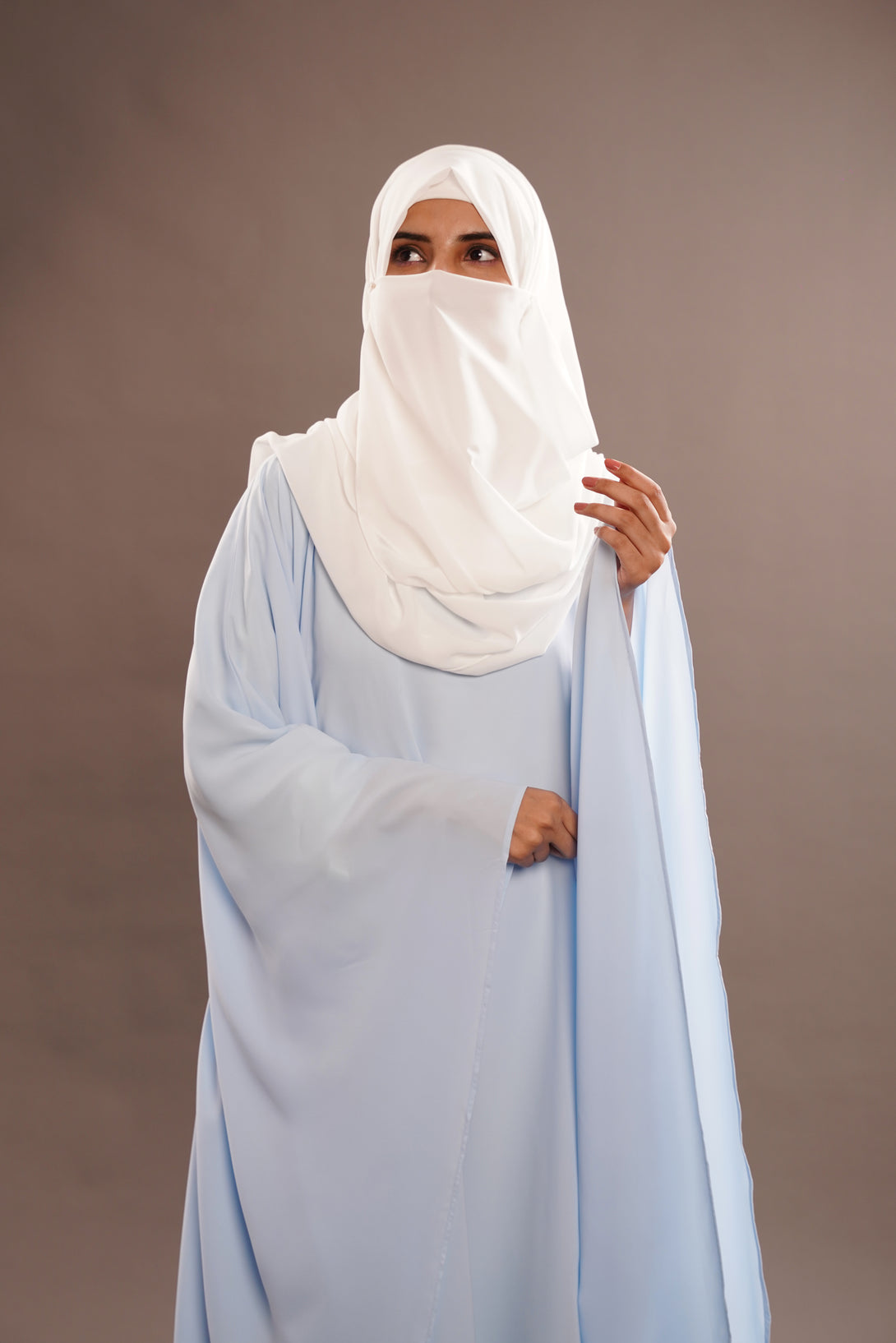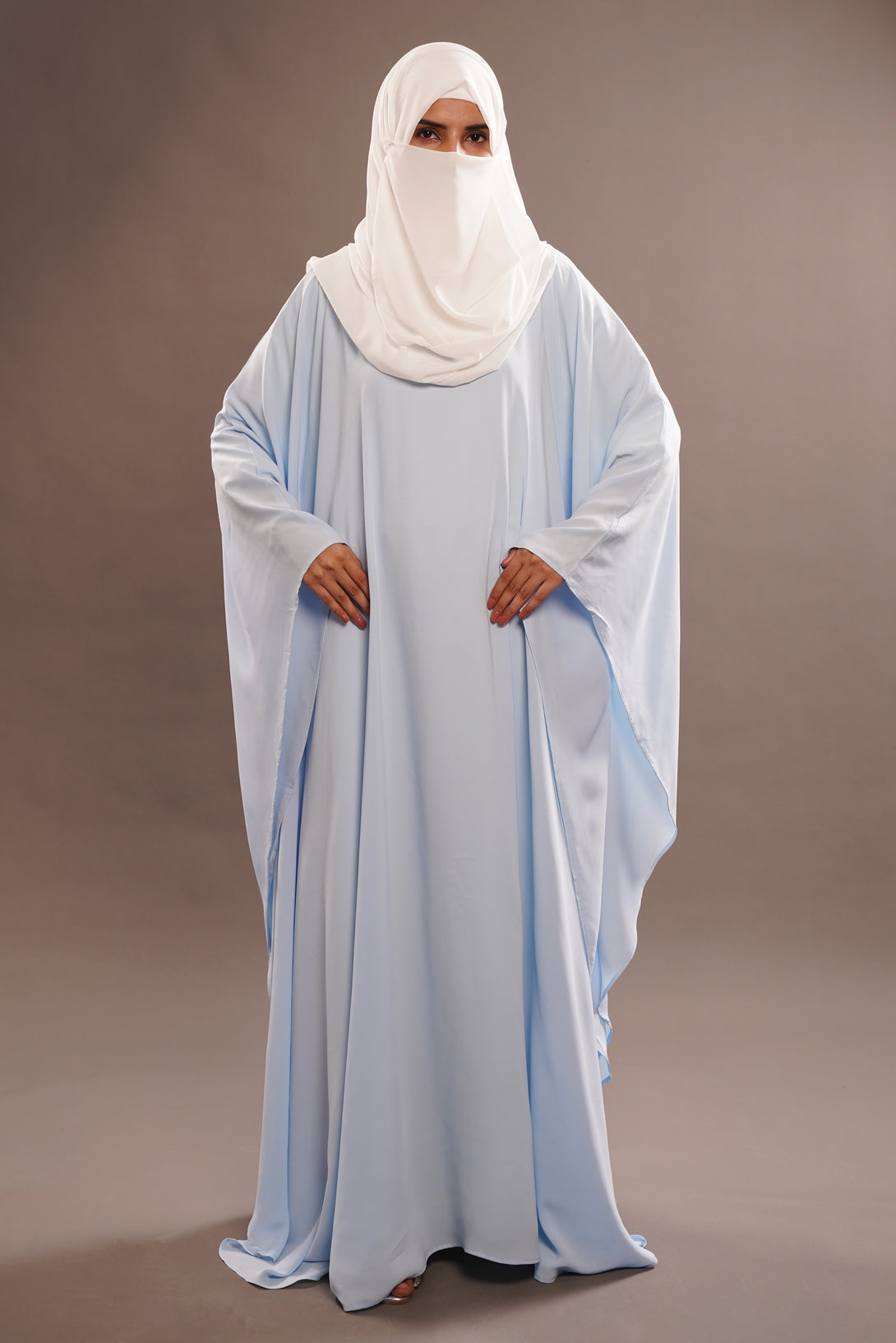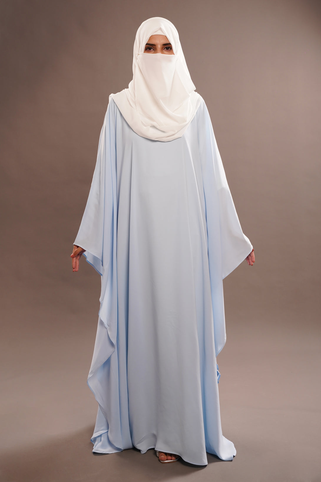 Like a clear sky on a calm day, this butterfly abaya drapes in serene blue waves, offering unparalleled elegance and a feeling of tranquil grace. Without scarf.